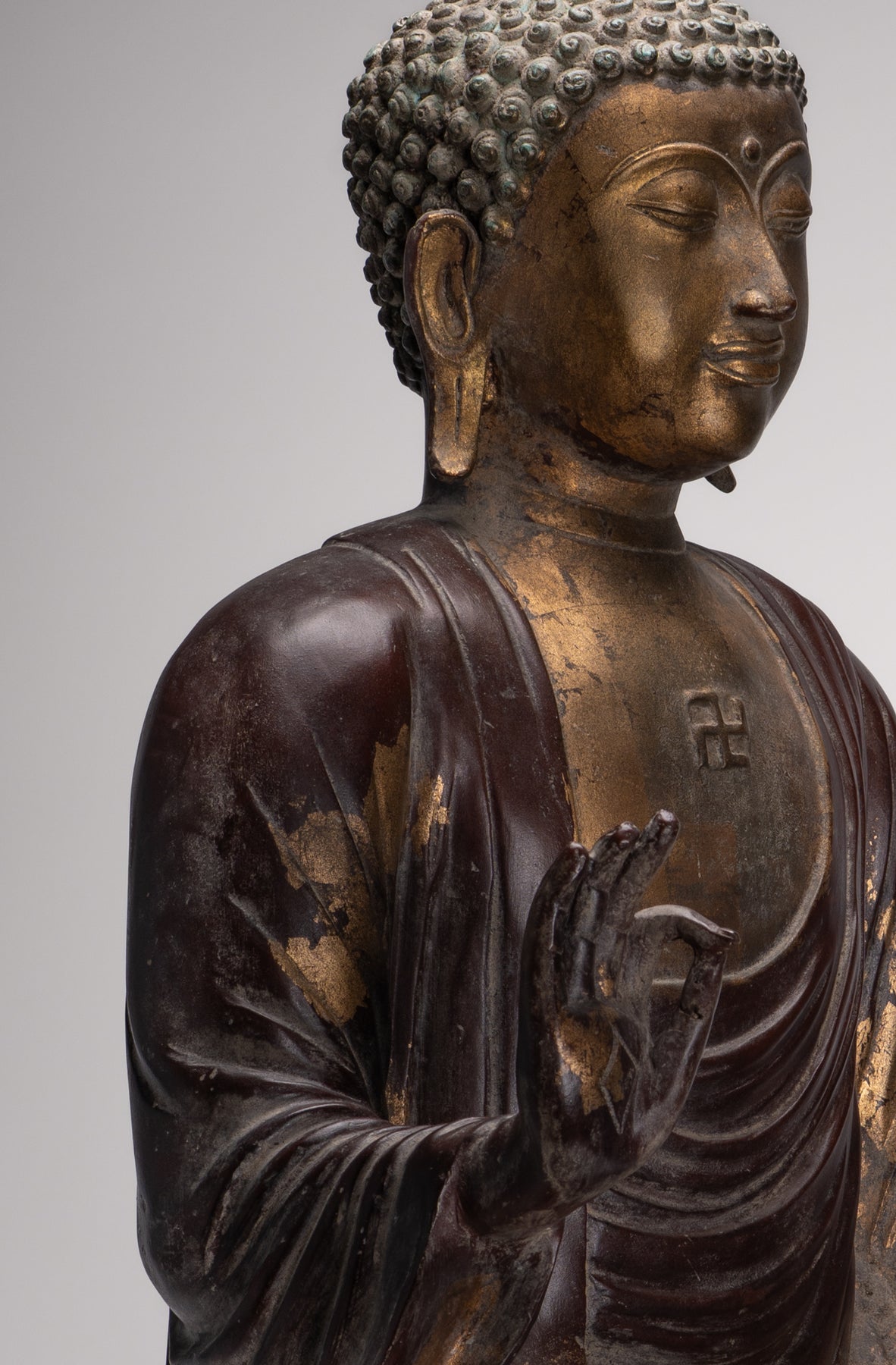 Sentado pacíficamente con un atuendo monástico simple, los labios de Buda se buscan juntos y sus ojos están abatidos en una meditación profunda. Su gran Ushnisha simboliza su alto nivel de desarrollo espiritual.