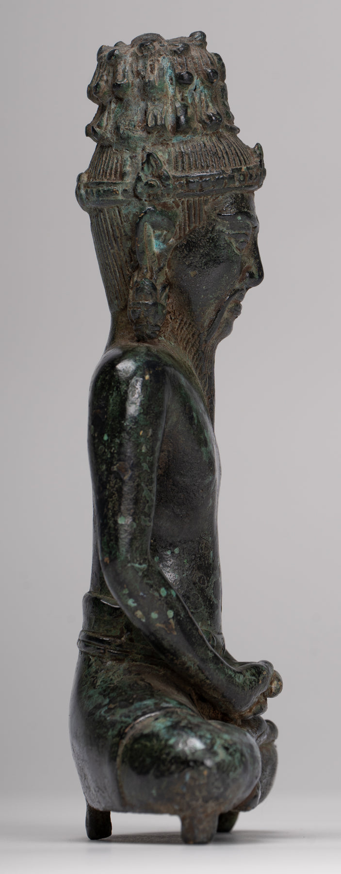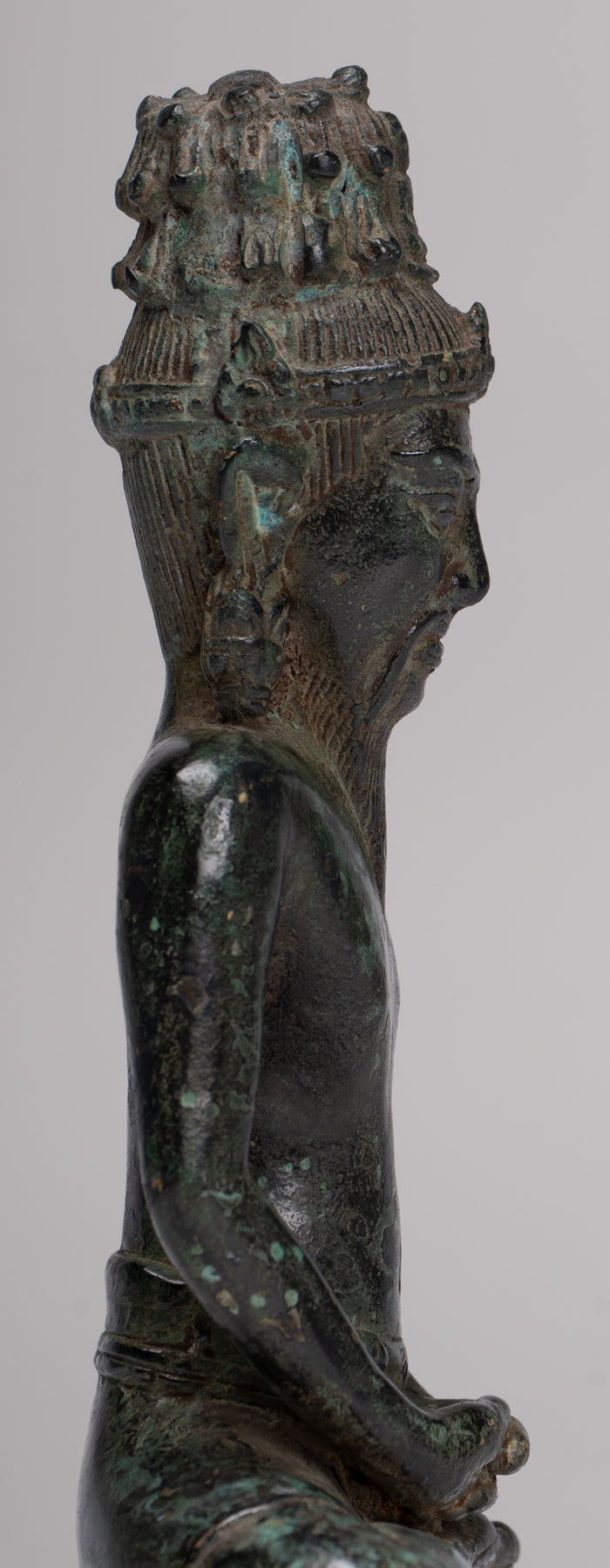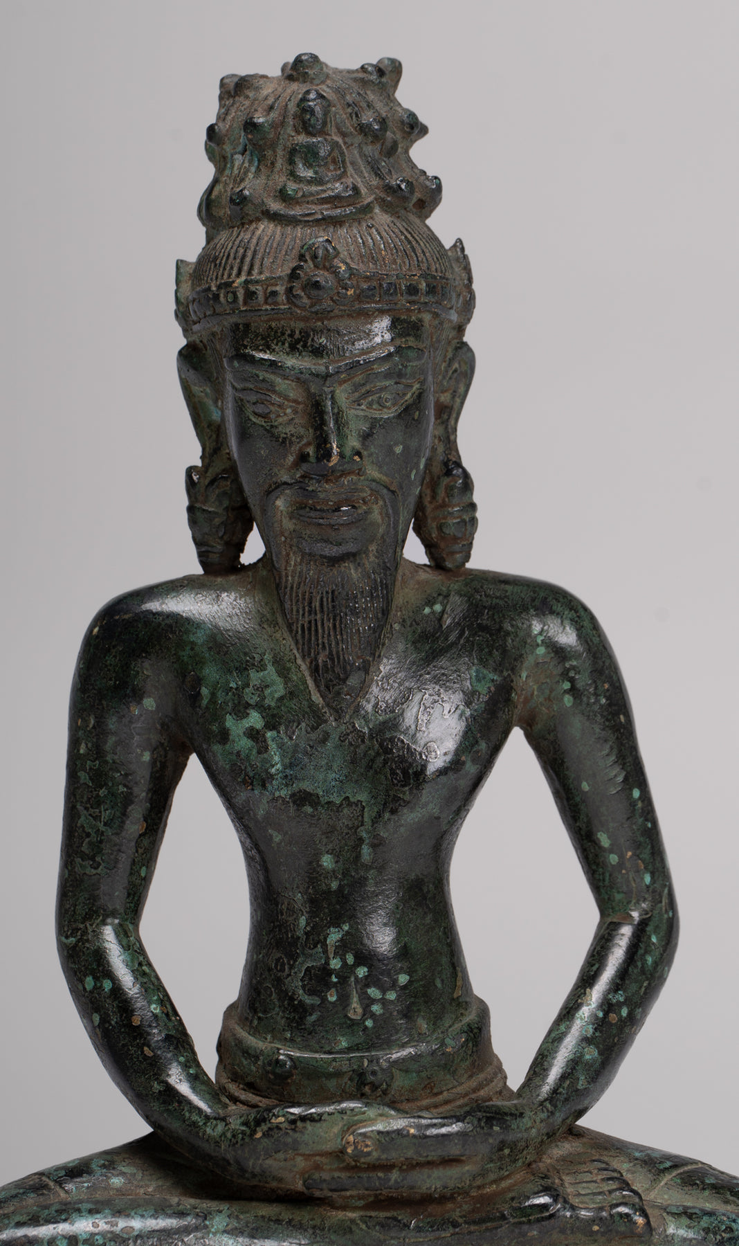 La cara con características sabias está coronada por un tocado cilíndrico adornado con un Buda Amitabha meditante.