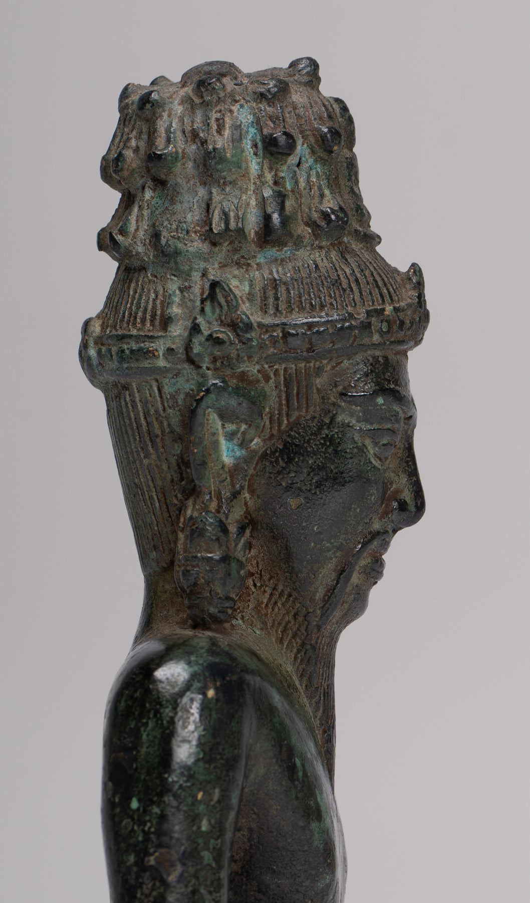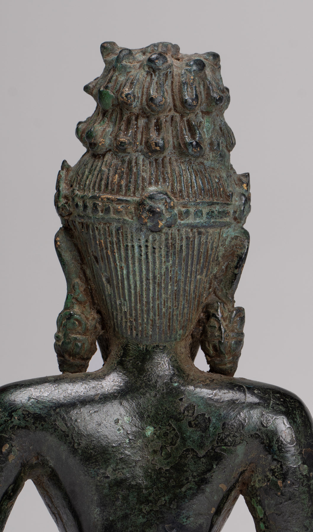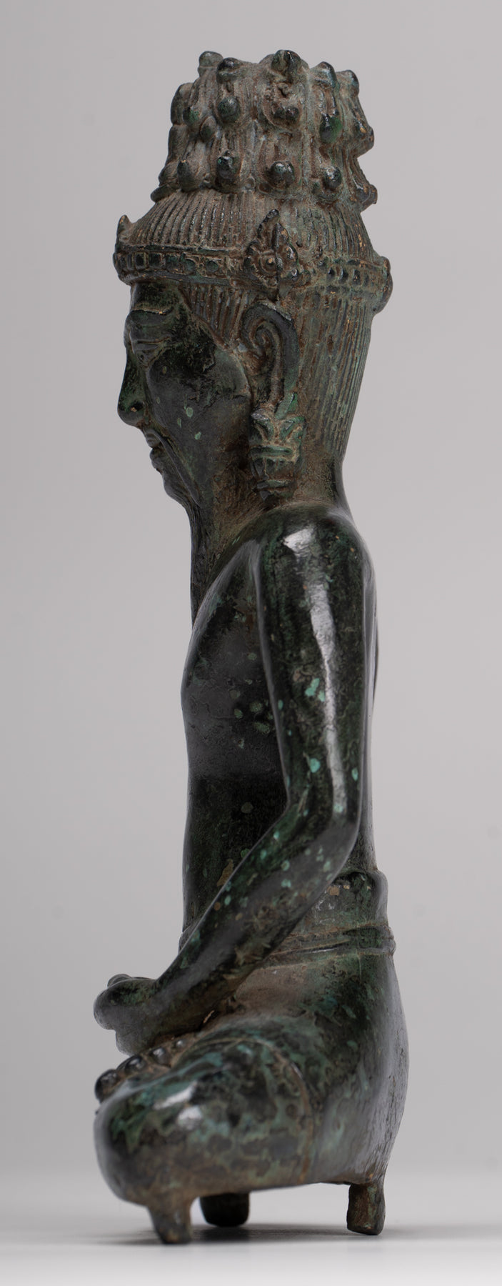 La cara con características sabias está coronada por un tocado cilíndrico adornado con un Buda Amitabha meditante.