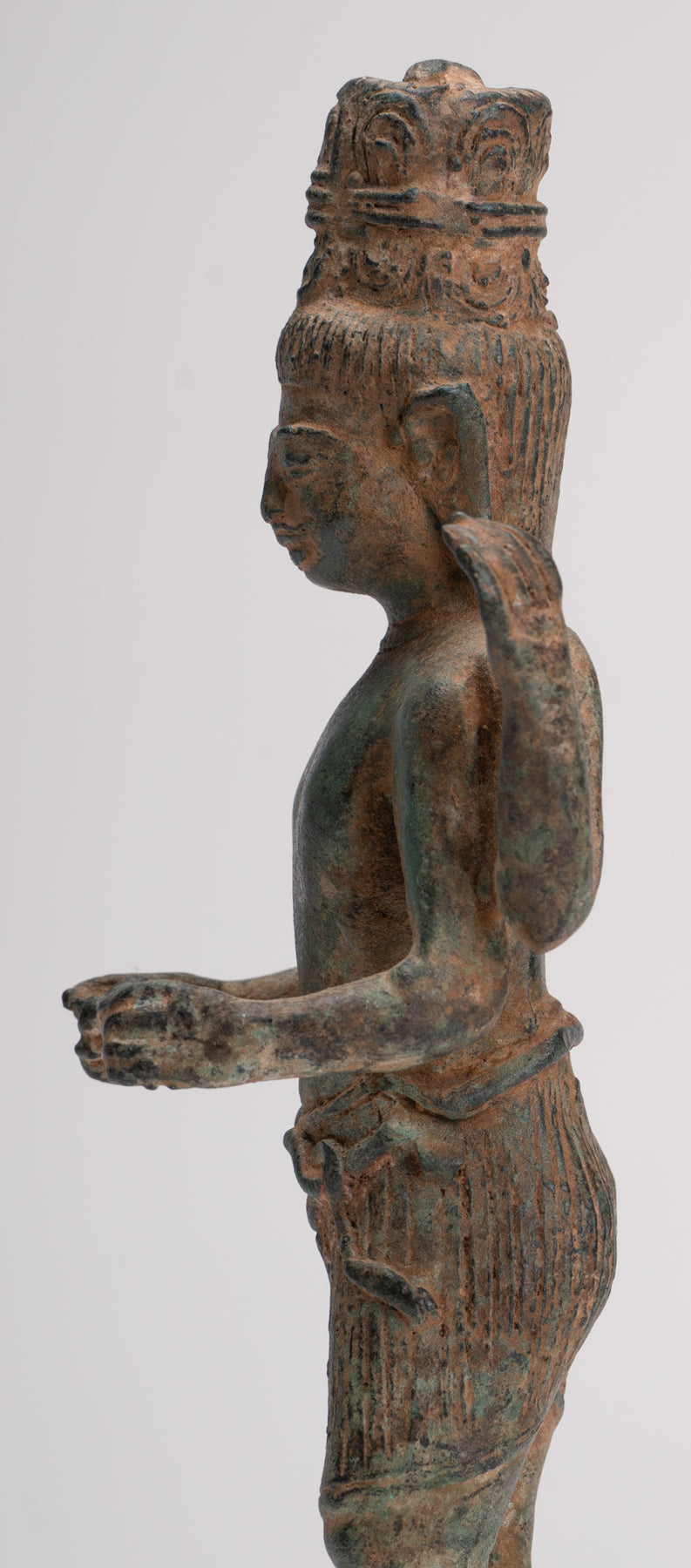 Un antiguo Vishnu de bronce jemer de estilo Phnom Da anterior a Angkor del siglo VII, la deidad india de la creación. El divino preservador hindú y protector de la vida humana, un papel que proporcionaba analogías naturales con la realeza terrenal para los jemeres.