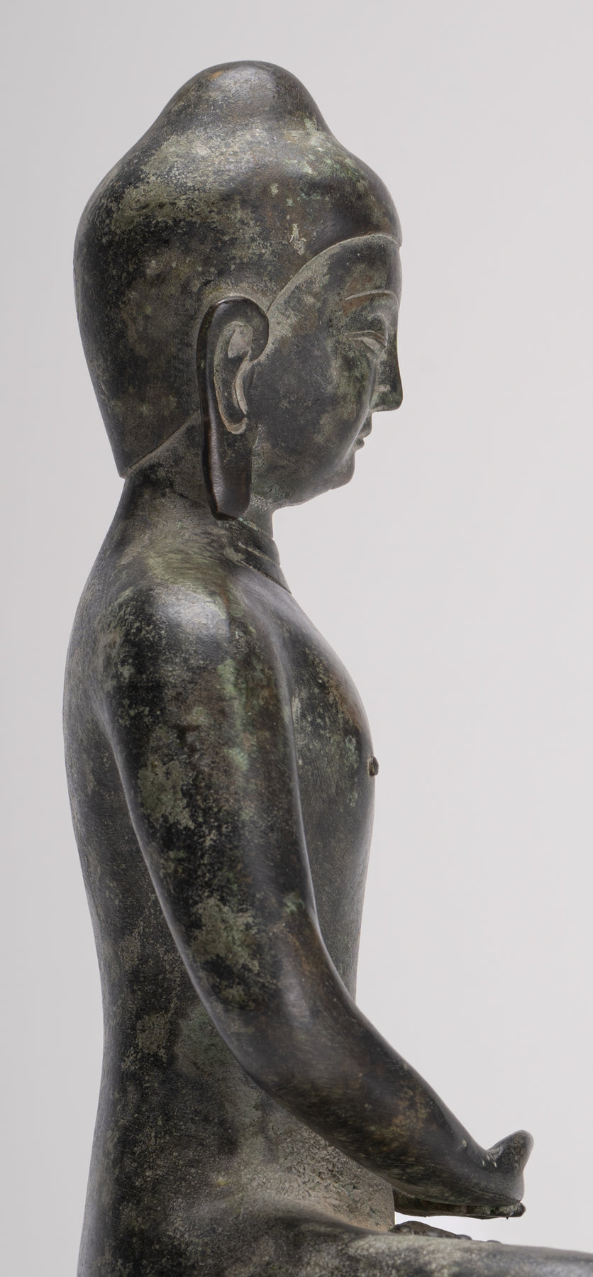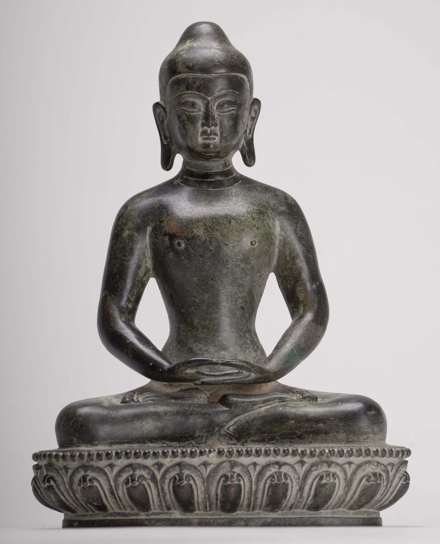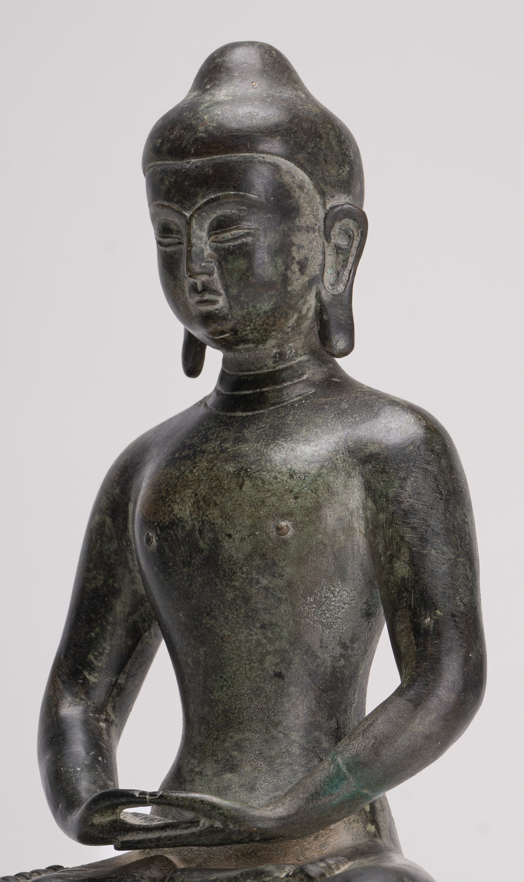 Como es tradicional, el Buda de la Meditación se representa aquí en una postura sentada, con ambas manos colocadas en el Dhyana Mudra, donde la mano derecha descansa sobre la mano izquierda, con los pulgares tocándose suavemente, formando un sutil triángulo o círculo. La espalda del Buda está recta y la mirada baja, lo que significa profunda concentración y reflexión interior.