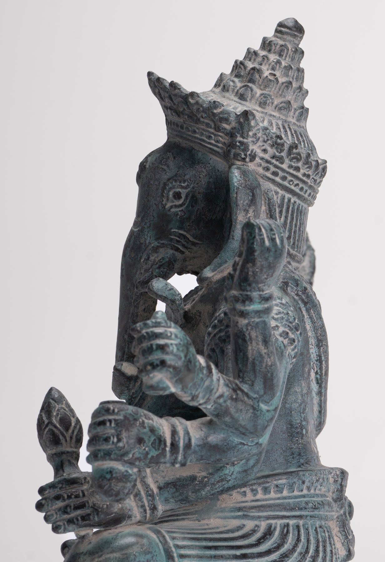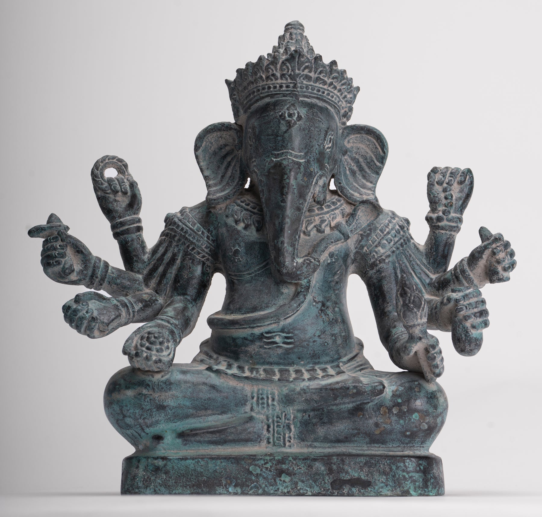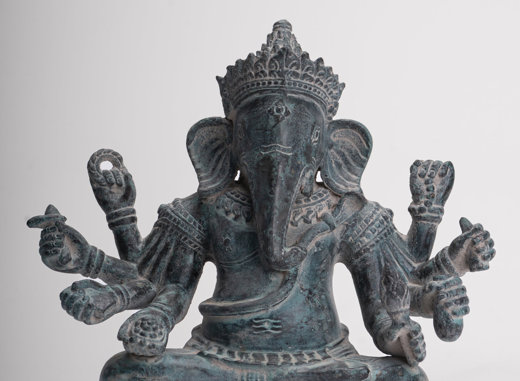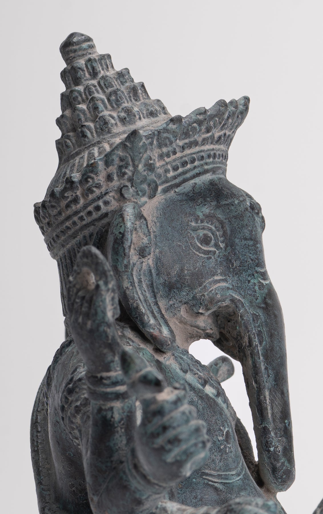 Un Ganesha antique en bronze assis de style khmer du 12ème siècle, style Angkor. Ganesha est assis sur un simple socle, les jambes croisées avec un regard serein.