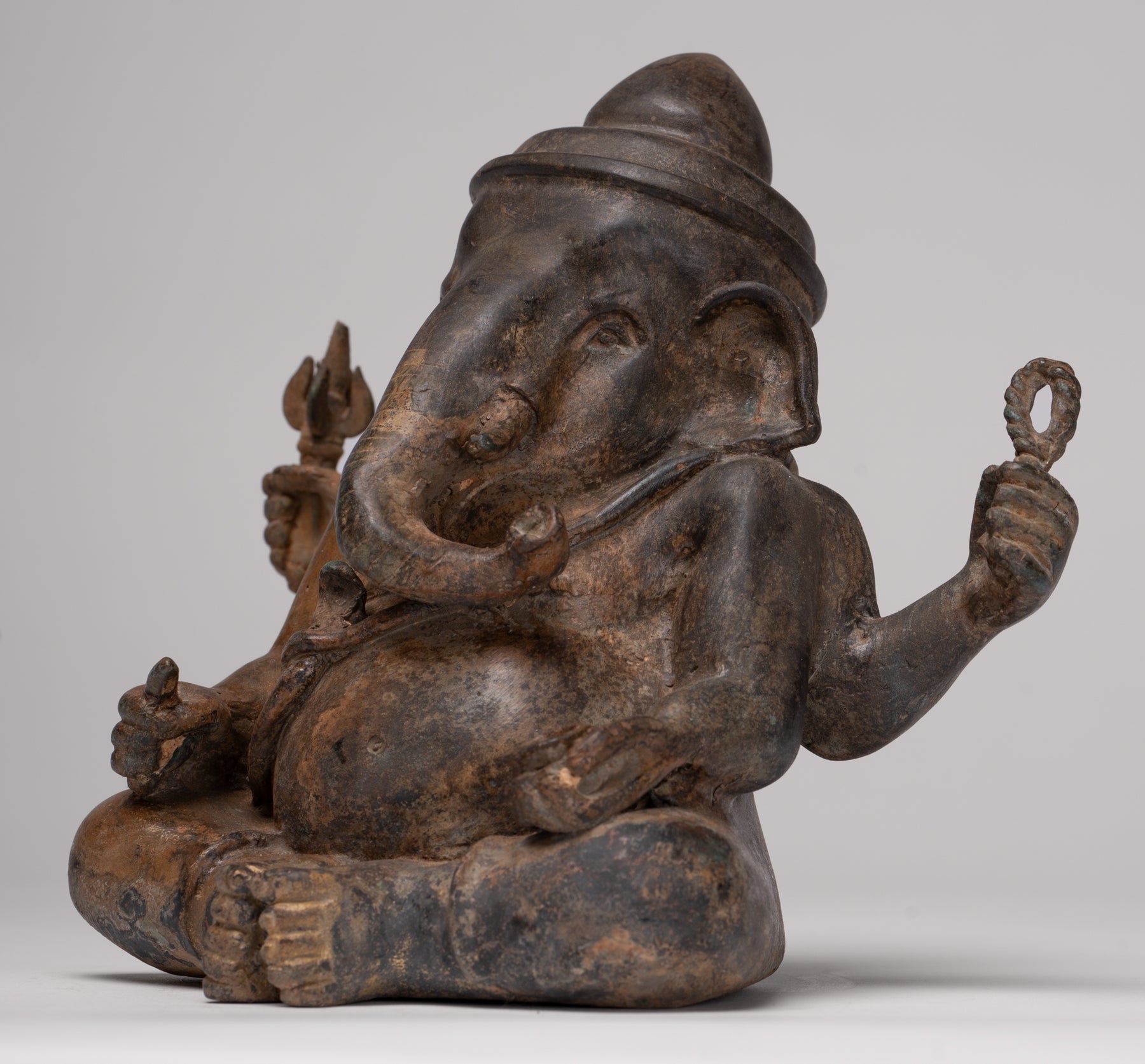 Ganesha Statue - Antique Thai Style Bronze Seated 4-Arm Ganesha Statue - 16cm/6"