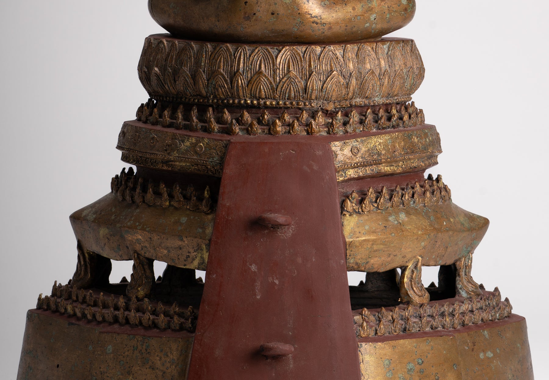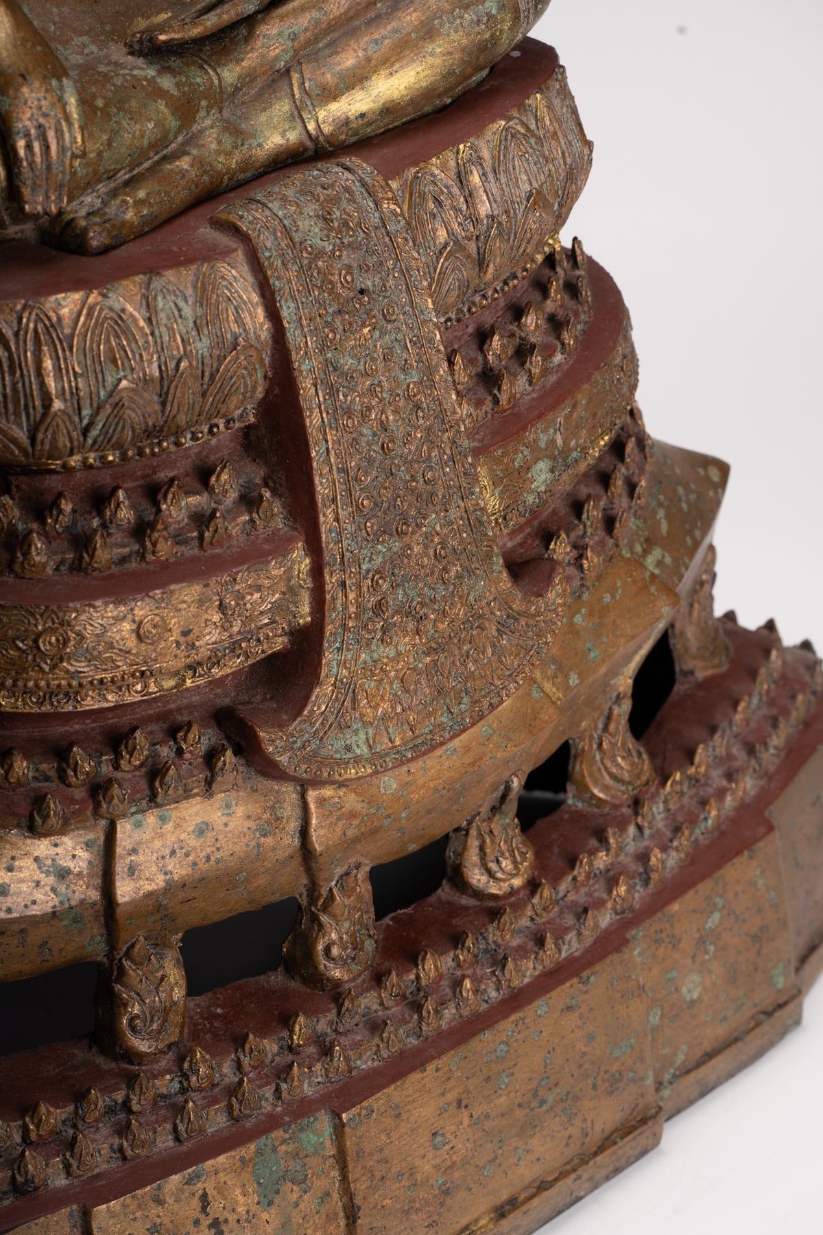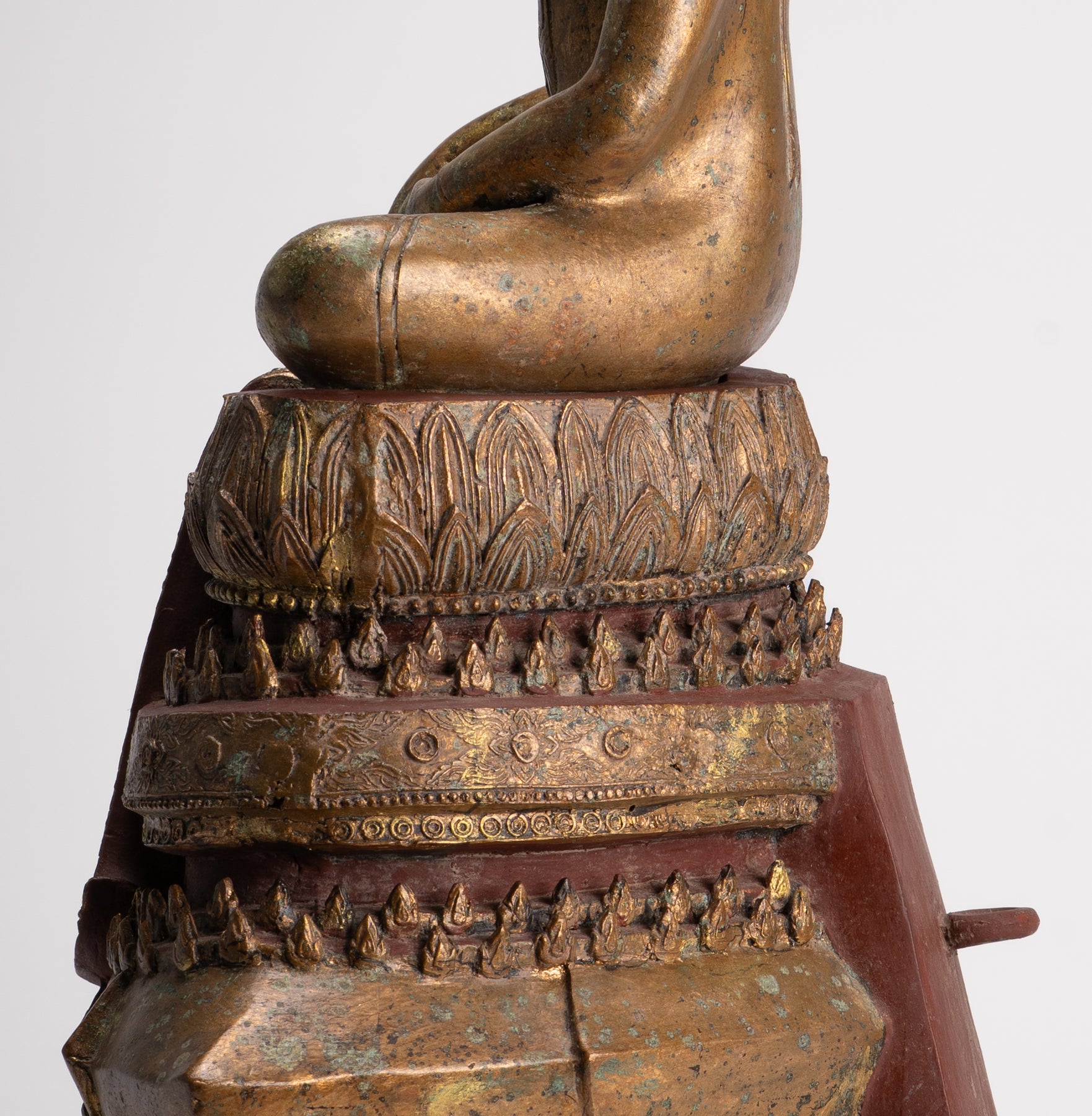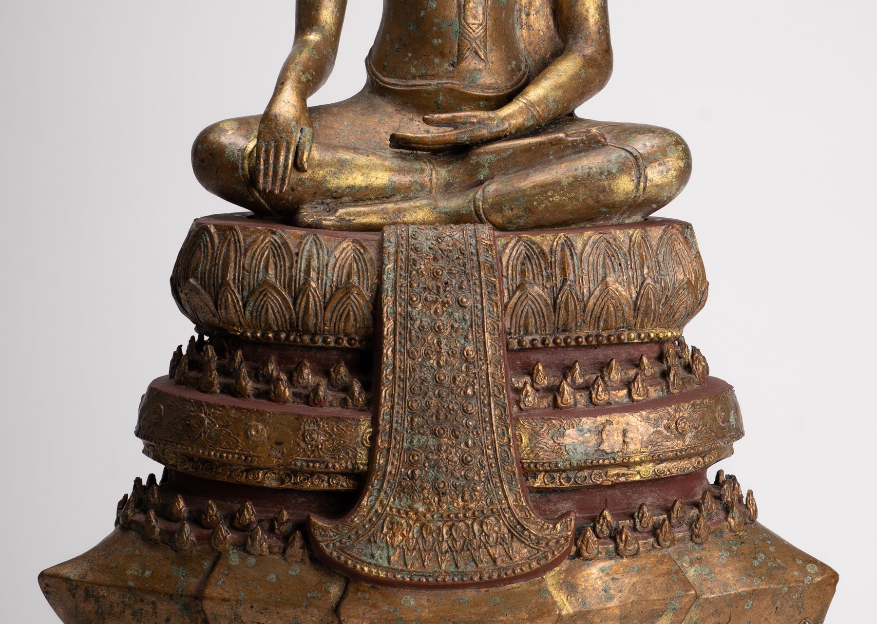 La sculpture est formée de deux parties distinctes mais imbriquées. La statue de Bouddha et le trône sur lequel il est assis.