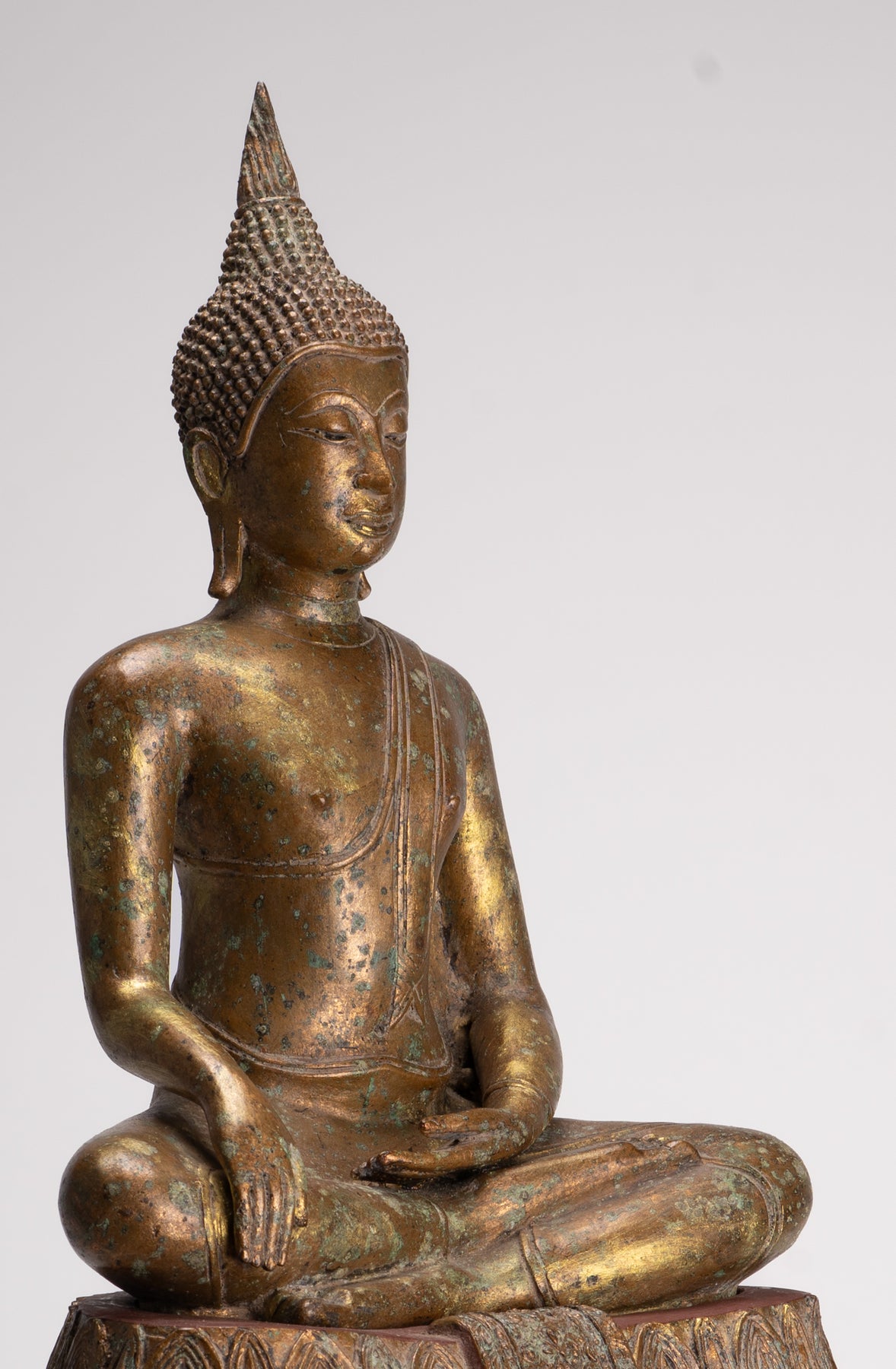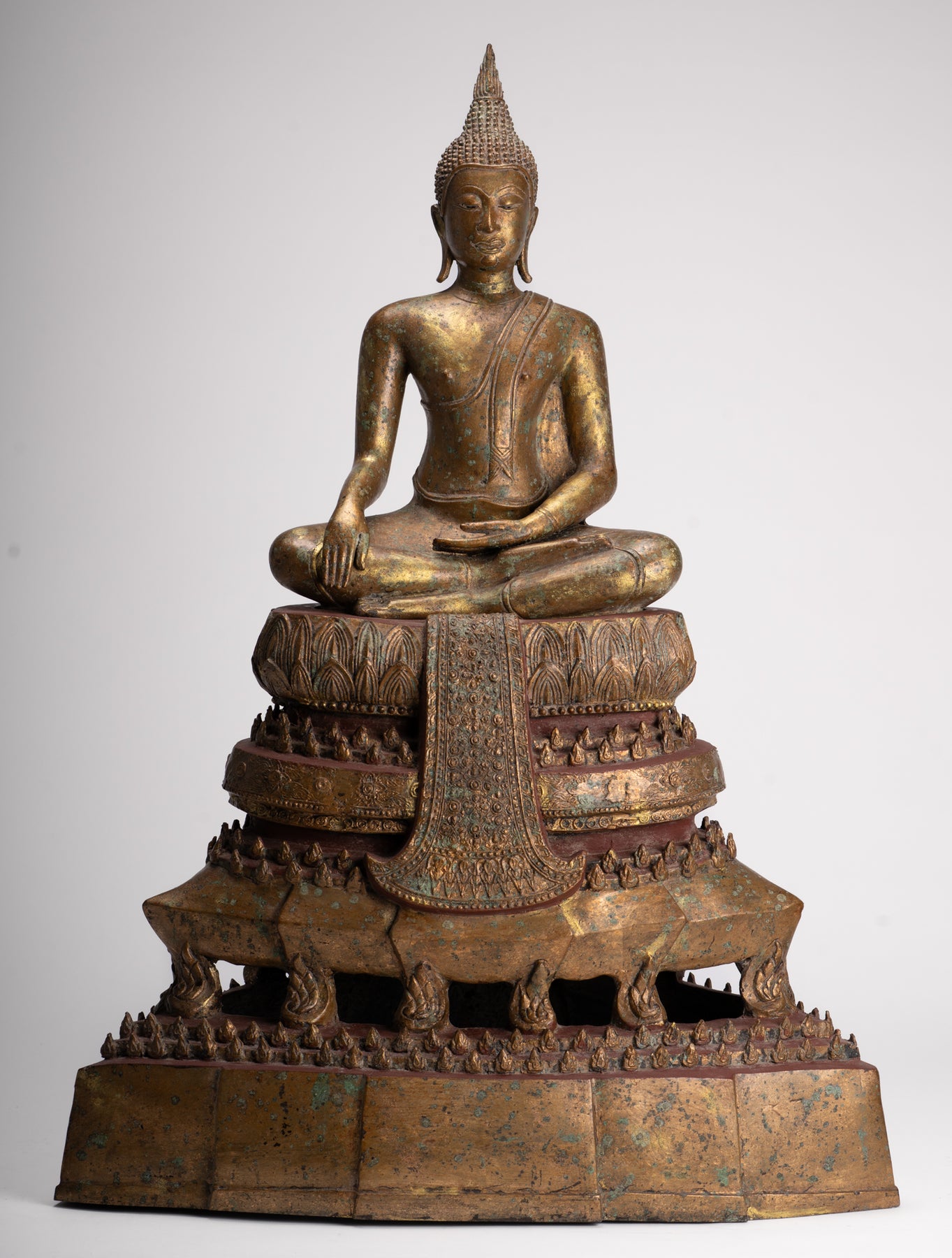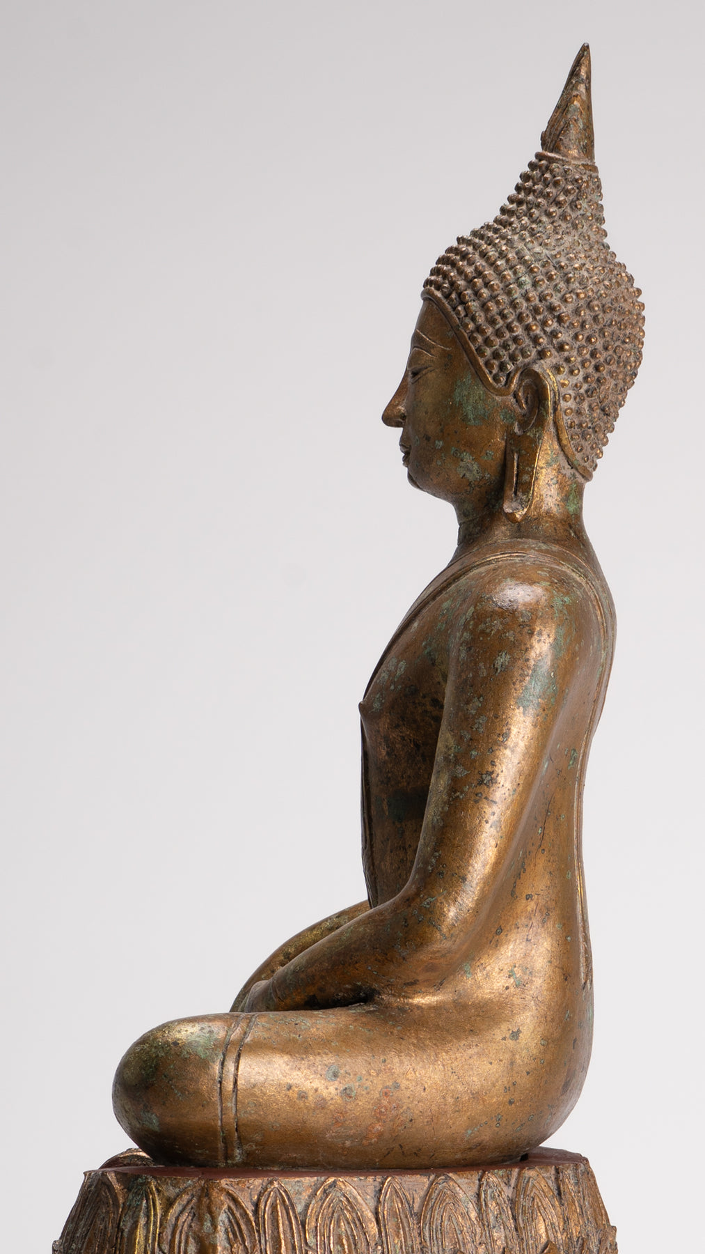 L'Empire Sukhothai est célébré pour ses réalisations artistiques remarquables qui captivent encore aujourd'hui les observateurs. Les sculptures et les statues de cette époque illustrent un sentiment d'élégance et de sérénité, reflétant l'essence spirituelle du bouddhisme. Comme pour ce Bouddha, l'art de la période Sukhothai occupe une place distincte dans la tradition artistique plus large de l'Asie du Sud-Est, caractérisée par des formes gracieuses, des détails complexes et un accent sur la représentation spirituelle.