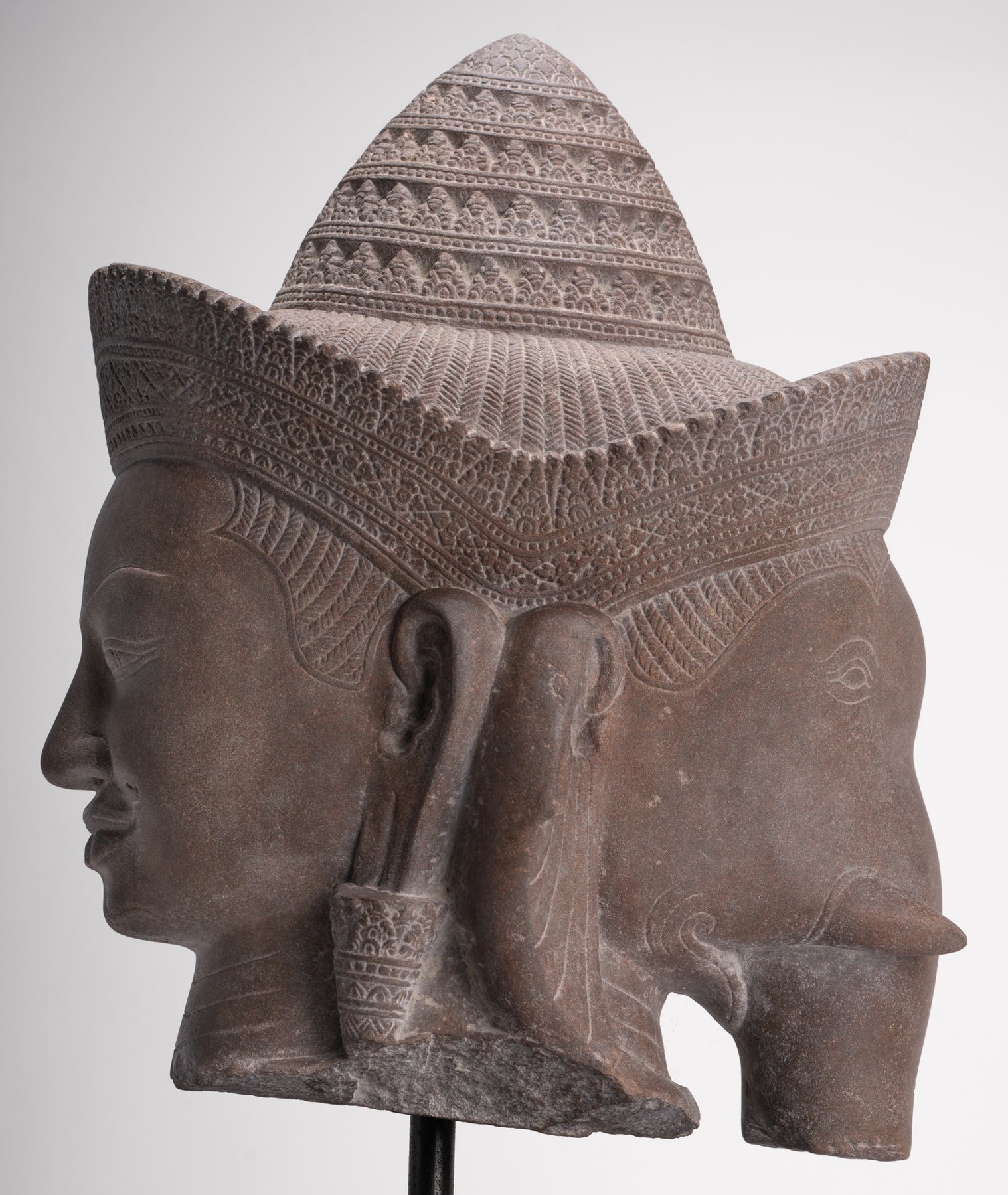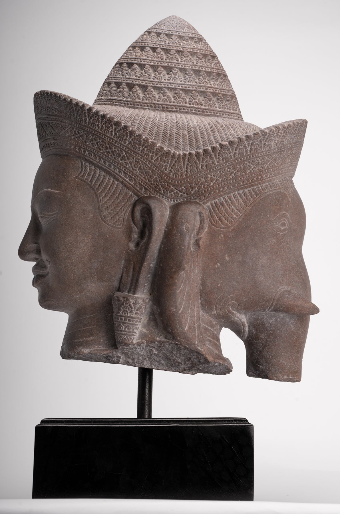 Une tête double élégante et extrêmement rare de Shiva et Ganesha dans le style cambodgien, pré Angkor, Banteay Srei du 10ème siècle. Le pouvoir émanant de cette image convaincante de Shiva et de Ganesha caractérise le style Banteay Srei.