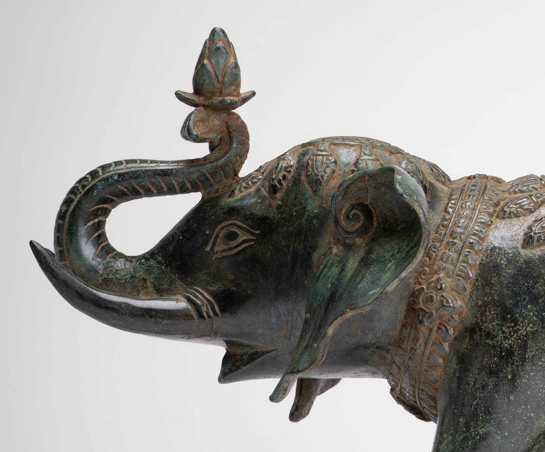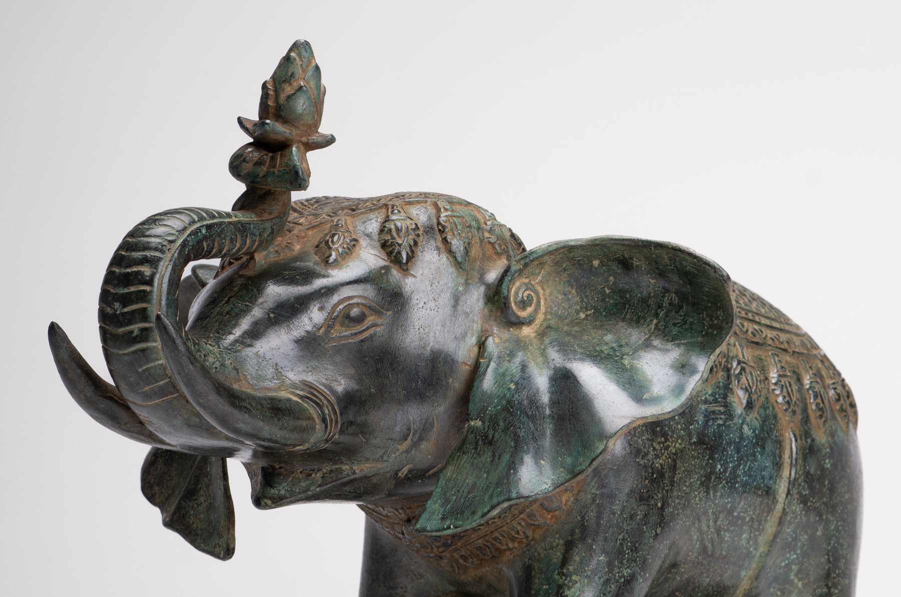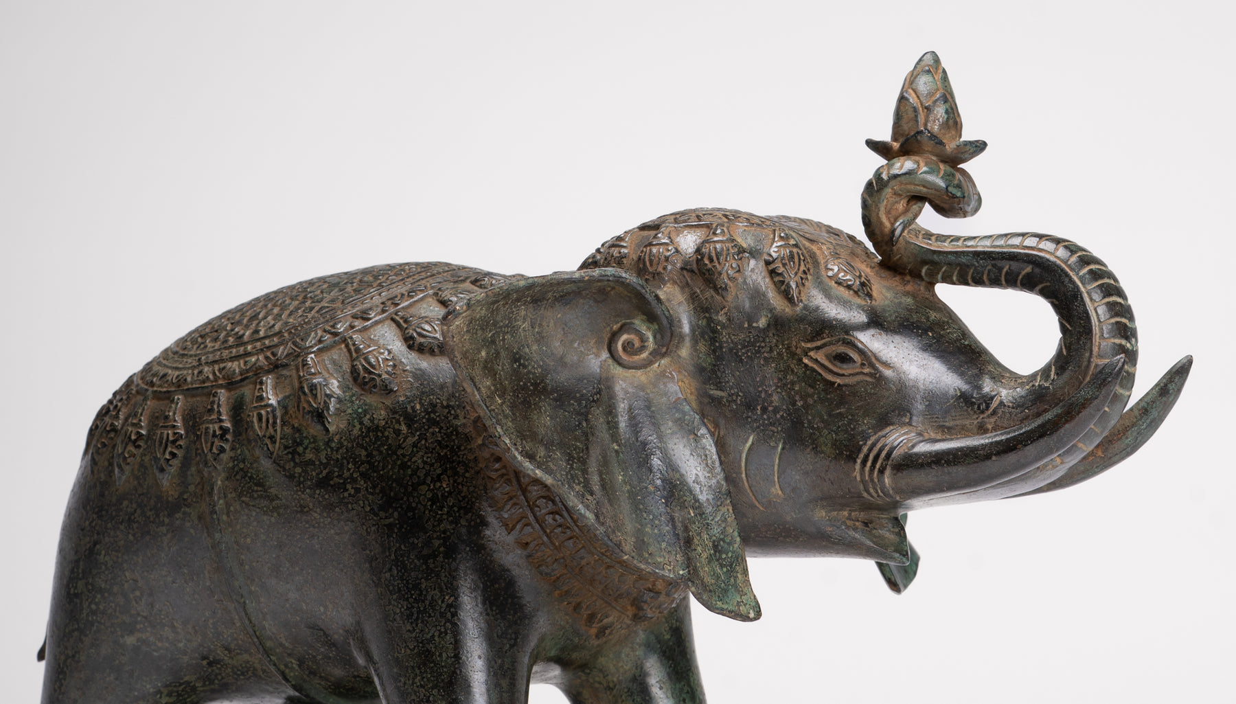 Une statue d'éléphant en bronze de style khmer antique. L'éléphant est debout, claironnant, dans un geste de bonne volonté.
