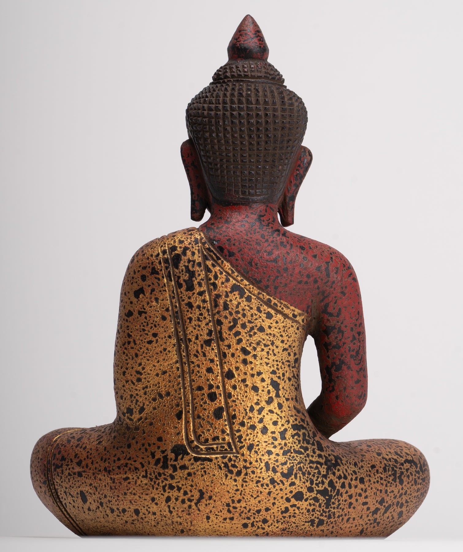 Comme le veut la tradition, le Bouddha de méditation est représenté ici dans une posture assise, les deux jambes croisées en position demi-lotus. Les mains sont placées dans le Dhyana Mudra, où la main droite repose sur la main gauche, les pouces se touchant doucement, formant un triangle ou un cercle subtil. Le dos du Bouddha est droit et le regard est baissé, ce qui signifie une profonde concentration et une réflexion intérieure.