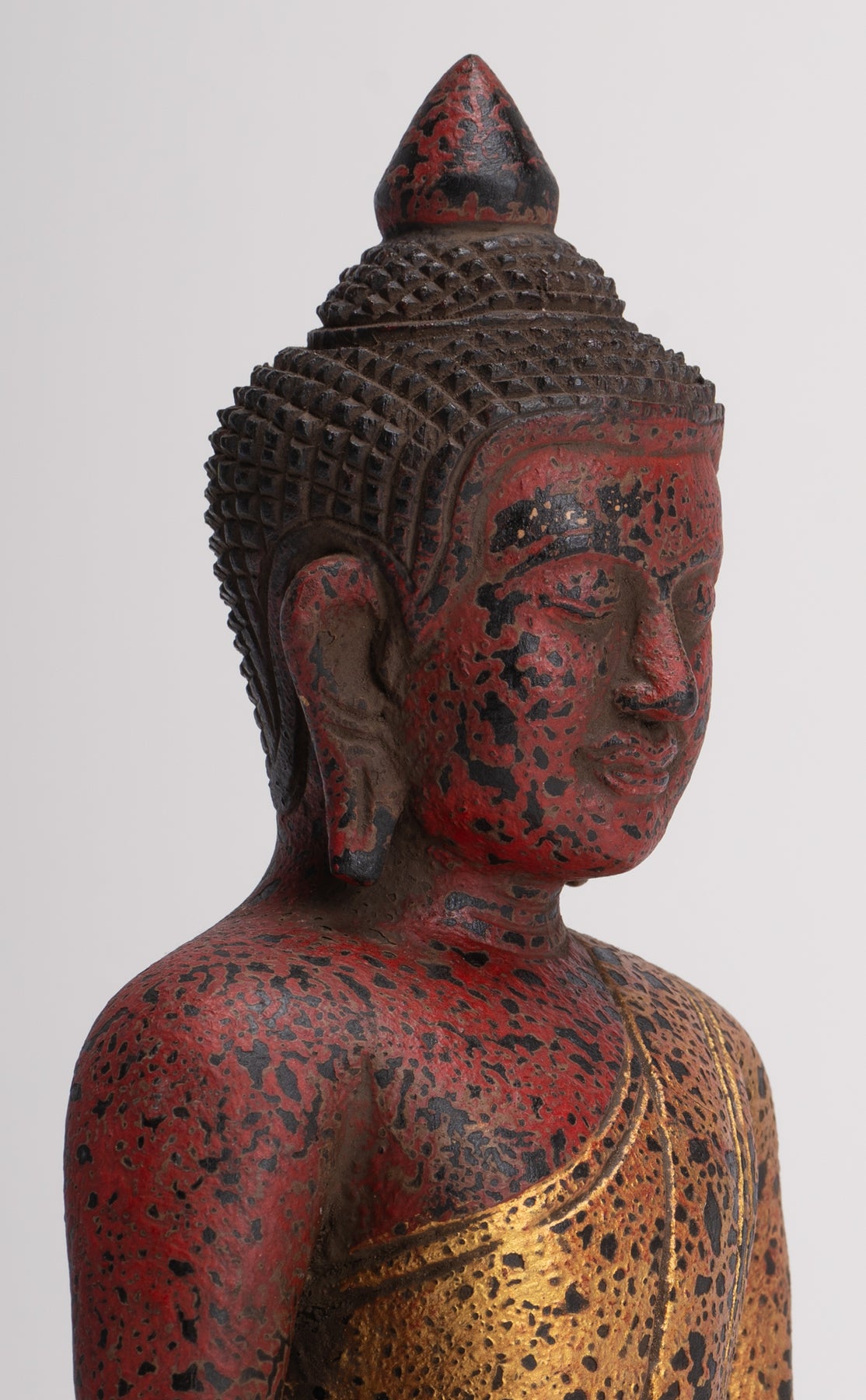 Le Bouddha présente un visage de forme ovale, avec des yeux baissés en forme d'amande. Les sourcils courbés se rejoignent au-dessus d'un nez proéminent, et les lèvres profilées, à l'expression exaltée, semblent souriantes.