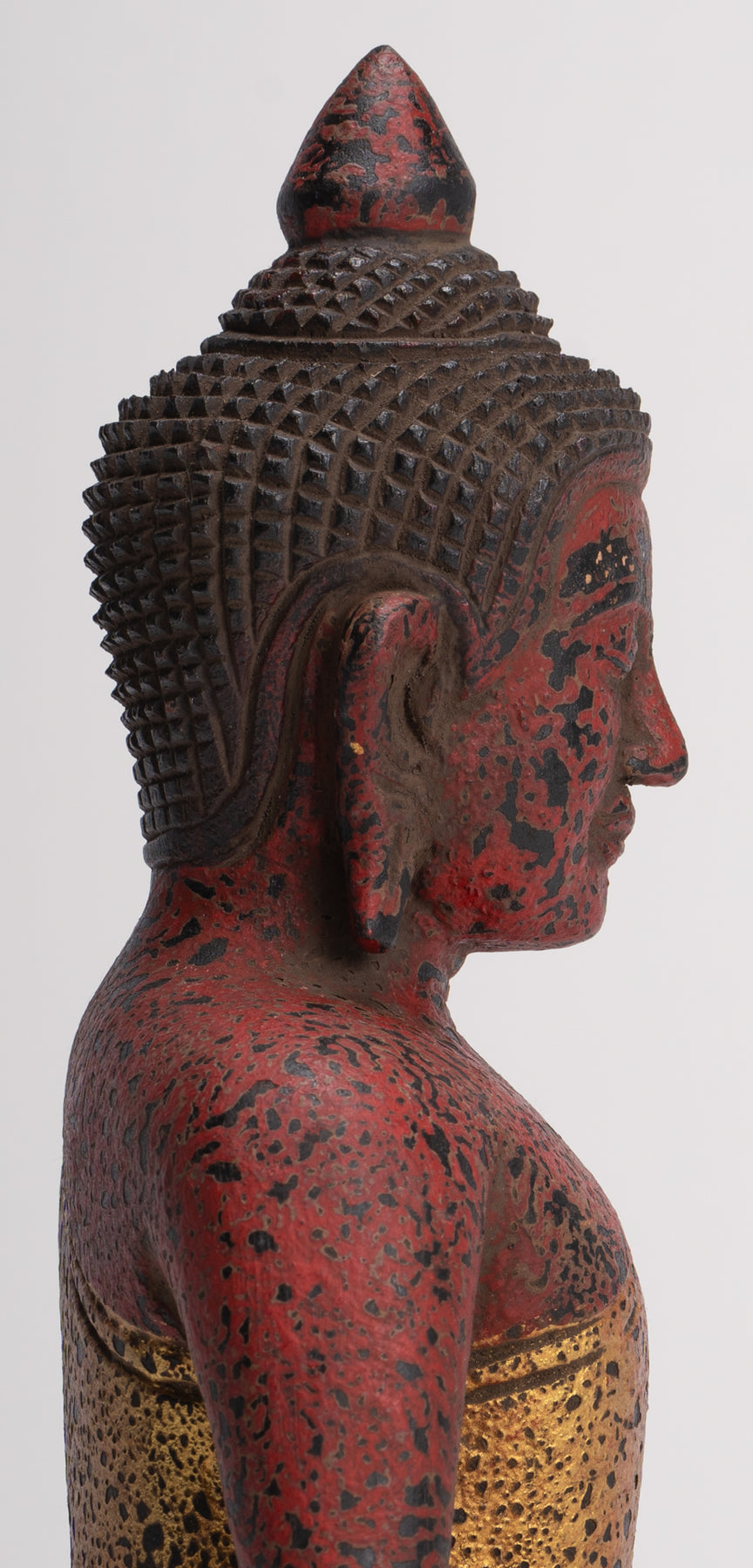 Le profil du corps présente des épaules larges et une taille fine, recouvert d'une robe Sanghati portée en diagonale sur l'épaule gauche, et est orné d'un rabat fortement plissé drapé jusqu'au nombril. L'épaule droite est laissée nue.