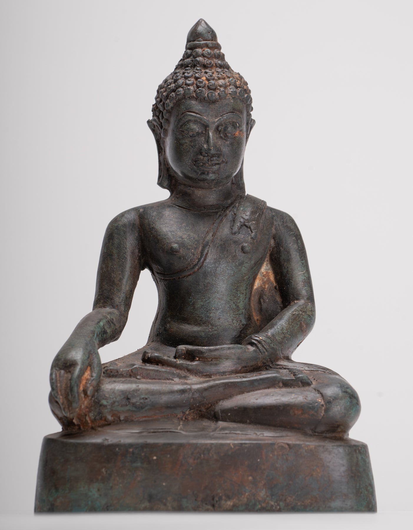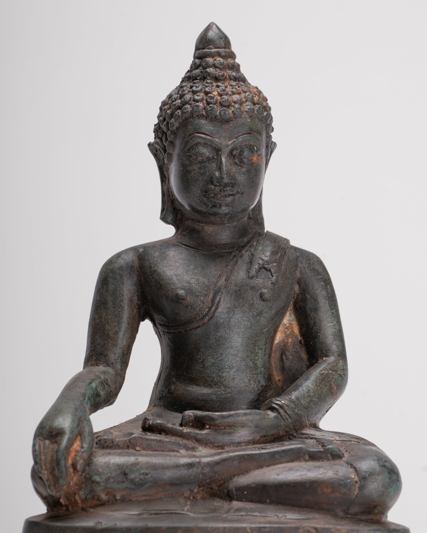 Le Bouddha est assis, à Virasana, symbole de la sérénité des jambes croisées, avec les deux mains dans le Bhumisparsa ou «appelant la Terre à» Mudra.