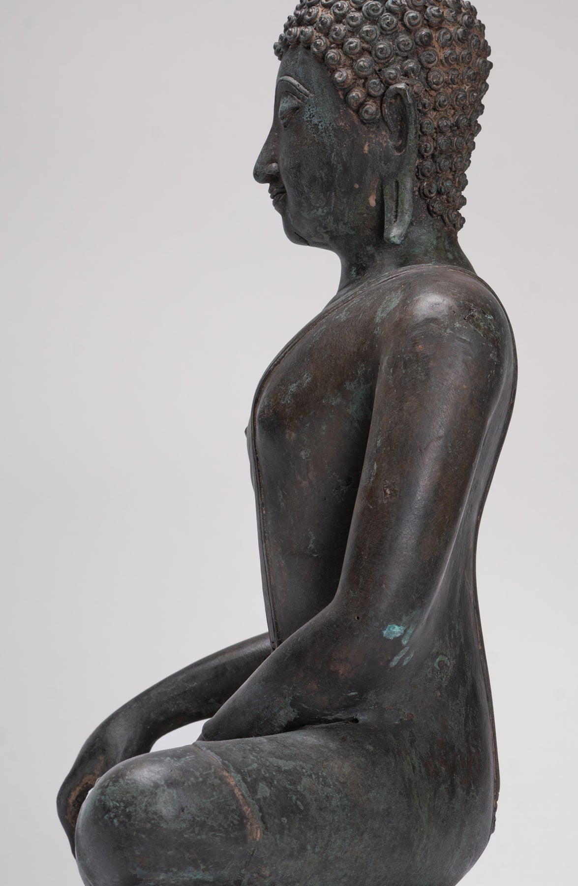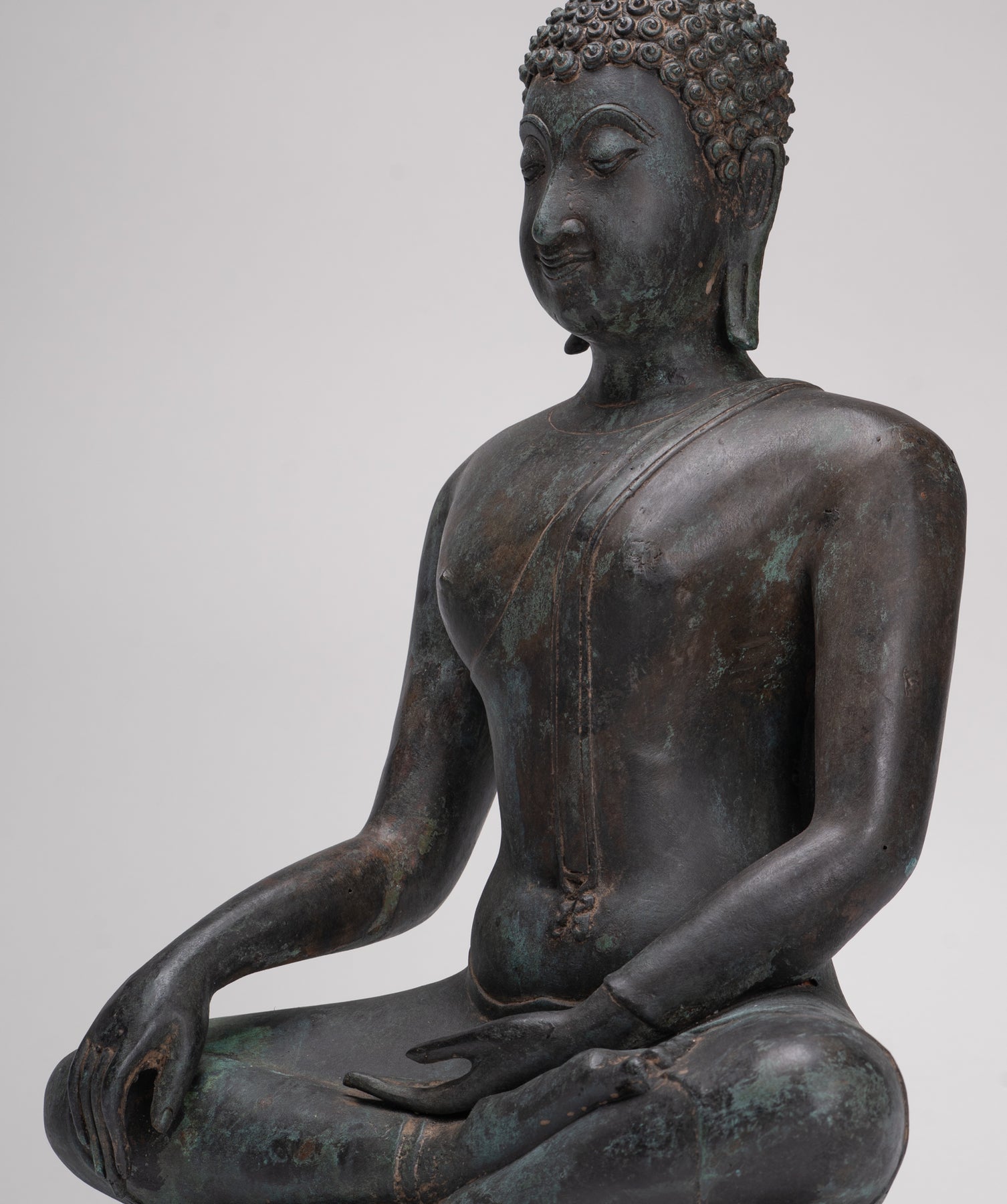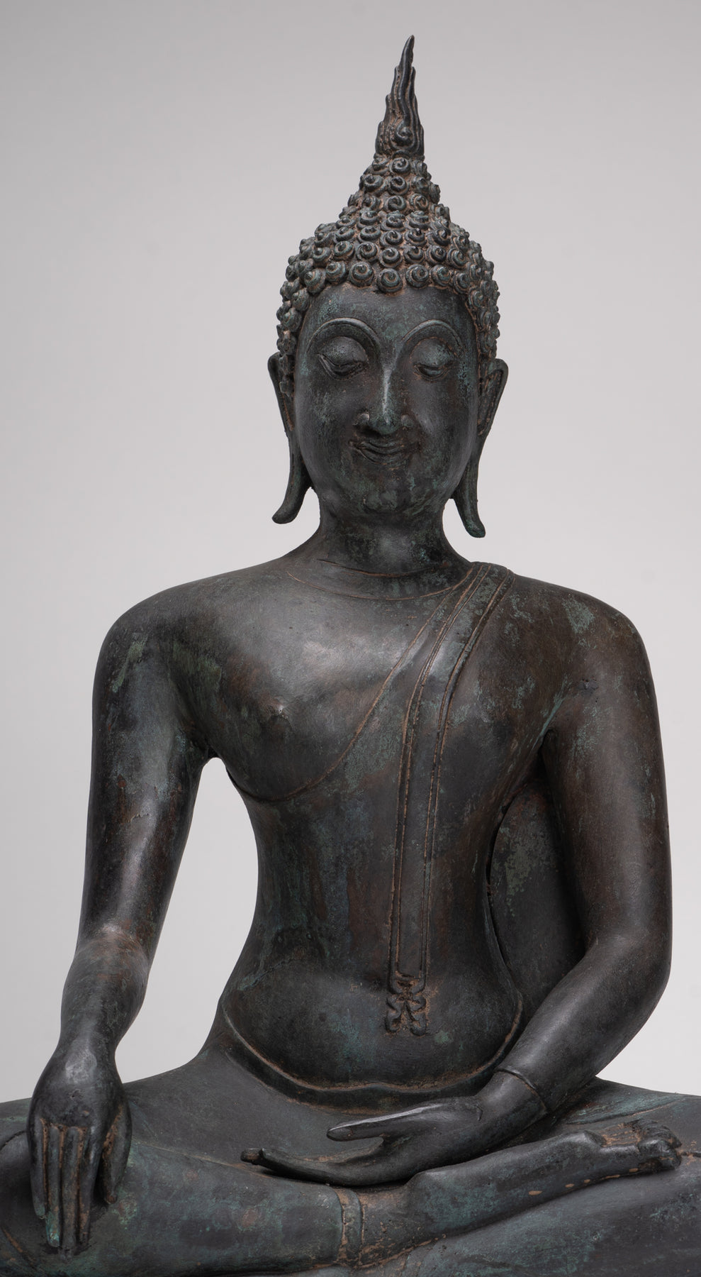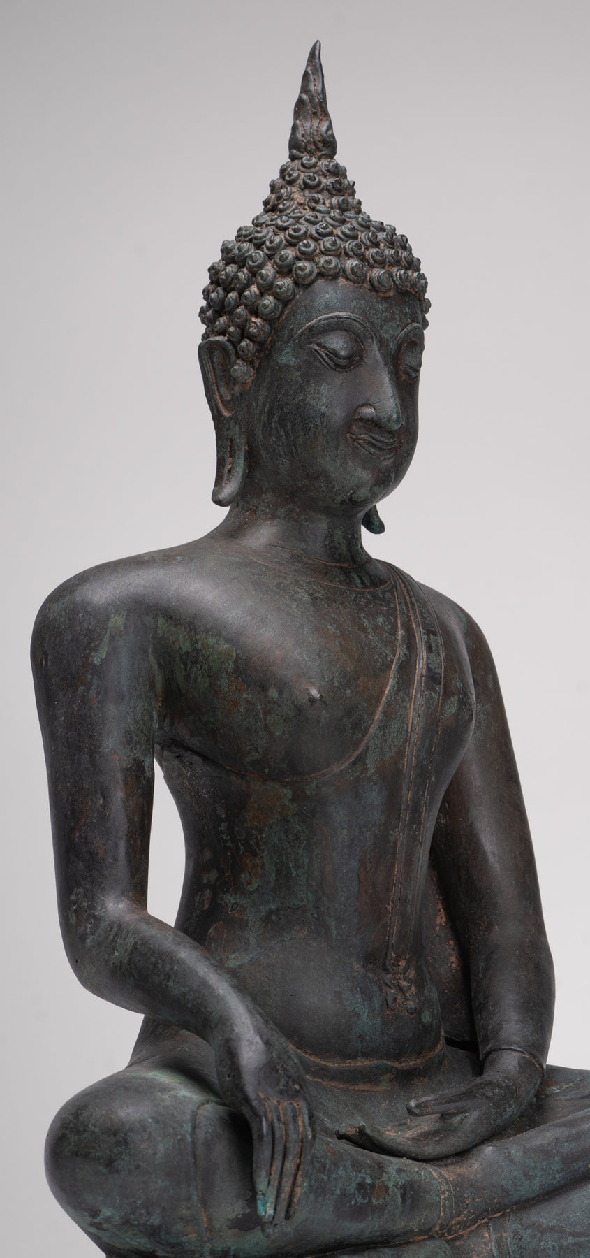 Le visage du Bouddha de Sukhothai se caractérise par une expression douce et sereine et un sourire subtil qui transmet la paix intérieure et la compassion. Les caractéristiques typiques comprennent un front large, des sourcils arqués, des yeux baissés en forme d'amande, un nez proéminent et des lèvres aux contours doux qui suggèrent une joie tranquille.