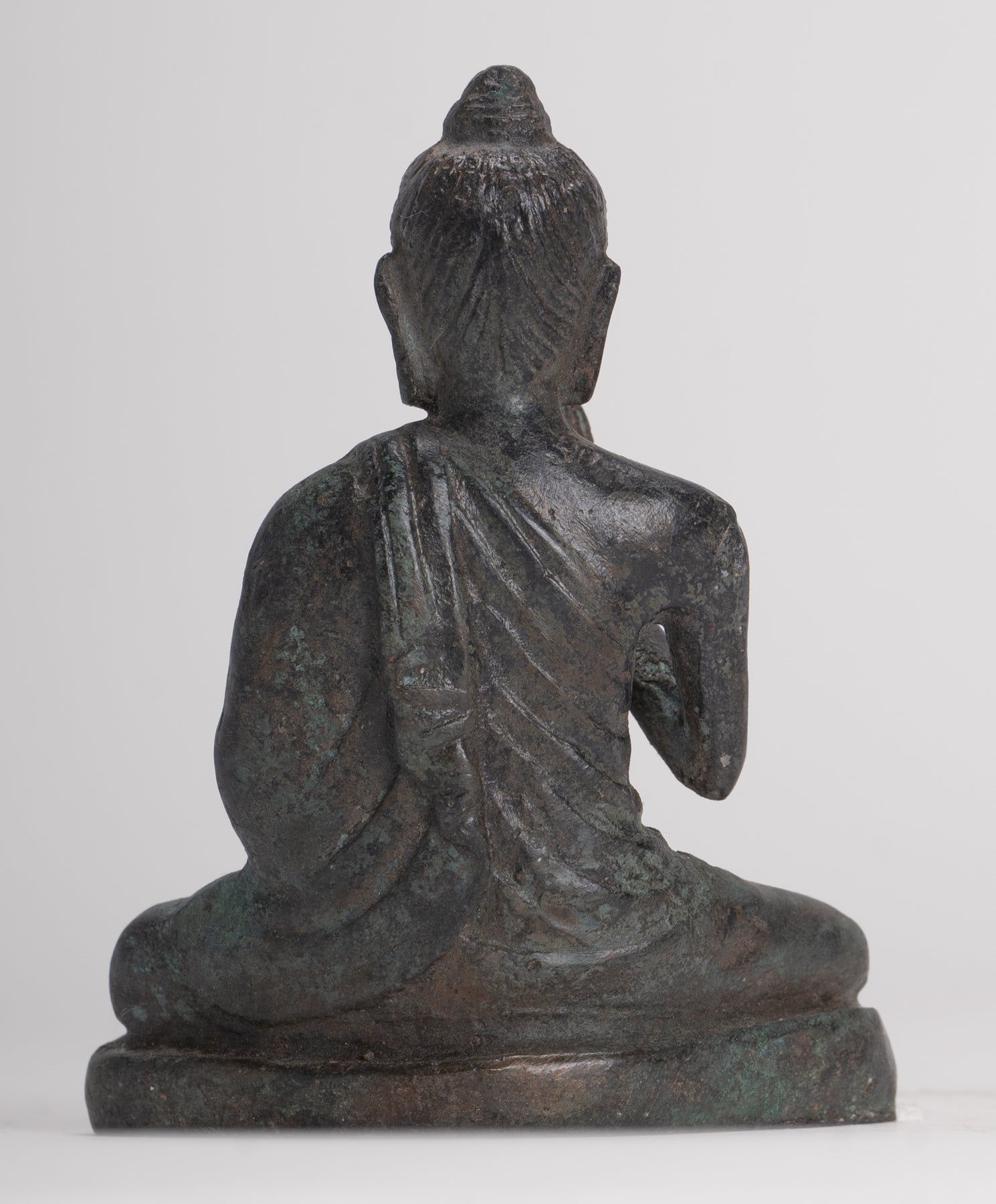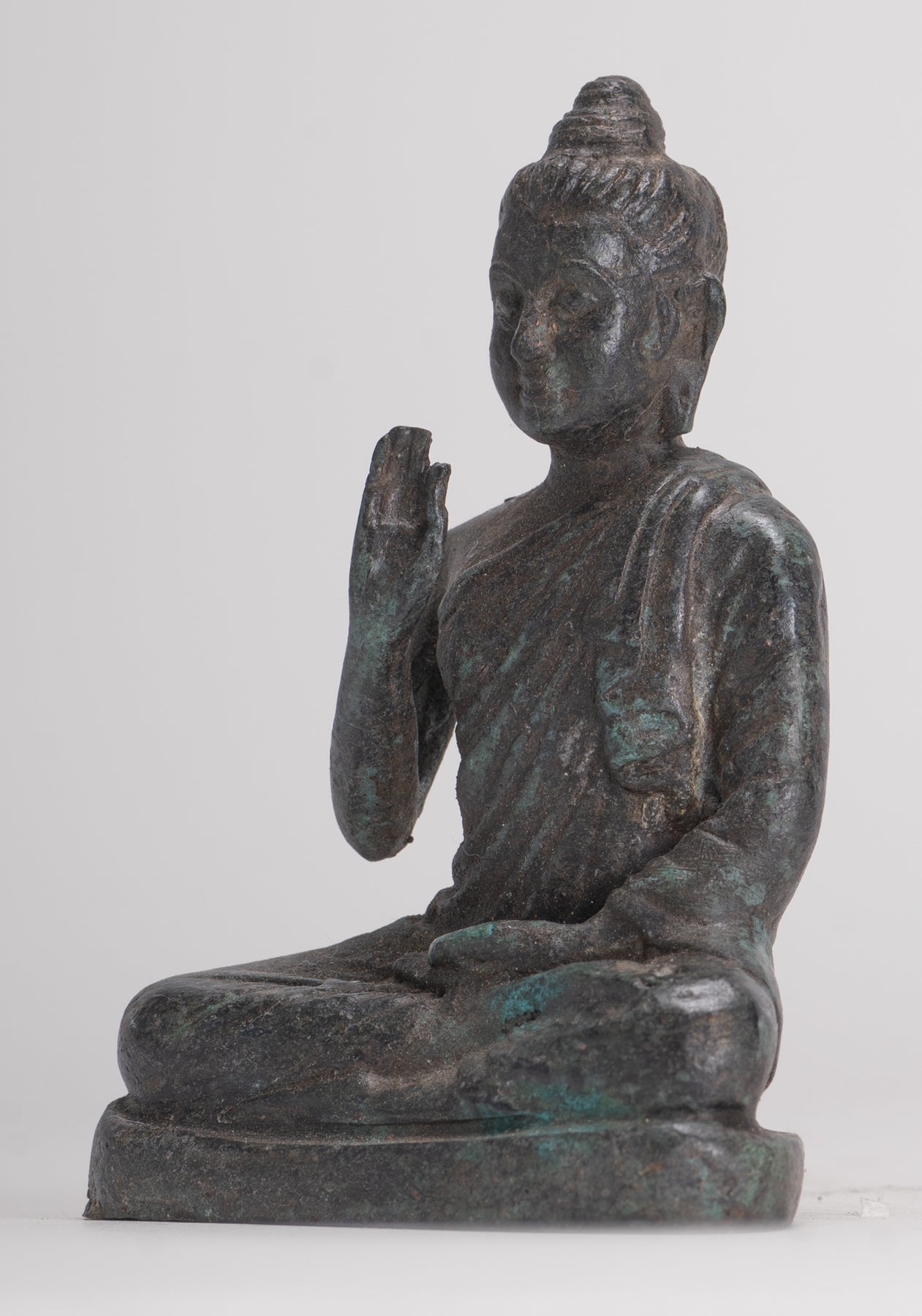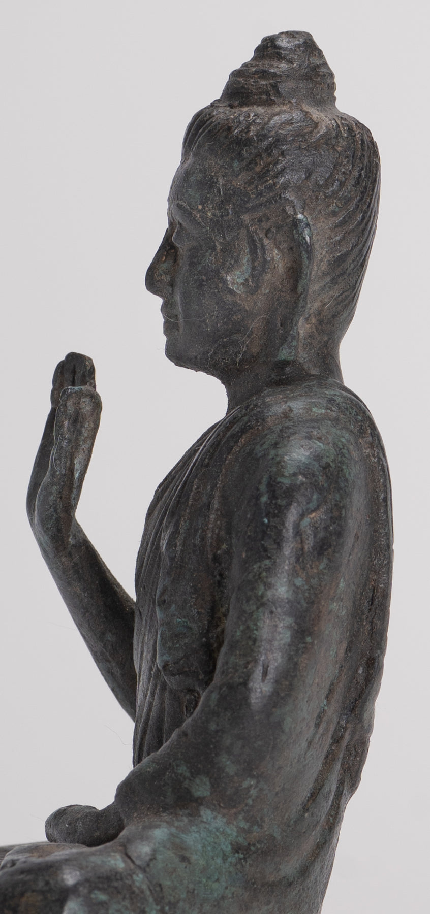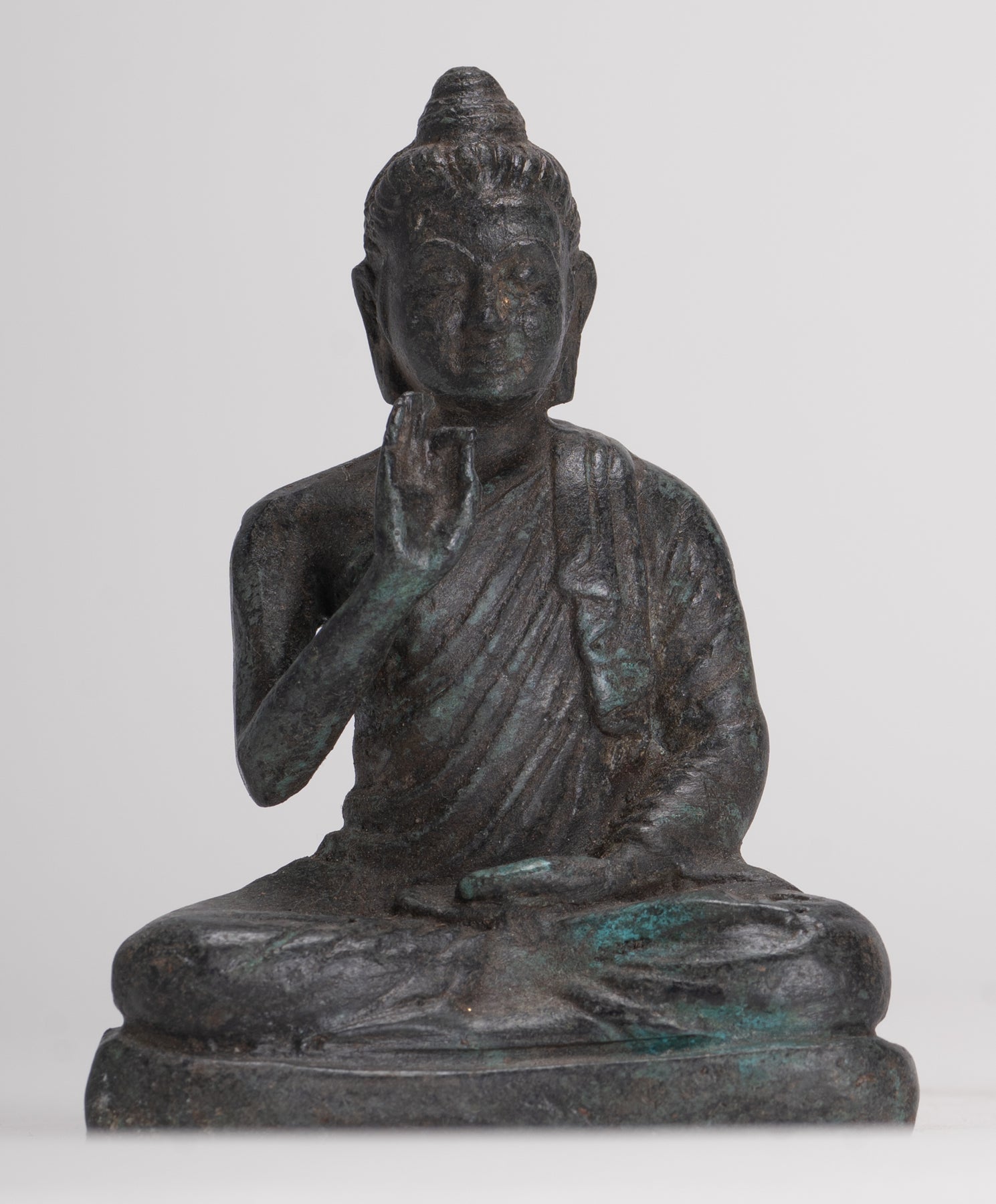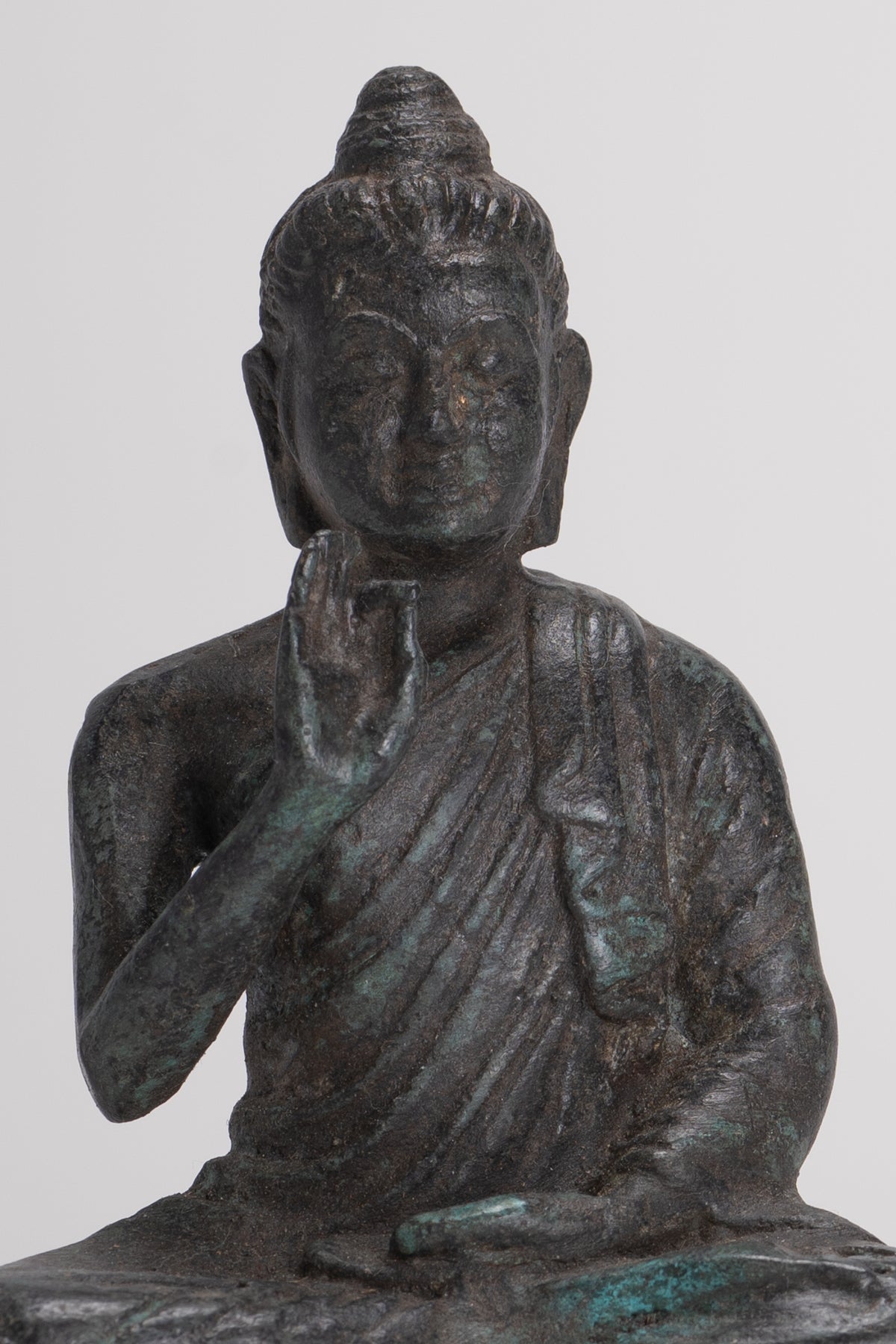 Un Bouddha de style Gandhara antique assis dans la possibilité de Lotus ou de Padmasana, avec chaque pied placé sur la cuisse opposée et mains levées dans le double Dharmachakra ou enseignant Mudra. Ses robes en cascade en cascade des deux épaules.En sanskrit, Dharmachakra signifie la «roue du dharma». Cette mudra symbolise l'un des moments les plus importants de la vie de Bouddha, l'occasion où il a prêché à ses compagnons le premier sermon après son illumination dans le parc de cerfs à Sarnath. Il désigne donc le décor en mouvement de la roue de l'enseignement du Dharma. Dans ce mudra, le pouce et l'index touchent à leurs extrémités pour former un cercle. Ce cercle représente la roue du dharma, ou en termes métaphysiques, l'union de la méthode et de la sagesse. Cela symbolise la générosité.