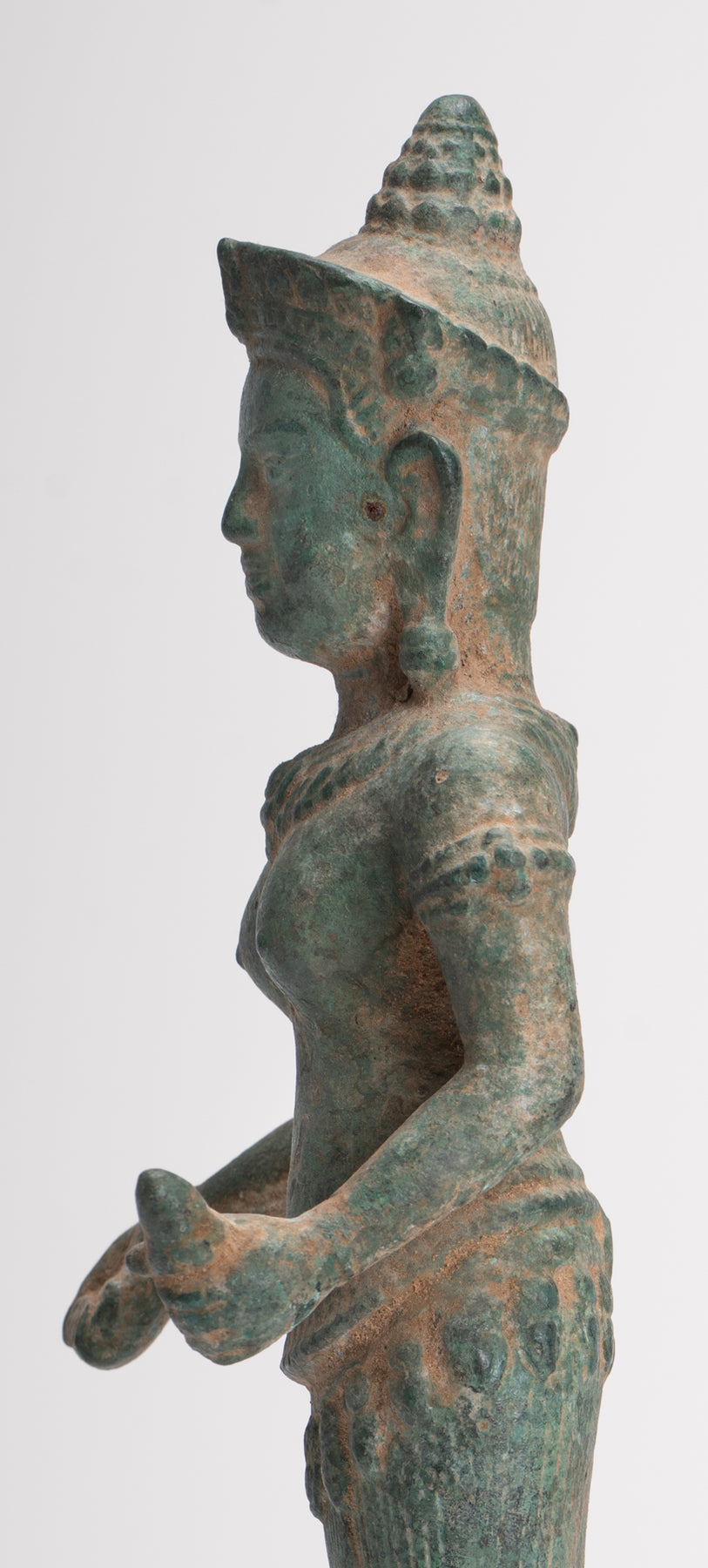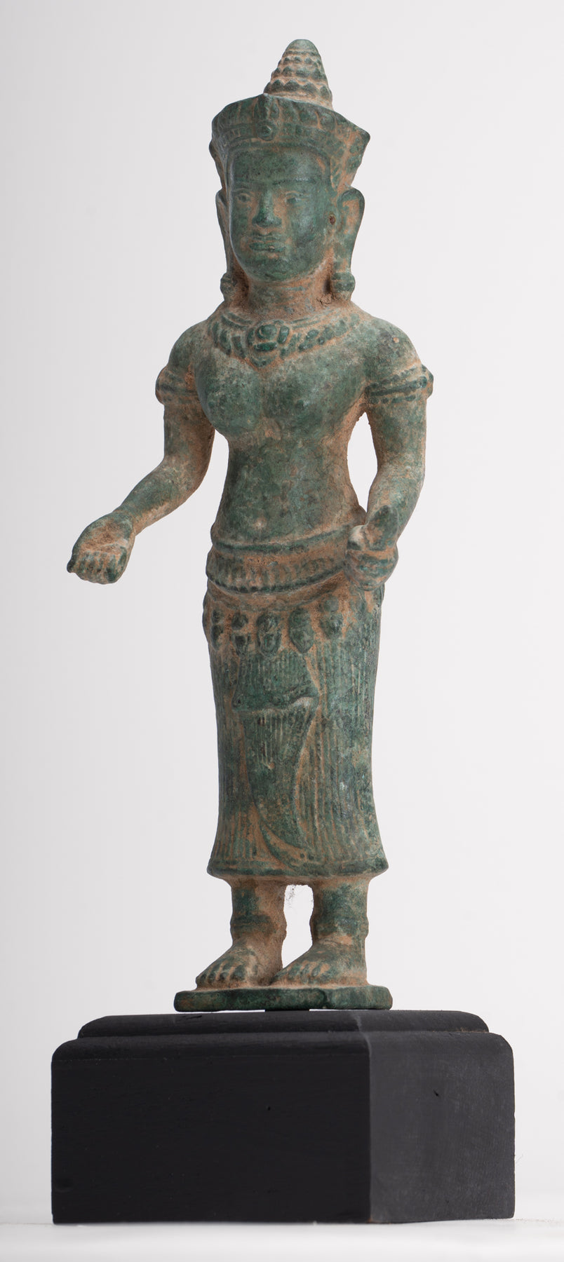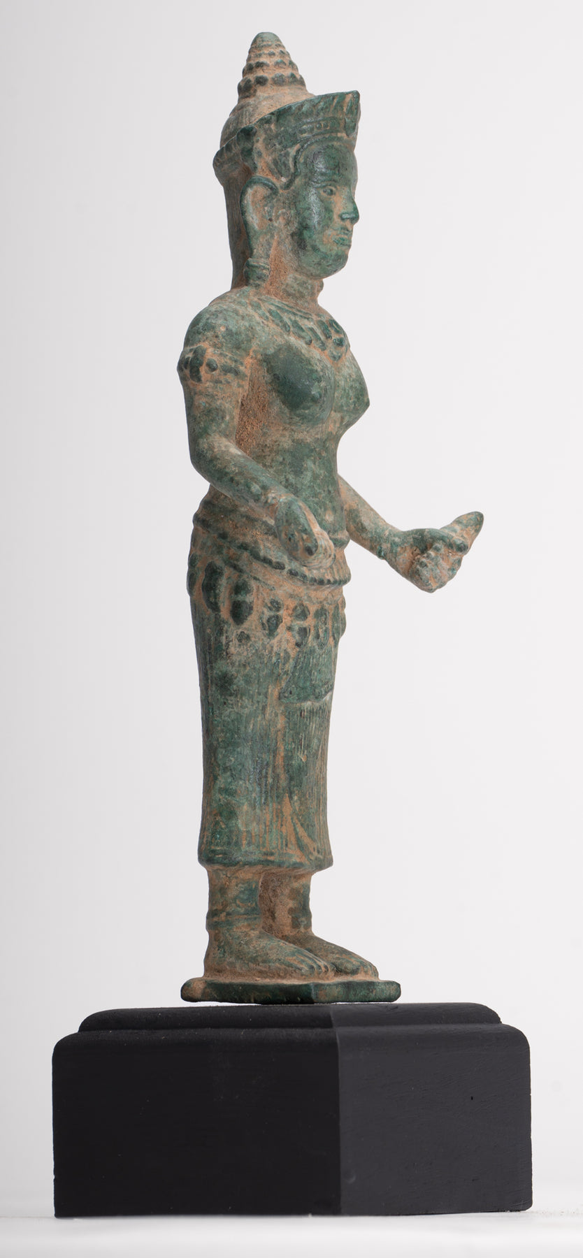 - Statue antique de style khmer Bayon Lakshmi / Devi Consort de Vishnu - 37 cm/15" Mesures : (hauteur) 37 cm/15 Statue antique de Lakshmi, devi ou déesse de style khmer de la fin du XIIe et du début du XIIIe siècle dans le style Bayon. Lakshmi se tient sur un simple socle rectangulaire. Elle est vêtue d'un long sampot plissé avec une ceinture en fleur de lotus. Les cheveux sont attachés avec une bande de perles pour former un chignon arrondi. Elle est debout avec ses mains dans l'Abhaya ou mudra de protection et dans le Dharmachakra ou mudra d'enseignement. Lakshmi est la déesse hindoue de la richesse, de la prospérité (à la fois matérielle et spirituelle), de la lumière, de la sagesse, de la fortune, de la fertilité, de la générosité et du courage. L'incarnation de la beauté, de la grâce et du charme. Également appelée Mahalakshmi, elle est censée porter chance et protéger ses fidèles de toutes sortes de misère et de chagrins liés à l'argent. La patine azur et les détails de cette pièce sont particulièrement attrayants. Cette pièce d'apparence traditionnelle ajoutera à coup sûr une touche unique à n'importe quelle pièce de votre maison ou de votre lieu de travail. L'une des divinités asiatiques les plus reconnaissables, cette représentation de l'épouse de Vishnu illuminera à coup sûr votre maison avec un style intemporel. GARANTIE DE SATISFACTION - Nous proposons de l'art asiatique, via notre site Web et eBay, depuis de nombreuses années et sommes fiers de la réputation que nous avons développée en matière d'annonces justes et honnêtes. Cependant, si pour quelque raison que ce soit vous n'êtes pas satisfait de votre achat, veuillez nous le faire savoir et nous vous rembourserons intégralement. Nous voulons que vous soyez 100% satisfait de votre achat. Cette pièce d'apparence traditionnelle apportera à coup sûr de la sérénité à votre maison, bureau ou lieu sacré. Nous avons d'autres statues asiatiques antiques disponibles. Veuillez consulter notre autre liste où nous avons d’autres belles pièces asiatiques disponibles. Pour plus d’art asiatique magnifique – www.hdasianart.com Heureux d’expédier dans le monde entier. Veuillez envoyer un e-mail pour connaître les prix de messagerie internationaux confirmés vers votre pays. Des réductions de frais de port s'appliquent pour plusieurs achats. Veuillez envoyer un e-mail pour toute question. Veuillez envoyer un e-mail avec des demandes commerciales. Merci de votre intérêt. HD Asian Art SCBR2790