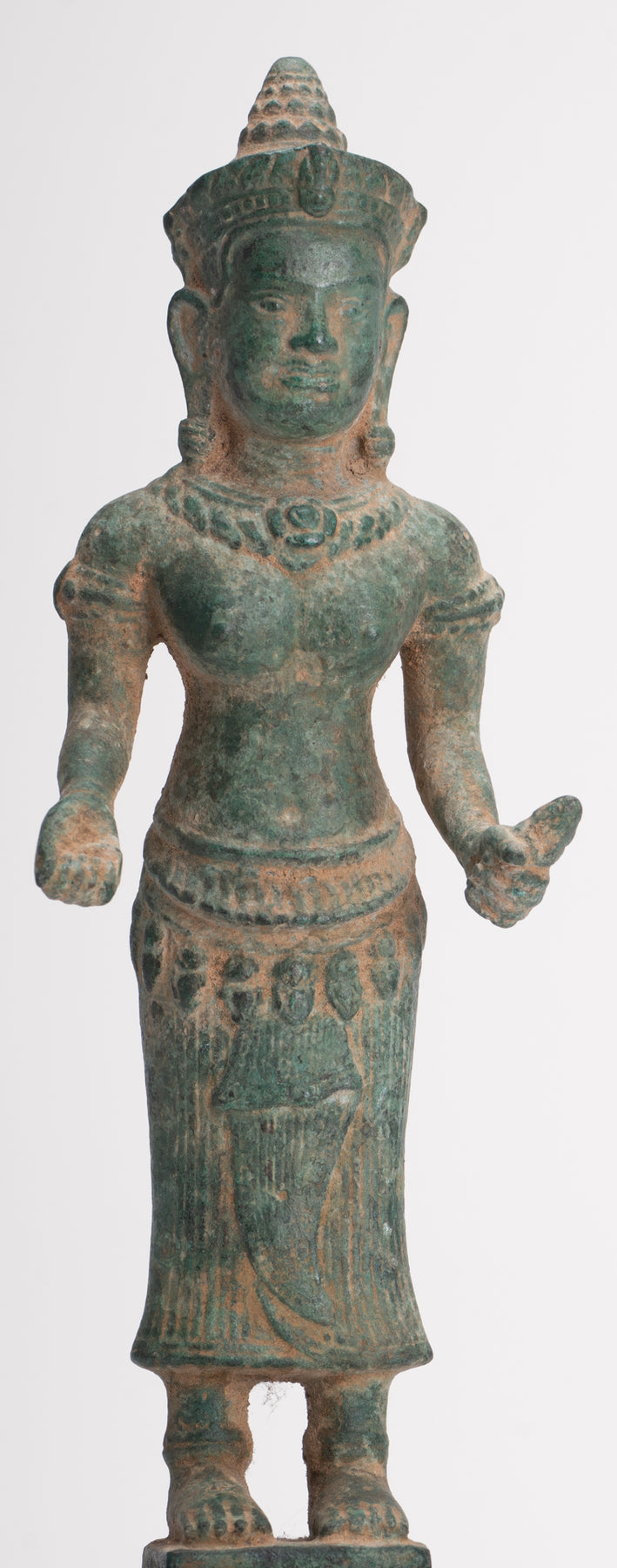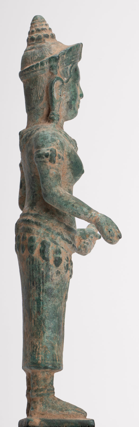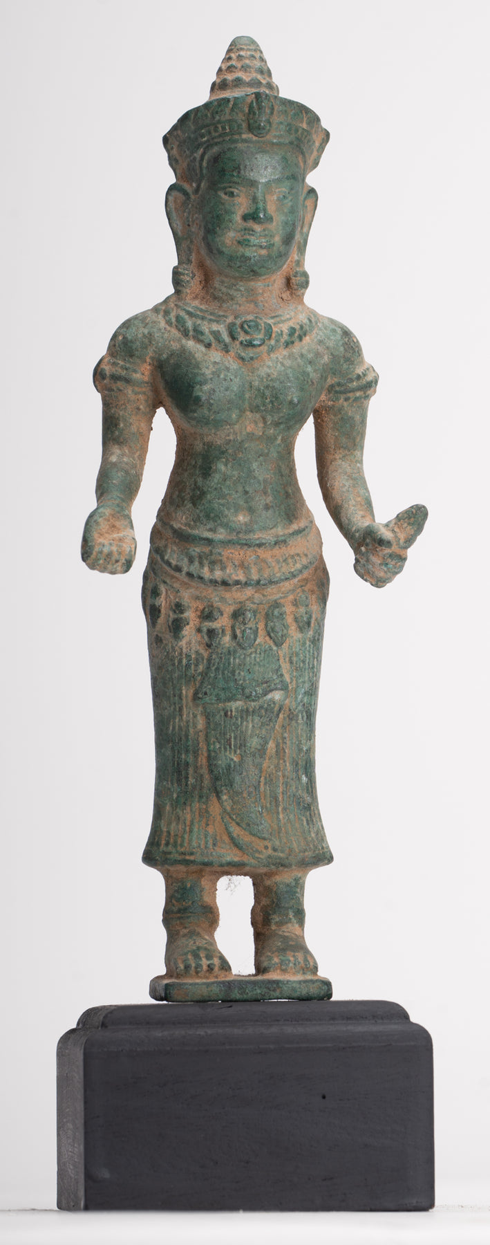 - Statue antique de style khmer Bayon Lakshmi / Devi Consort de Vishnu - 37 cm/15" Mesures : (hauteur) 37 cm/15 Statue antique de Lakshmi, devi ou déesse de style khmer de la fin du XIIe et du début du XIIIe siècle dans le style Bayon. Lakshmi se tient sur un simple socle rectangulaire. Elle est vêtue d'un long sampot plissé avec une ceinture en fleur de lotus. Les cheveux sont attachés avec une bande de perles pour former un chignon arrondi. Elle est debout avec ses mains dans l'Abhaya ou mudra de protection et dans le Dharmachakra ou mudra d'enseignement. Lakshmi est la déesse hindoue de la richesse, de la prospérité (à la fois matérielle et spirituelle), de la lumière, de la sagesse, de la fortune, de la fertilité, de la générosité et du courage. L'incarnation de la beauté, de la grâce et du charme. Également appelée Mahalakshmi, elle est censée porter chance et protéger ses fidèles de toutes sortes de misère et de chagrins liés à l'argent. La patine azur et les détails de cette pièce sont particulièrement attrayants. Cette pièce d'apparence traditionnelle ajoutera à coup sûr une touche unique à n'importe quelle pièce de votre maison ou de votre lieu de travail. L'une des divinités asiatiques les plus reconnaissables, cette représentation de l'épouse de Vishnu illuminera à coup sûr votre maison avec un style intemporel. GARANTIE DE SATISFACTION - Nous proposons de l'art asiatique, via notre site Web et eBay, depuis de nombreuses années et sommes fiers de la réputation que nous avons développée en matière d'annonces justes et honnêtes. Cependant, si pour quelque raison que ce soit vous n'êtes pas satisfait de votre achat, veuillez nous le faire savoir et nous vous rembourserons intégralement. Nous voulons que vous soyez 100% satisfait de votre achat. Cette pièce d'apparence traditionnelle apportera à coup sûr de la sérénité à votre maison, bureau ou lieu sacré. Nous avons d'autres statues asiatiques antiques disponibles. Veuillez consulter notre autre liste où nous avons d’autres belles pièces asiatiques disponibles. Pour plus d’art asiatique magnifique – www.hdasianart.com Heureux d’expédier dans le monde entier. Veuillez envoyer un e-mail pour connaître les prix de messagerie internationaux confirmés vers votre pays. Des réductions de frais de port s'appliquent pour plusieurs achats. Veuillez envoyer un e-mail pour toute question. Veuillez envoyer un e-mail avec des demandes commerciales. Merci de votre intérêt. HD Asian Art SCBR2790