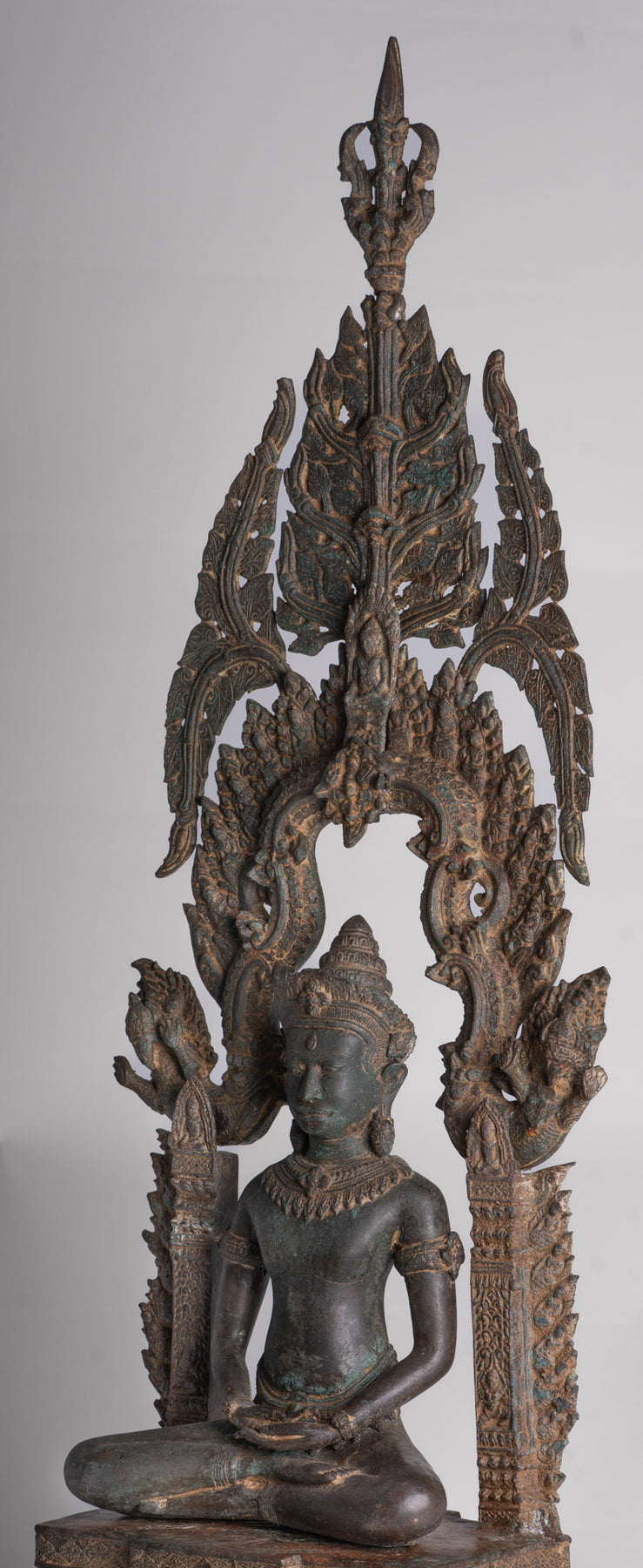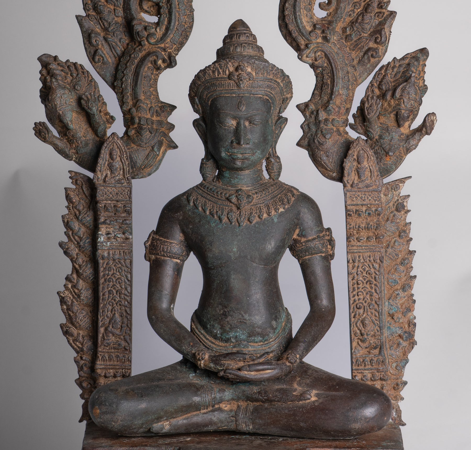 Un antico Buddha da meditazione in trono in stile Lopburi proveniente dalla Thailandia.