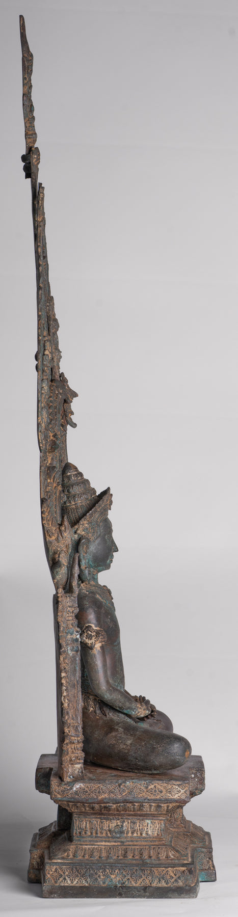 In trono su un piedistallo ornato il Buddha in stile Lopburi è rinomato per le sue caratteristiche simmetriche e ben proporzionate. Come è tipico, questa statua di Lopburi raffigura il Buddha in posizione seduta, con un'espressione calma e meditativa. L'enfasi sulla simmetria riflette l'equilibrio e l'armonia che i buddisti cercano nel loro viaggio spirituale.