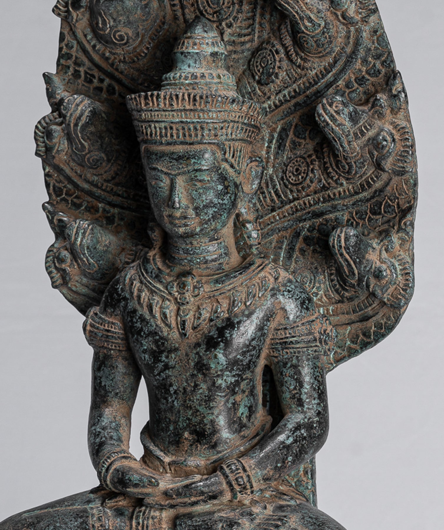 Uno stile Khmer seduto al Buddha di meditazione, seduto su un trono a tre stanchi, con la testa fiaccente di un gigante Naga, il serpente re Muchalinda, che si alzava dietro protetto dietro.