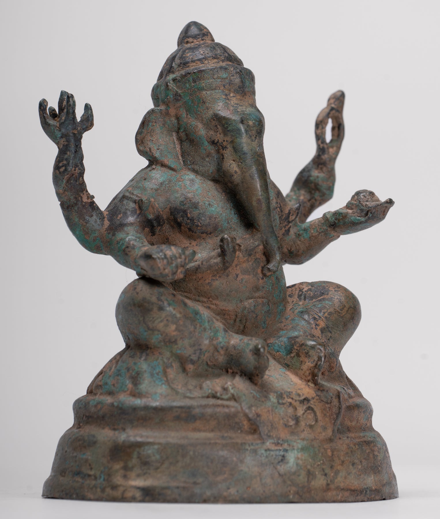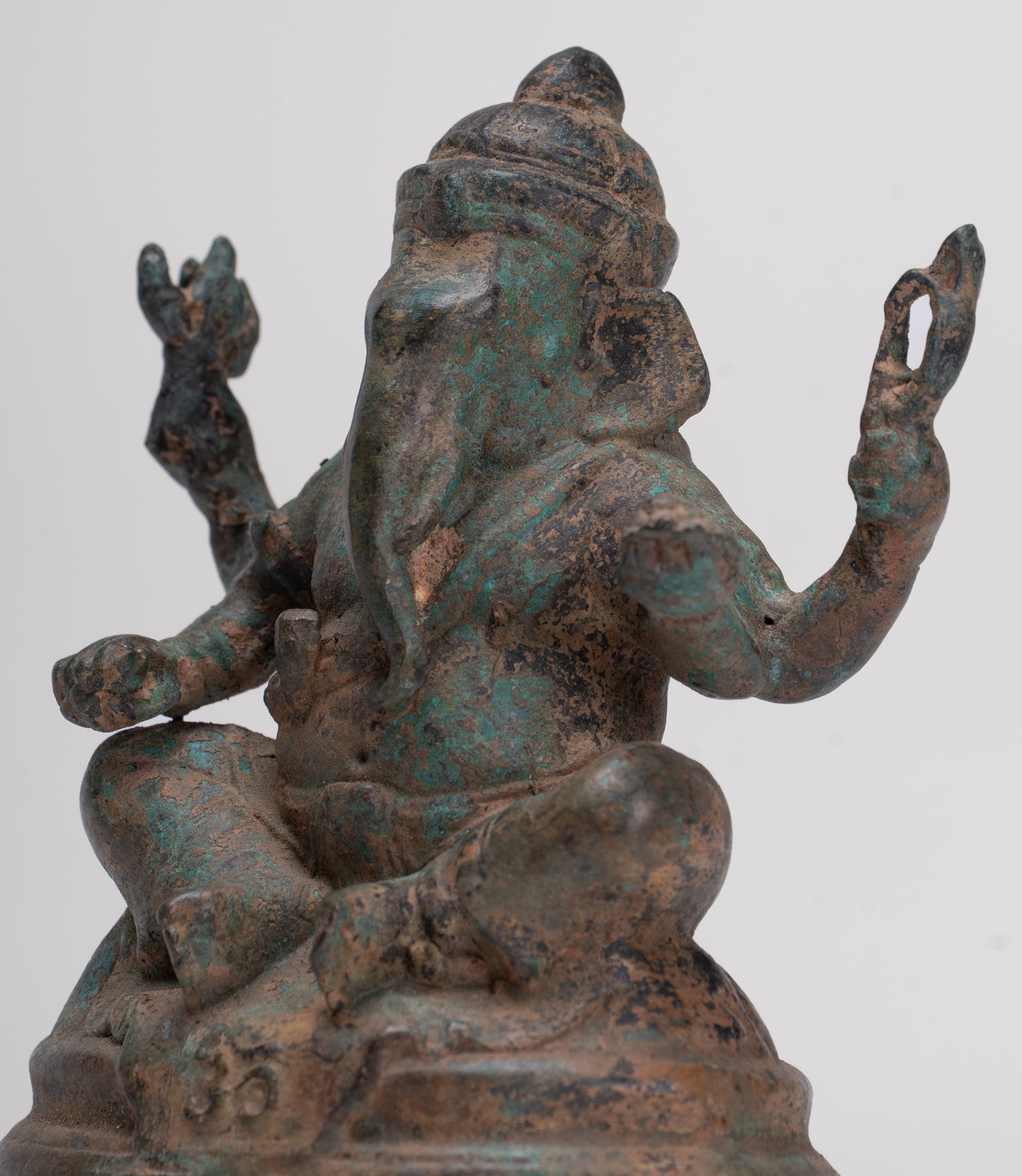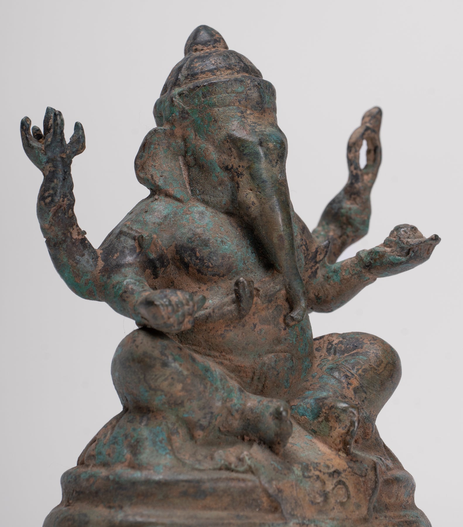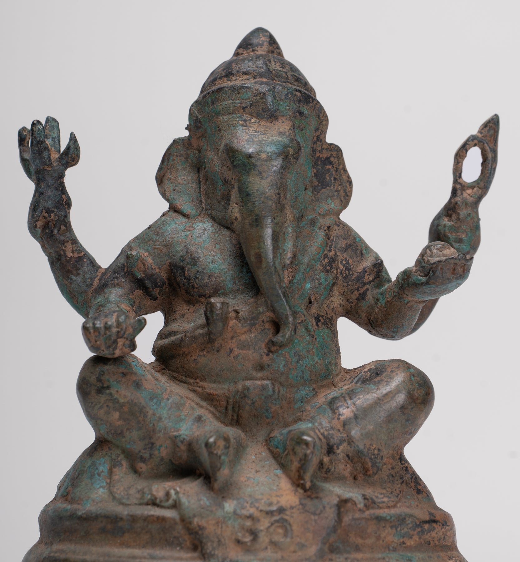 Un cast espressivo Ganesha seduto a 4 bracci in bronzo antico in stile tailandese sopra un basamento circolare.