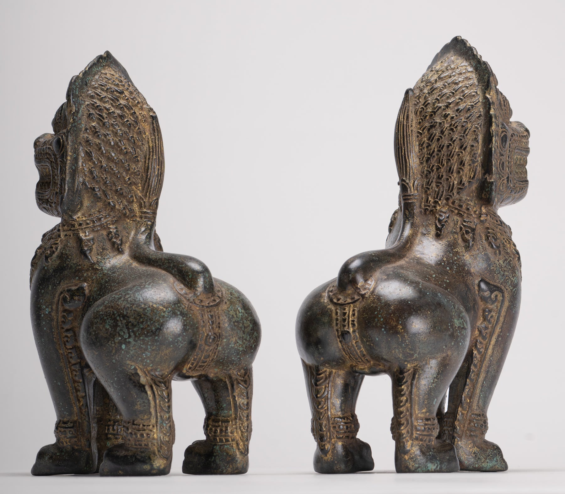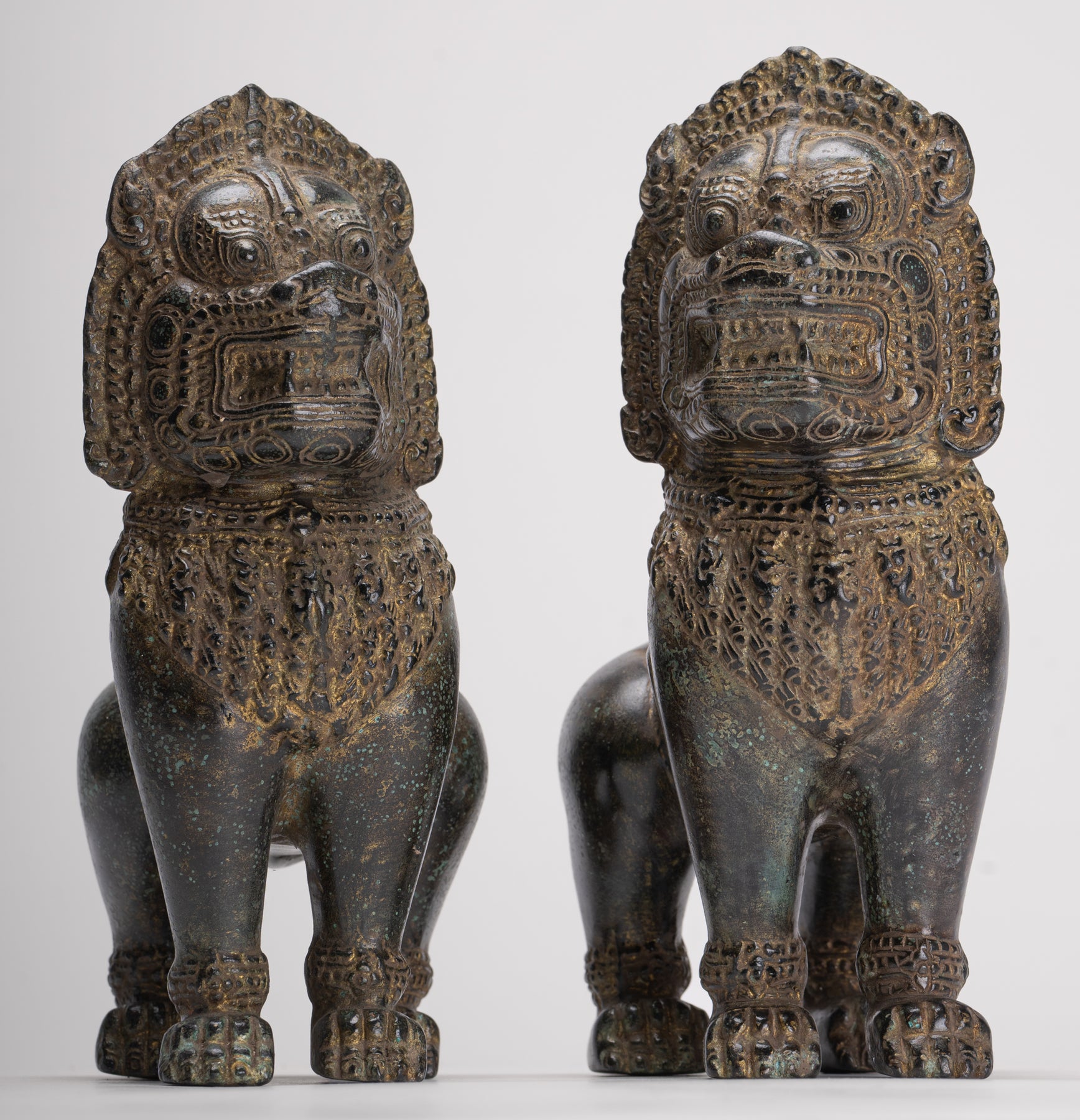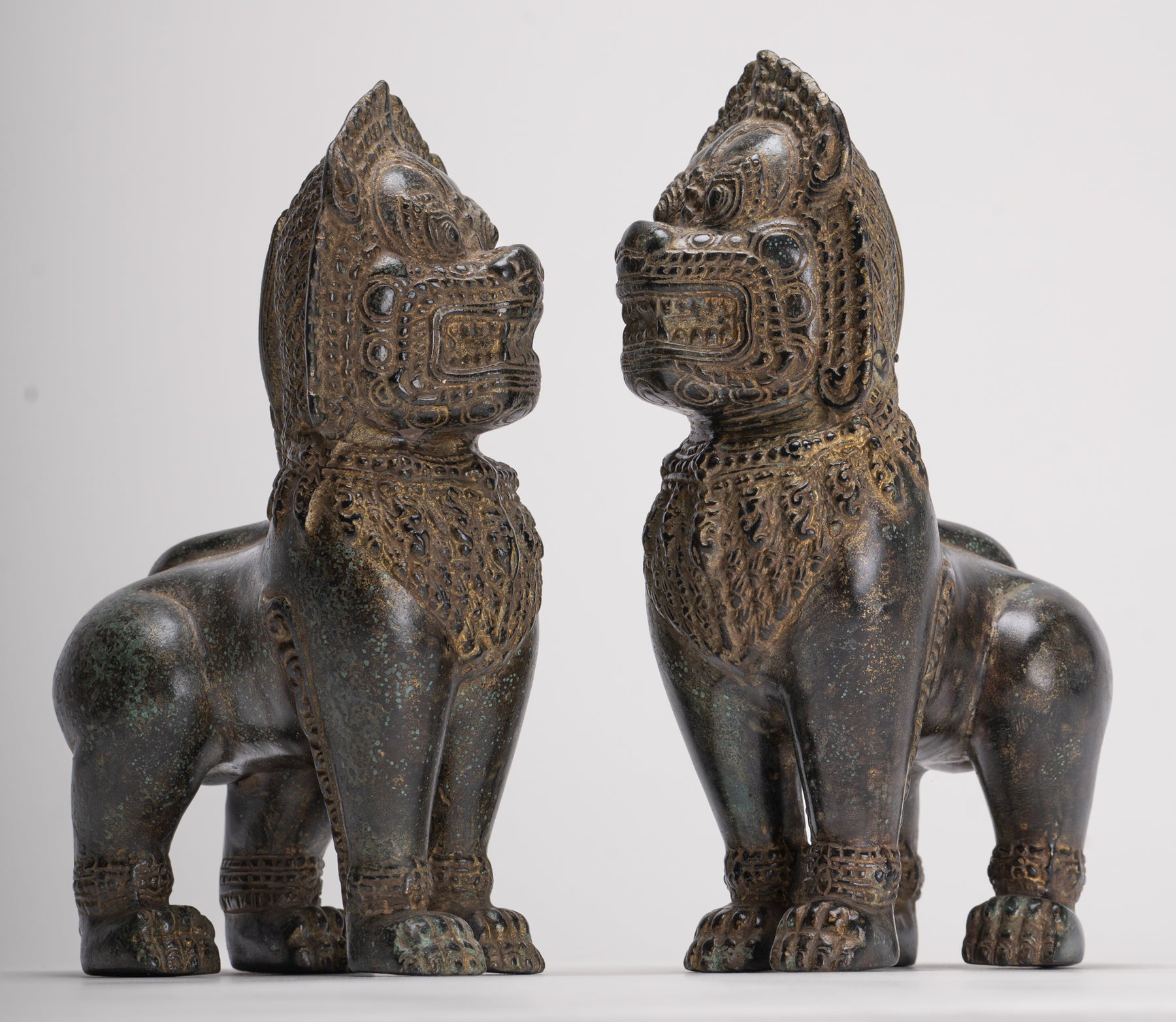 Temple Lions - Antique Khmer Style Bronze Standing Temple Guardian or Lions (Pair) - 22cm/9"