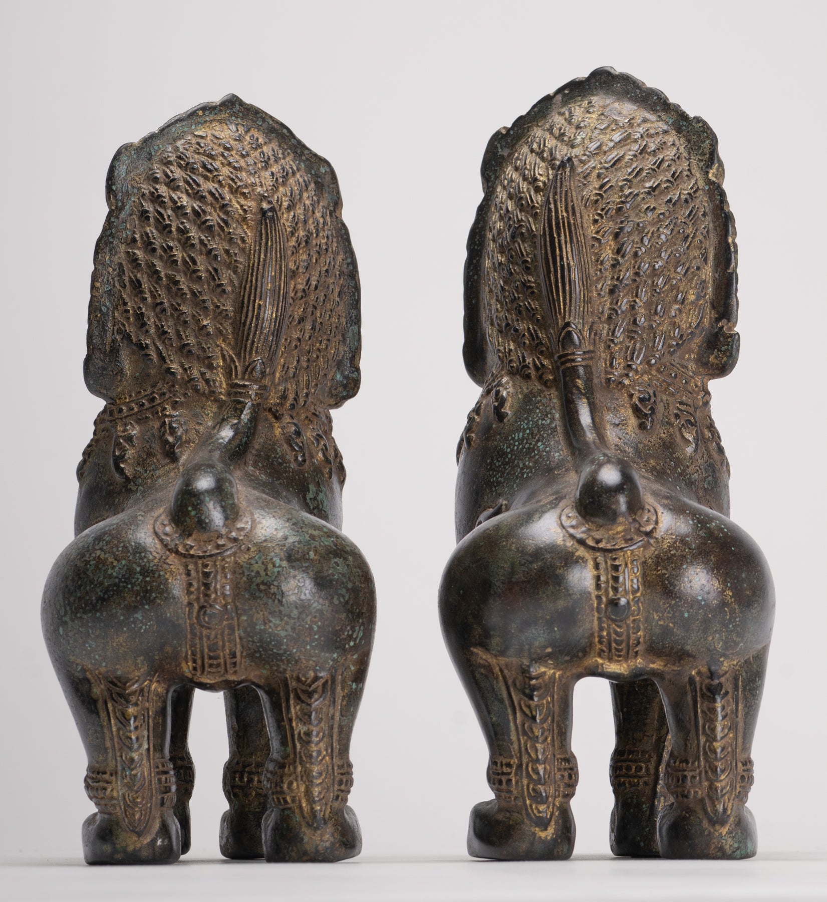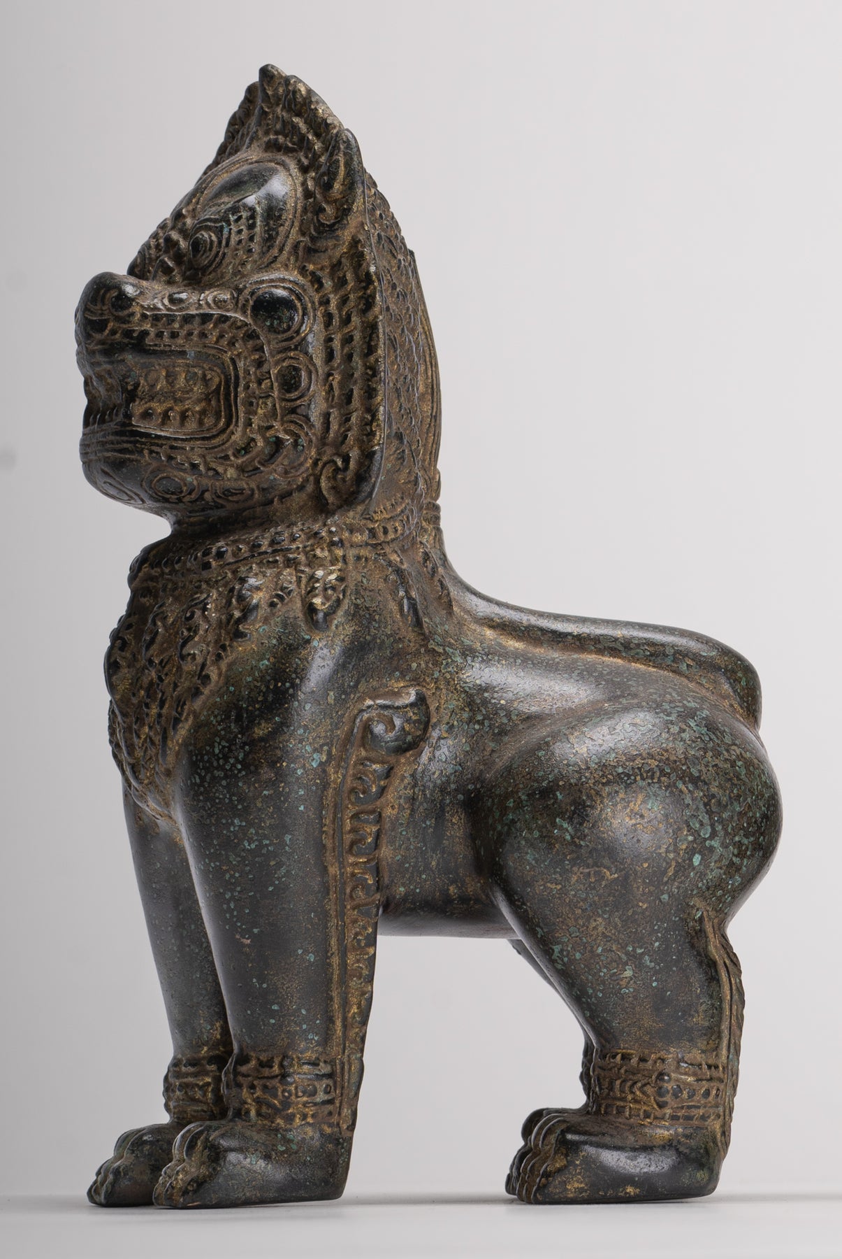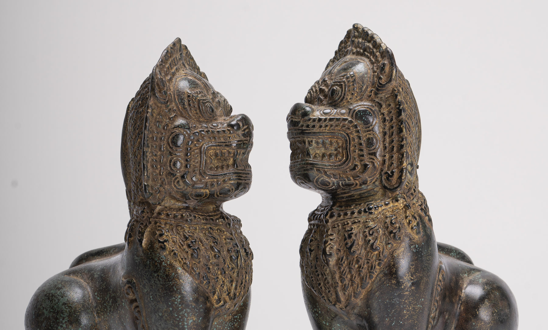 Temple Lions - Antique Khmer Style Bronze Standing Temple Guardian or Lions (Pair) - 22cm/9"
