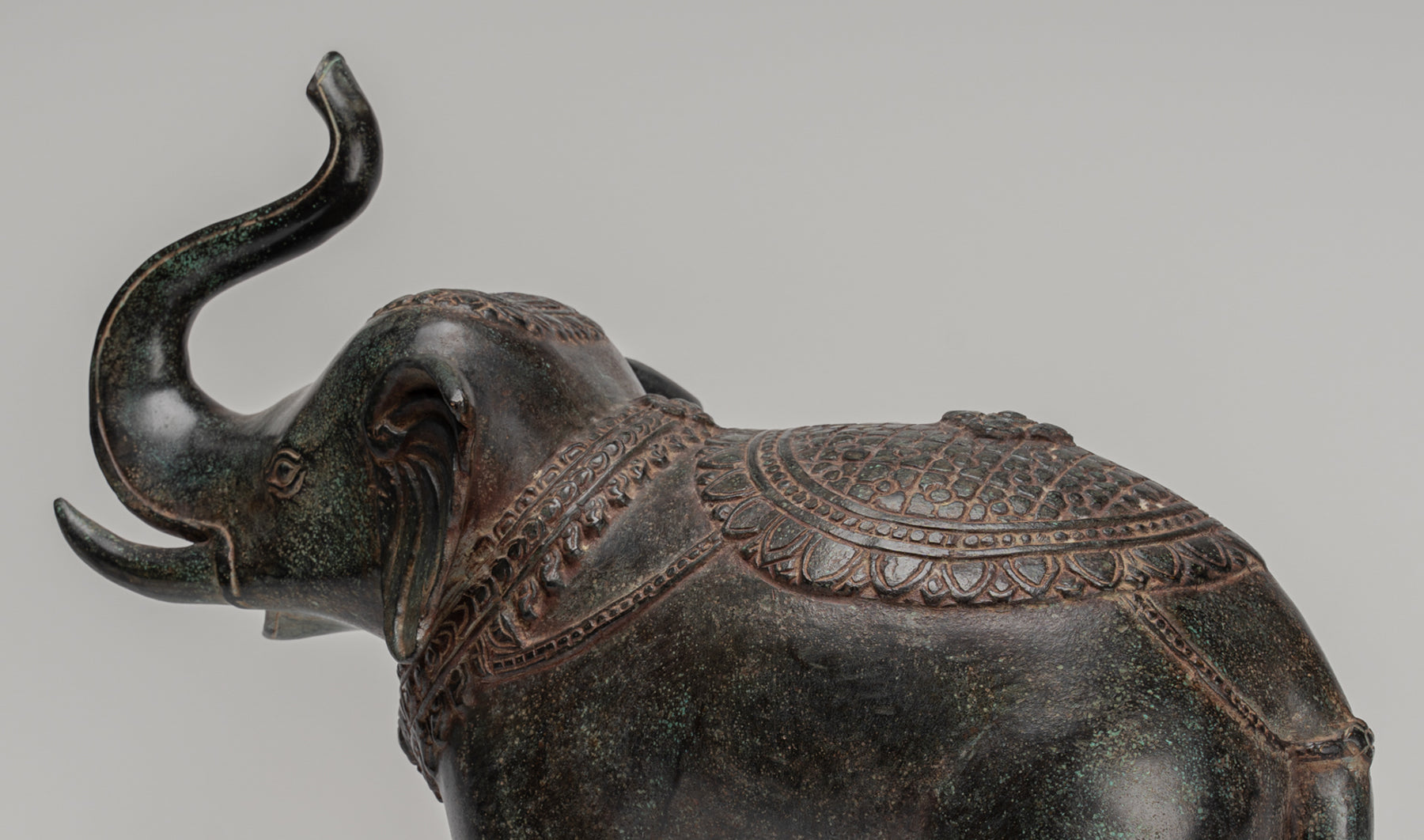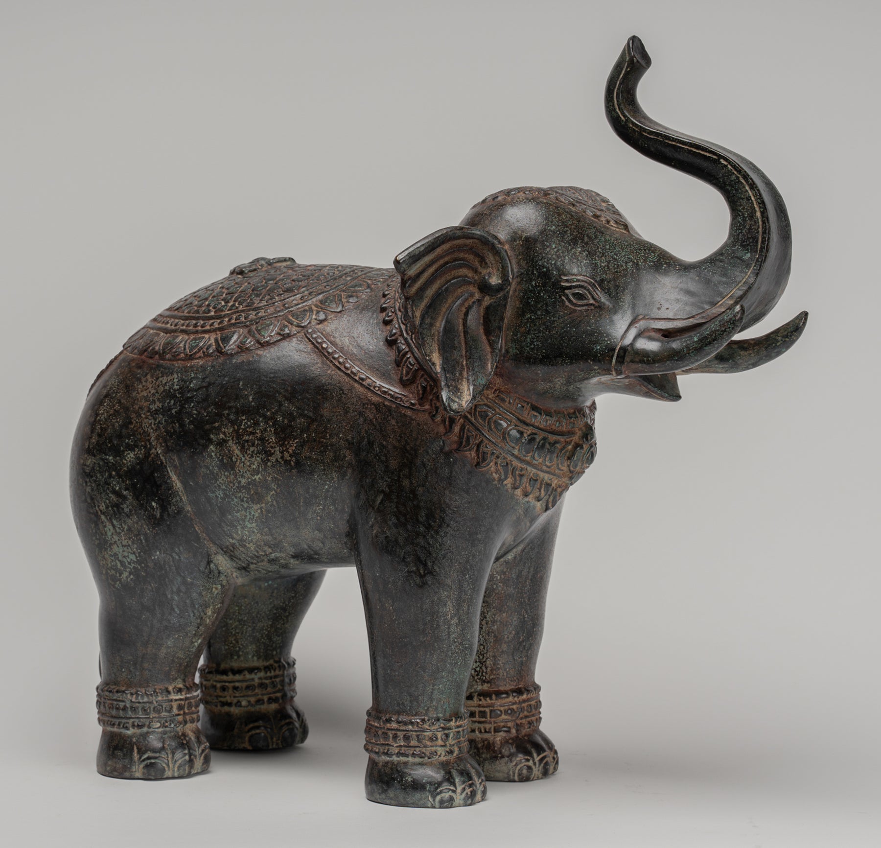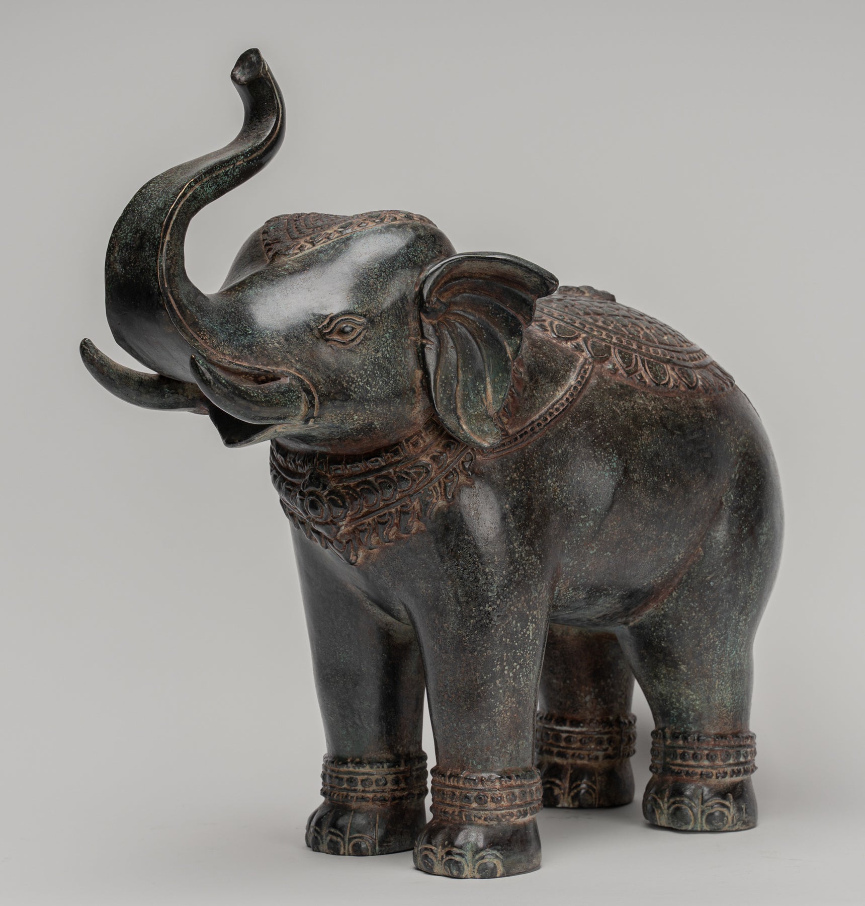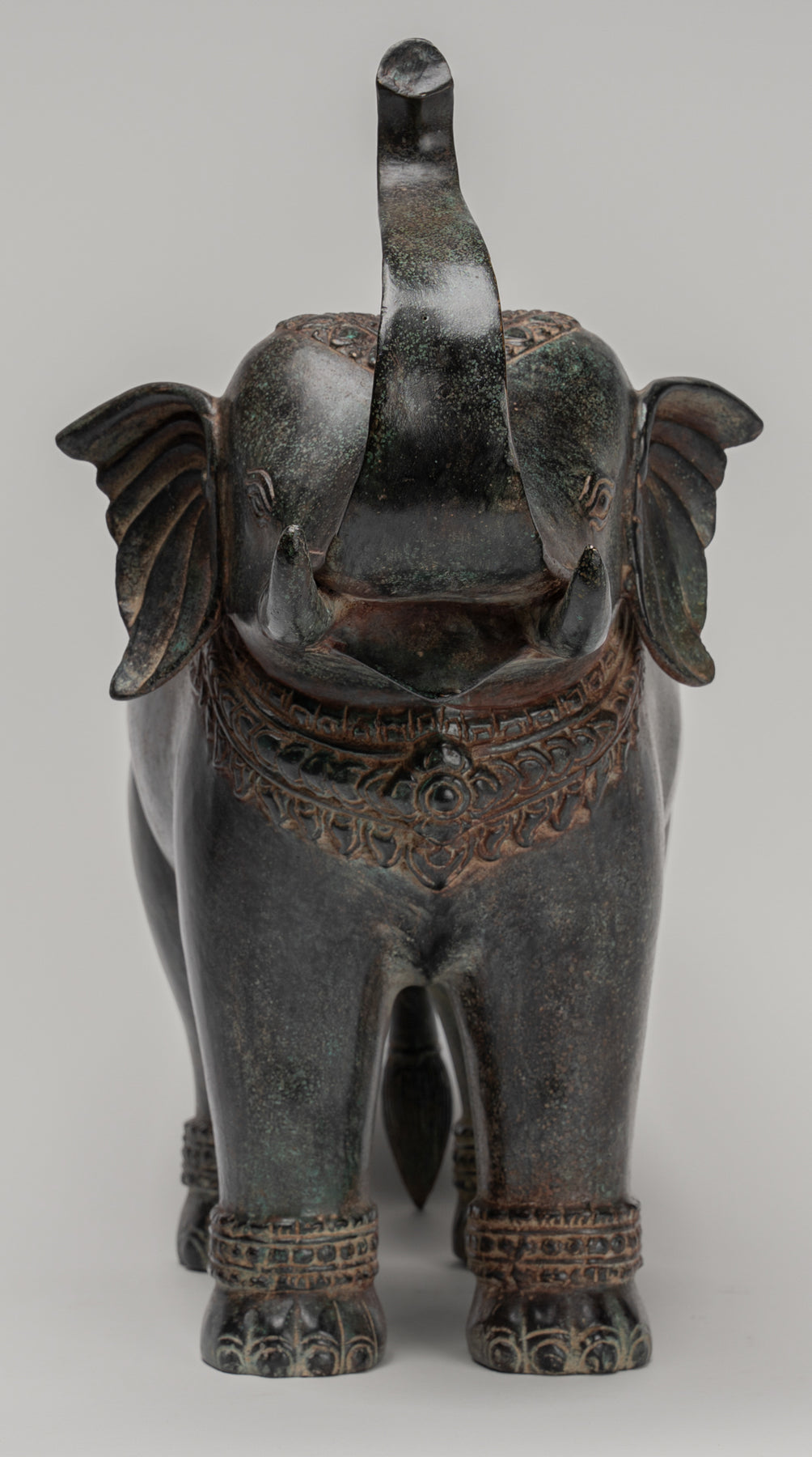 Una statua di elefante in bronzo in bronzo in stile Khmer. L'elefante è in piedi con il suo tronco verso l'alto in un gesto di buona volontà.