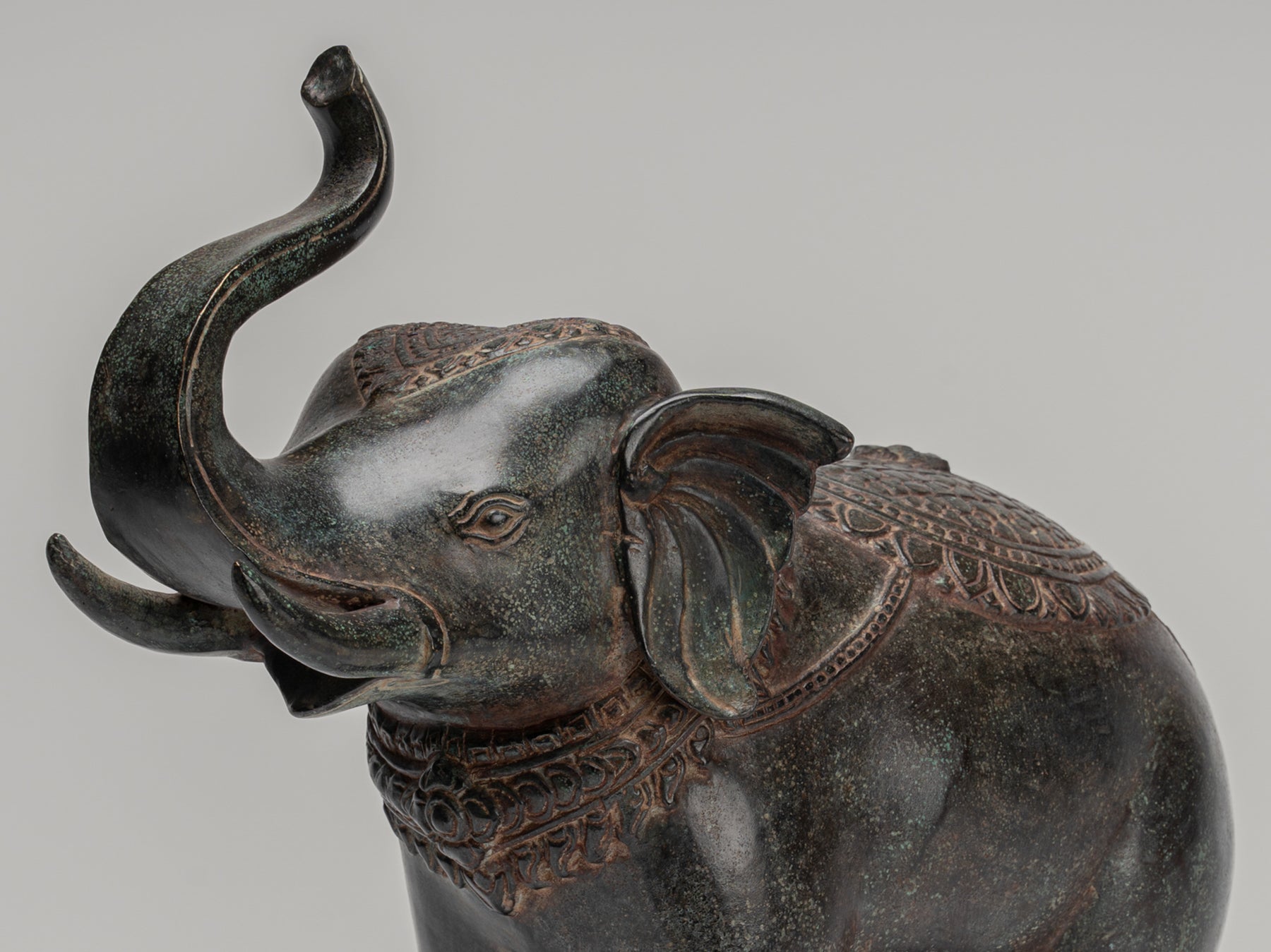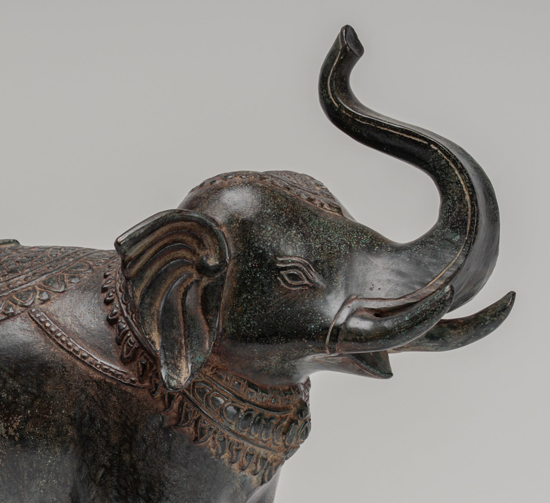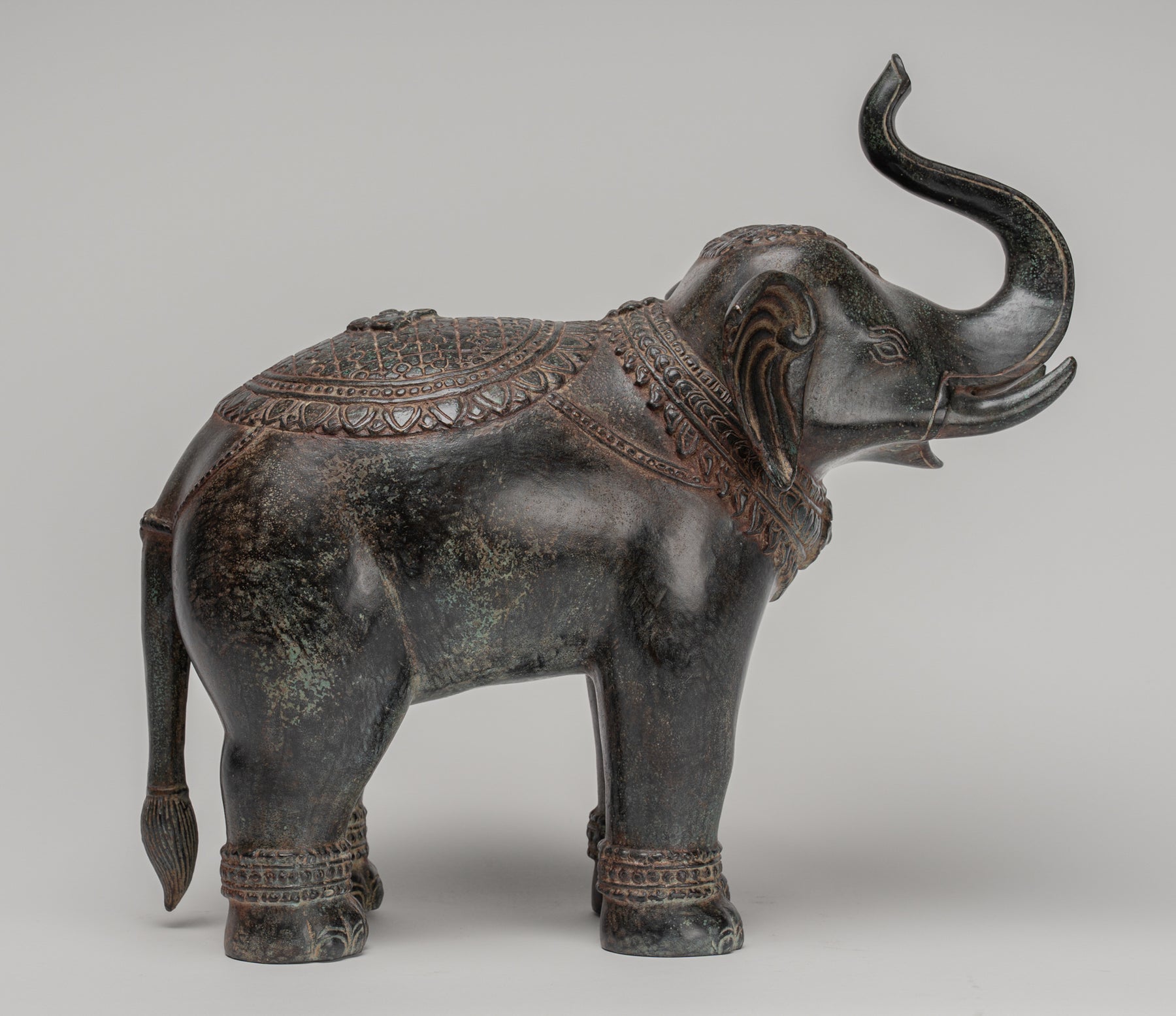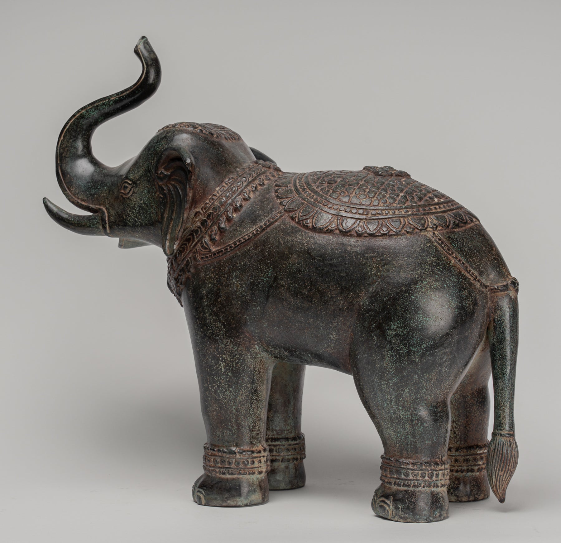 Una statua di elefante in bronzo in bronzo in stile Khmer. L'elefante è in piedi con il suo tronco verso l'alto in un gesto di buona volontà.