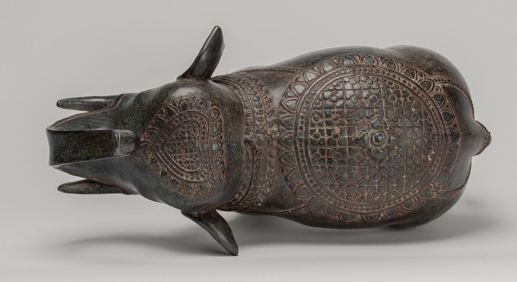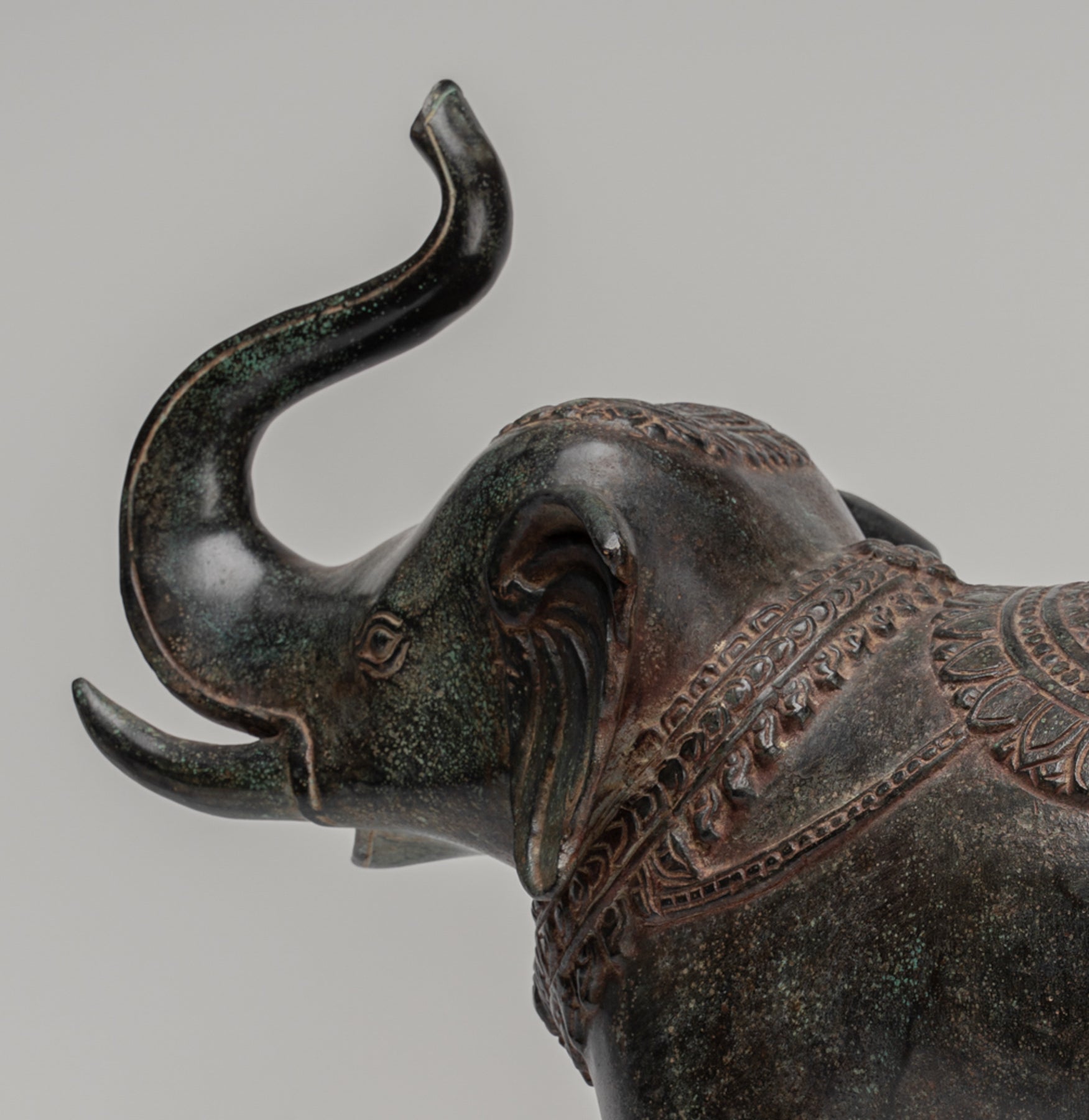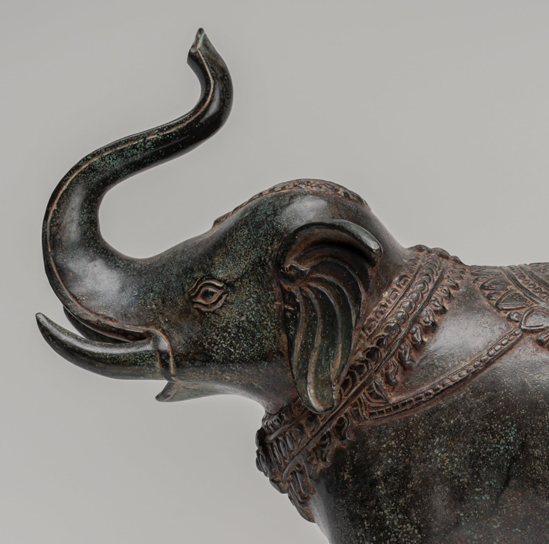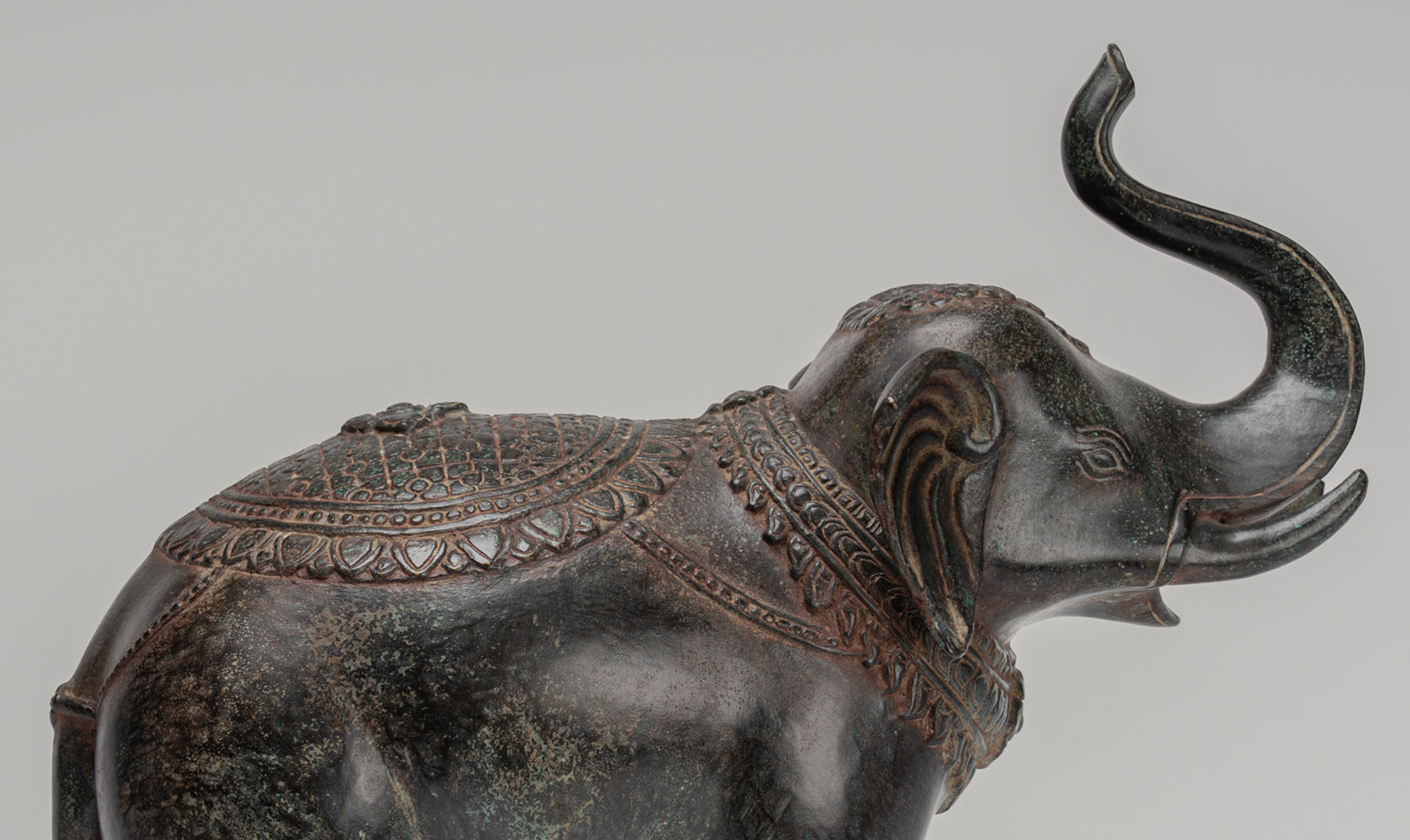 Una statua di elefante in bronzo in bronzo in stile Khmer. L'elefante è in piedi con il suo tronco verso l'alto in un gesto di buona volontà.