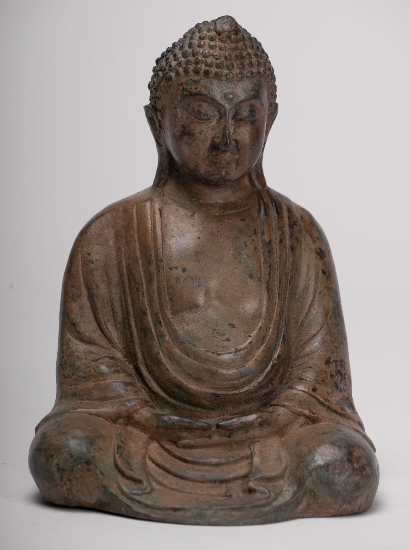 Statua antica del Buddha Amitabha in bronzo seduto da meditazione in stile giapponese - 18 cm/7"