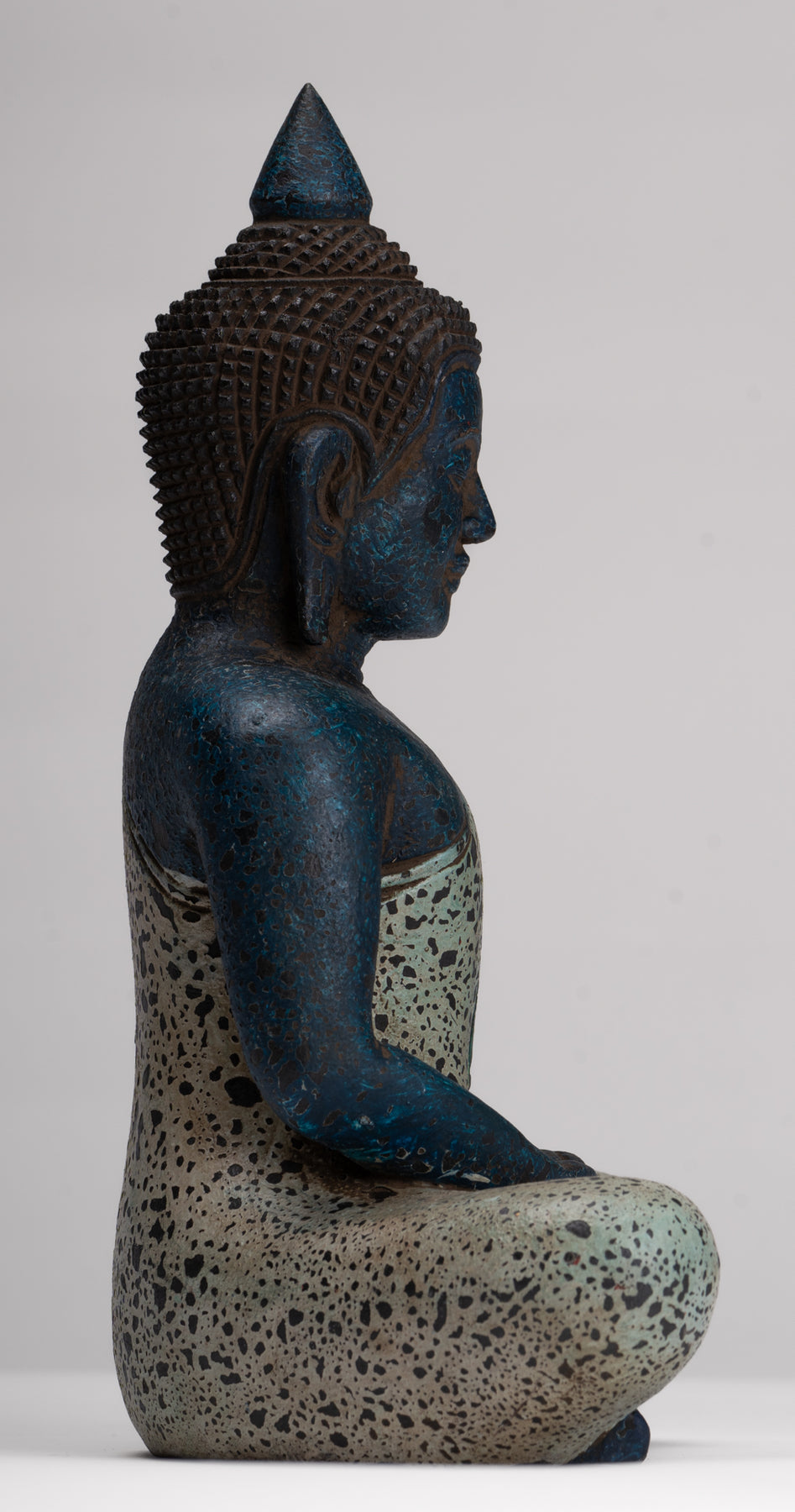 Come è tradizionale, il Buddha di meditazione è raffigurato qui in una posizione seduta, con entrambe le gambe incrociate in posizione mezzo-loto. Le mani sono posizionate nel Dhyana Mudra, dove la mano destra poggia sopra la mano sinistra, con i pollici che toccano delicatamente, formando un sottile triangolo o un cerchio. La schiena del Buddha è dritta e lo sguardo viene abbassato, significando profonda concentrazione e riflessione interiore.