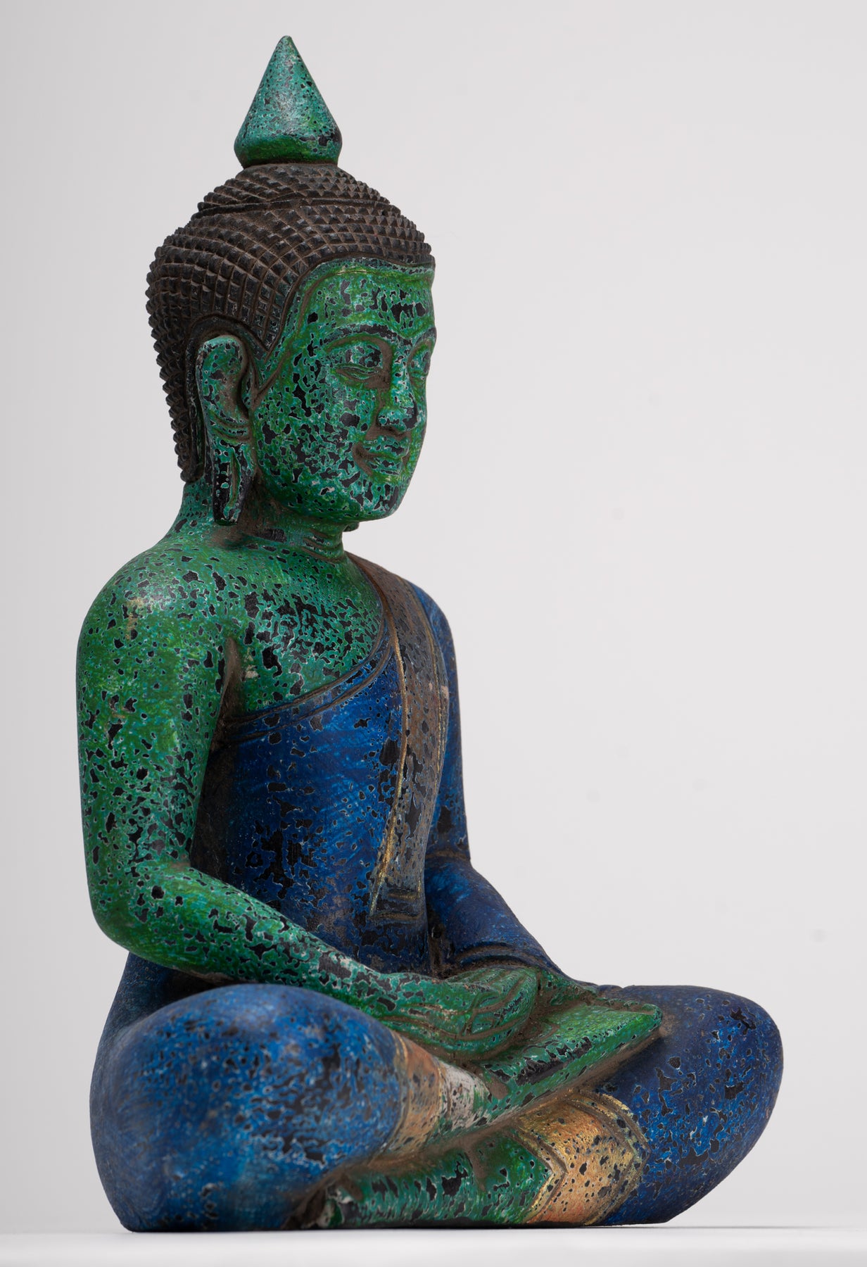 Come è tradizionale, il Buddha di meditazione è raffigurato qui in una posizione seduta, con entrambe le gambe incrociate in posizione mezzo-loto. Le mani sono posizionate nel Dhyana Mudra, dove la mano destra poggia sopra la mano sinistra, con i pollici che toccano delicatamente, formando un sottile triangolo o un cerchio. La schiena del Buddha è dritta e lo sguardo viene abbassato, significando profonda concentrazione e riflessione interiore.
