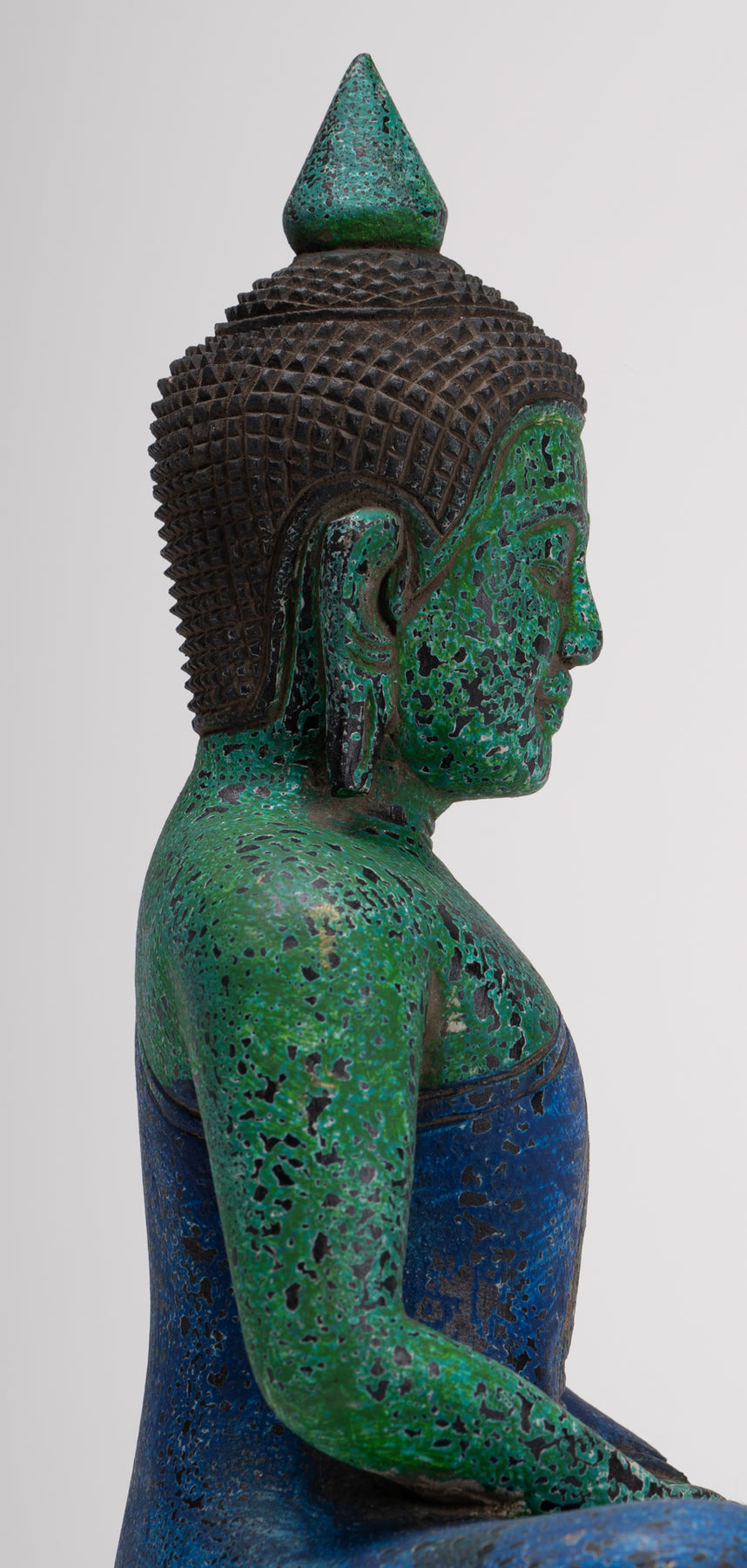 Il Buddha presenta un viso a forma di ovale, con occhi abbattuti a forma di mandorle. Le sopracciglia curve si incontrano sopra un naso di spicco e le labbra sagomate con un'espressione esaltata, sembrano sorridere.