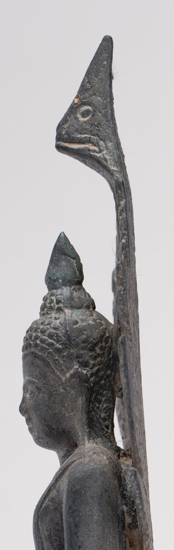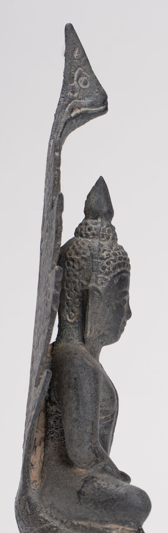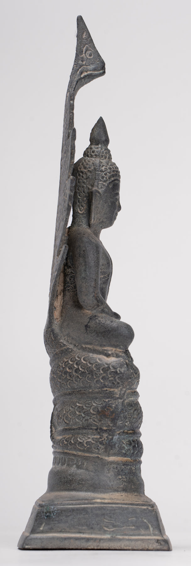 Il Il volto di Buddha irradia pace e dolce introspezione, con caratteristiche morbide e naturalistiche che catturano sia l'umanità che la trascendenza. La sua testa è coronata da un disegno finemente dettagliato Ushnisha, caratteristico del raffinato Stile Sukhothai, che significa conoscenza spirituale e illuminazione. Il forma di serpente è abilmente modellato, simmetrico e dignitoso, le sue scaglie intricate e le teste in bilico incarnano forza e devozione.