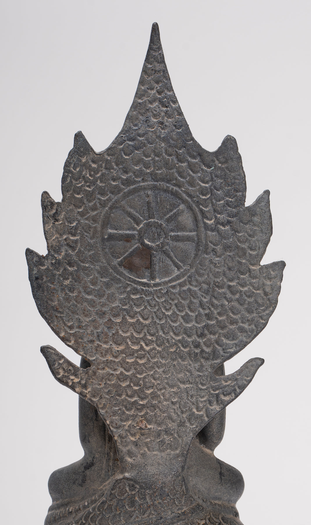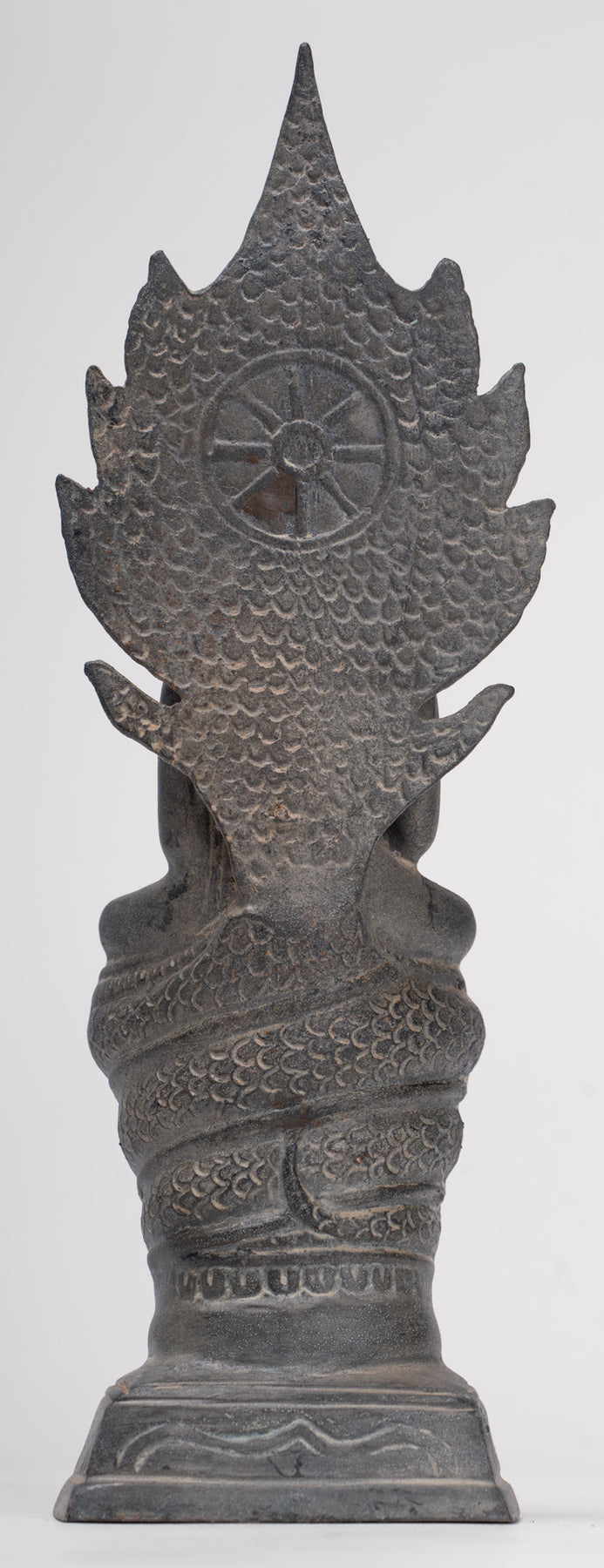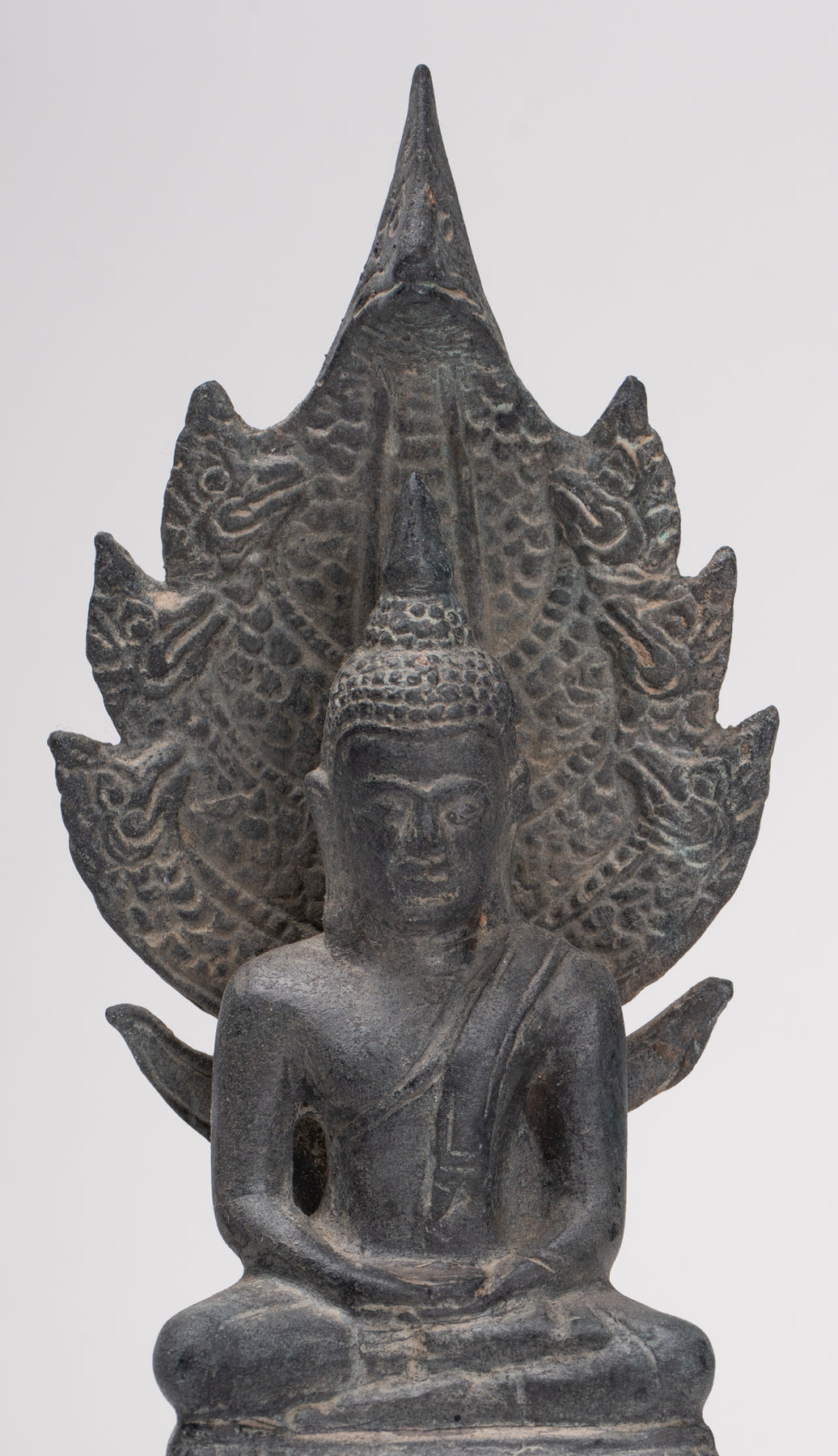 Il Il volto di Buddha irradia pace e dolce introspezione, con caratteristiche morbide e naturalistiche che catturano sia l'umanità che la trascendenza. La sua testa è coronata da un disegno finemente dettagliato Ushnisha, caratteristico del raffinato Stile Sukhothai, che significa conoscenza spirituale e illuminazione. Il forma di serpente è abilmente modellato, simmetrico e dignitoso, le sue scaglie intricate e le teste in bilico incarnano forza e devozione.