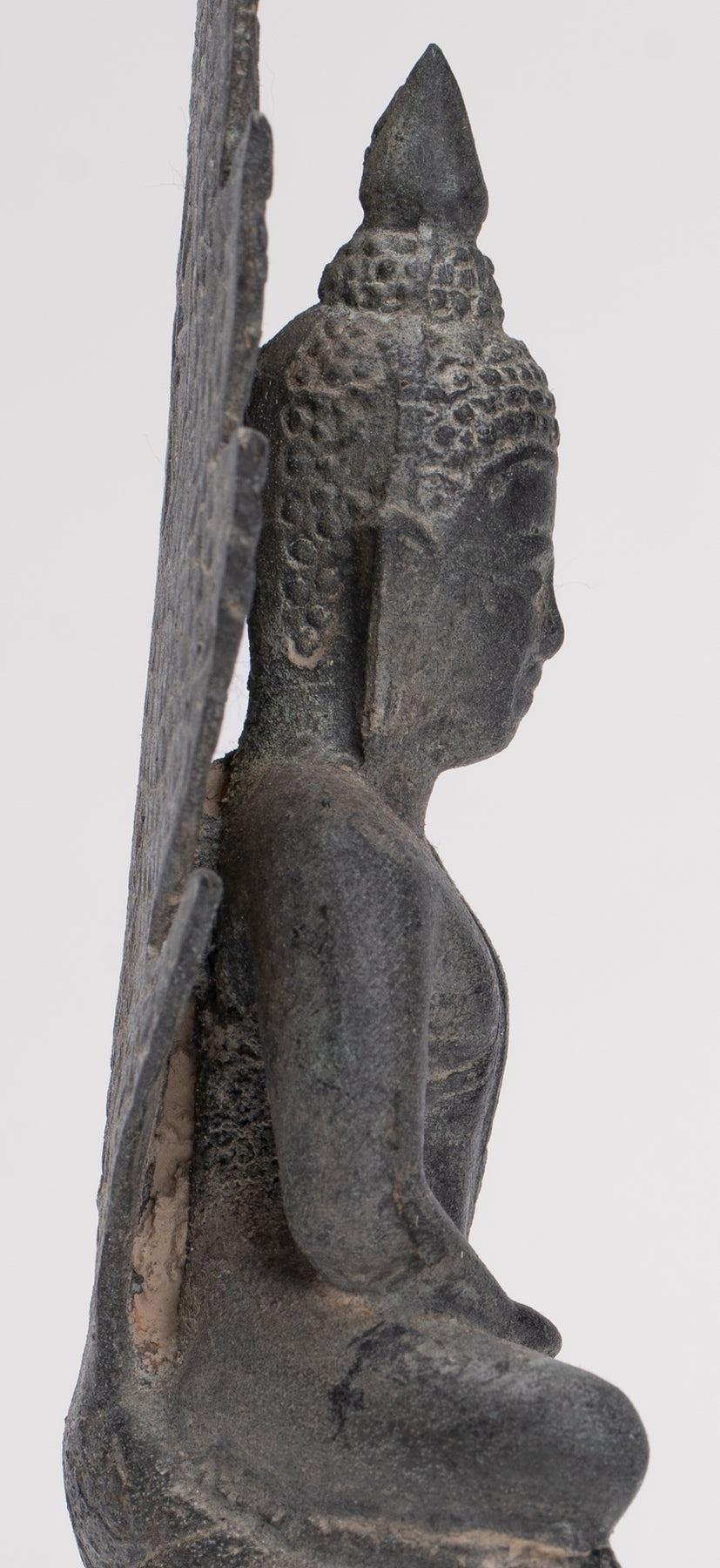 Un oggetto d'antiquariato Buddha Muchalinda in stile Sukhothai, reso in bronzo ed emanante quieta maestosità, raffigura l'Illuminato in profonda meditazione, riparato da Muchalinda, il re serpente. Il Buddha è seduto serenamente su a trono a tre livelli, composto dal corpo attorcigliato del serpente, mentre le maestose teste svasate dei Naga si alzano protettivi dietro di lui, creando un'aura di tutela divina. Le sue mani riposano con grazia nel Dhyana Mudra—il gesto della meditazione—che simboleggia la perfetta compostezza e la tranquillità interiore.