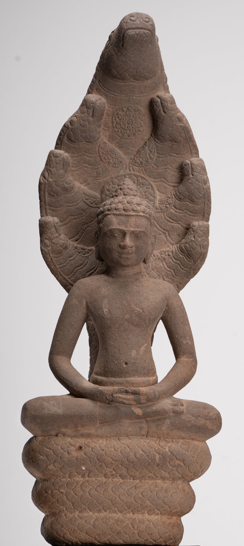 Un antico Buddha di meditazione in stile Dvaravati, seduto su un trono a tre assi, con la testa svasata di un gigante Naga, il re serpente Muchalinda, che si alza in modo protettivo dietro.