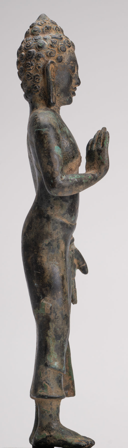 La civiltà Mon Dvaravati, che prosperò dal VI all'XI secolo in alcune parti dell'attuale Thailandia, servì da crocevia culturale. Le influenze delle culture indiana, khmer e mon confluirono, dando origine a una tradizione artistica unica che trovò espressione nella scultura, nell'architettura e nelle pratiche religiose. Questo stile di statue di Buddha incapsula questa confluenza culturale, riflettendo la sintesi di diverse influenze.