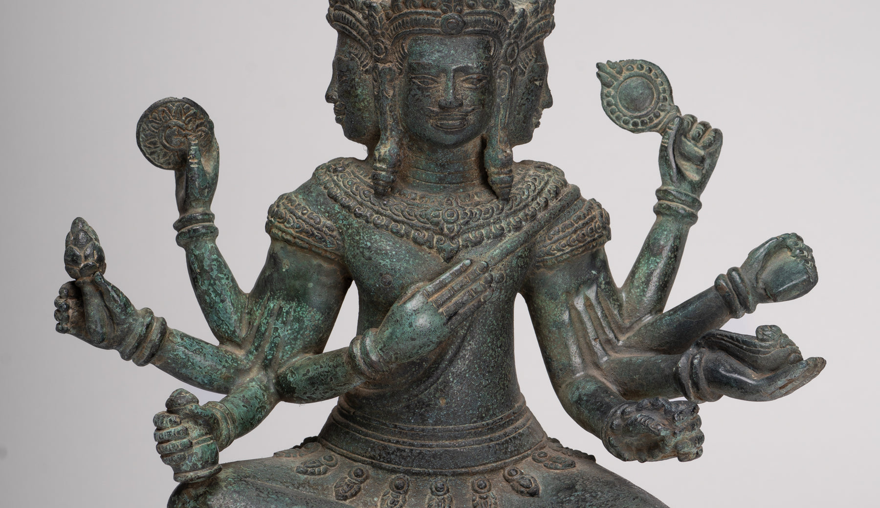 Diese dreidimensionale Khmer-Darstellung von Brahma ist stilistisch eng mit Skulpturen verwandt, die im Bayon-Tempelkomplex im Westen gefunden wurden Kambodscha. Er trägt traditionellen Khmer-Schmuck, darunter kunstvolle Ohrringe und eine reich verzierte Mukuta (Krone).