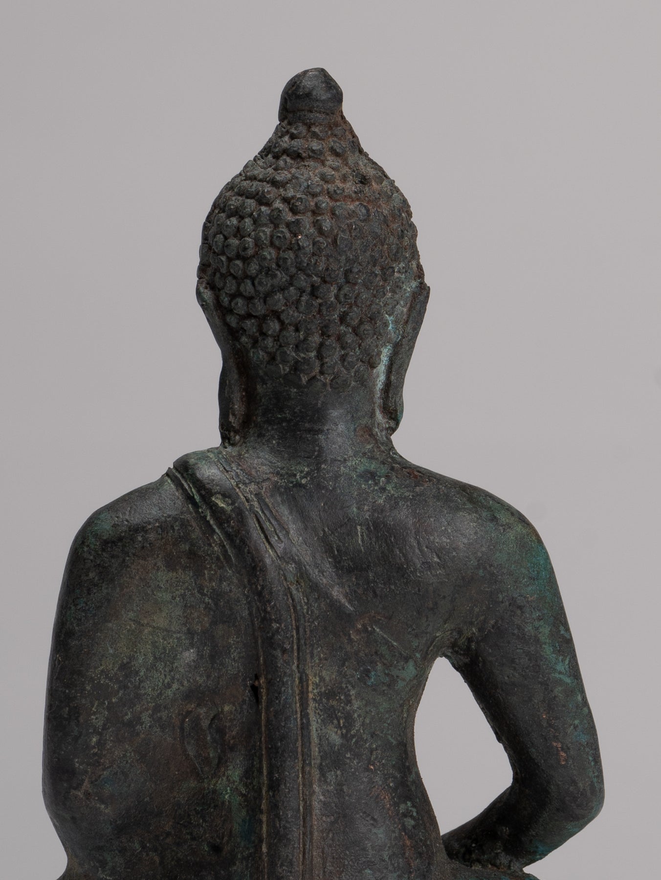 Wie traditionell wird der Meditationsbuddha hier in einer sitzenden Haltung dargestellt, wobei beide Beine in der Halb-Lotus-Position gekreuzt werden. Die Hände befinden sich in der Dhyana Mudra, wo die rechte Hand auf der linken Hand ruht, wobei die Daumen sanft berührt und ein subtiles Dreieck oder Kreis bilden. Der Rücken des Buddhas ist gerade und der Blick wird gesenkt, was eine tiefe Konzentration und innere Reflexion bedeutet.