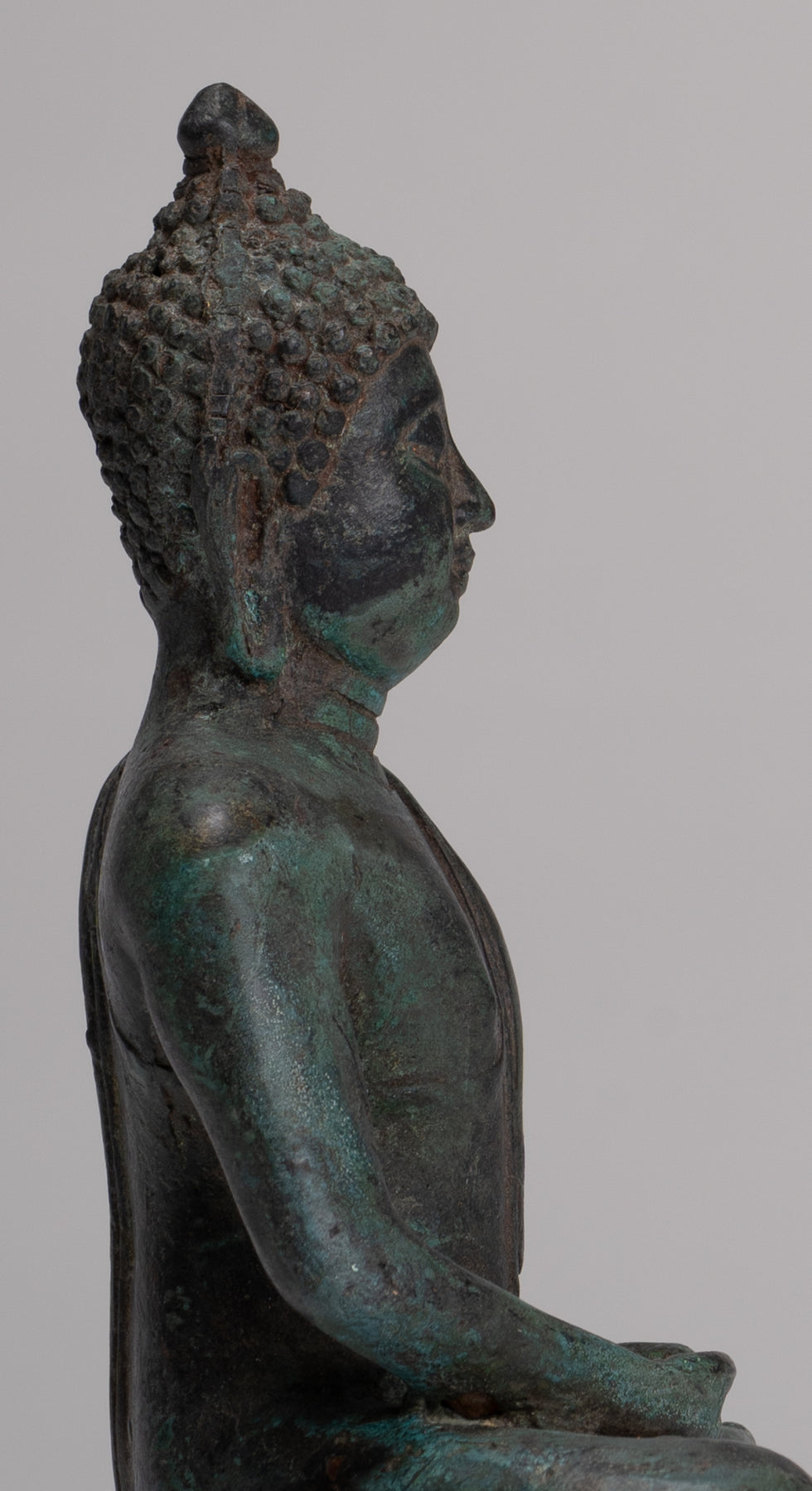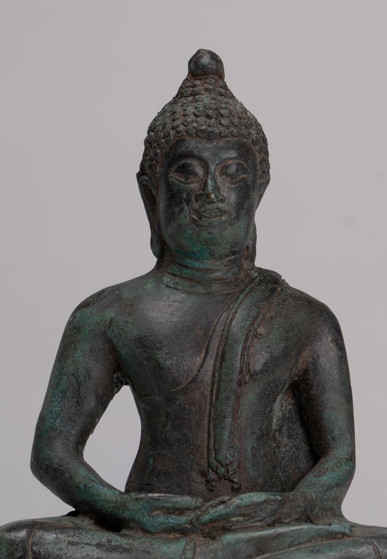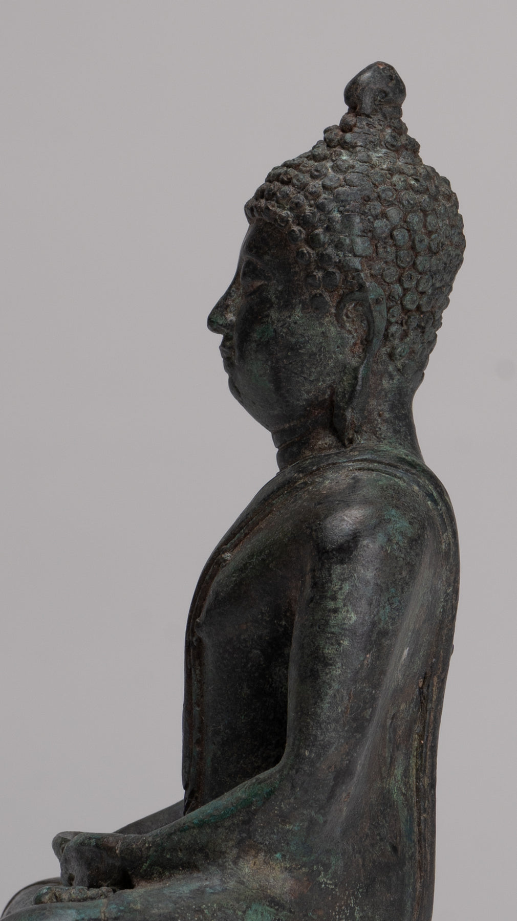 Das Casting ist schön, wie Sie in den feinen Details des Gesichts sehen können. Jedes Detail wird perfekt gemacht. Die unverwechselbare Patina des Stücks ist ebenfalls besonders entzückend. Dieses traditionelle Aussehensstück verleiht Ihrem Zuhause, Büro oder heiligen Raum mit Sicherheit Gelassenheit.