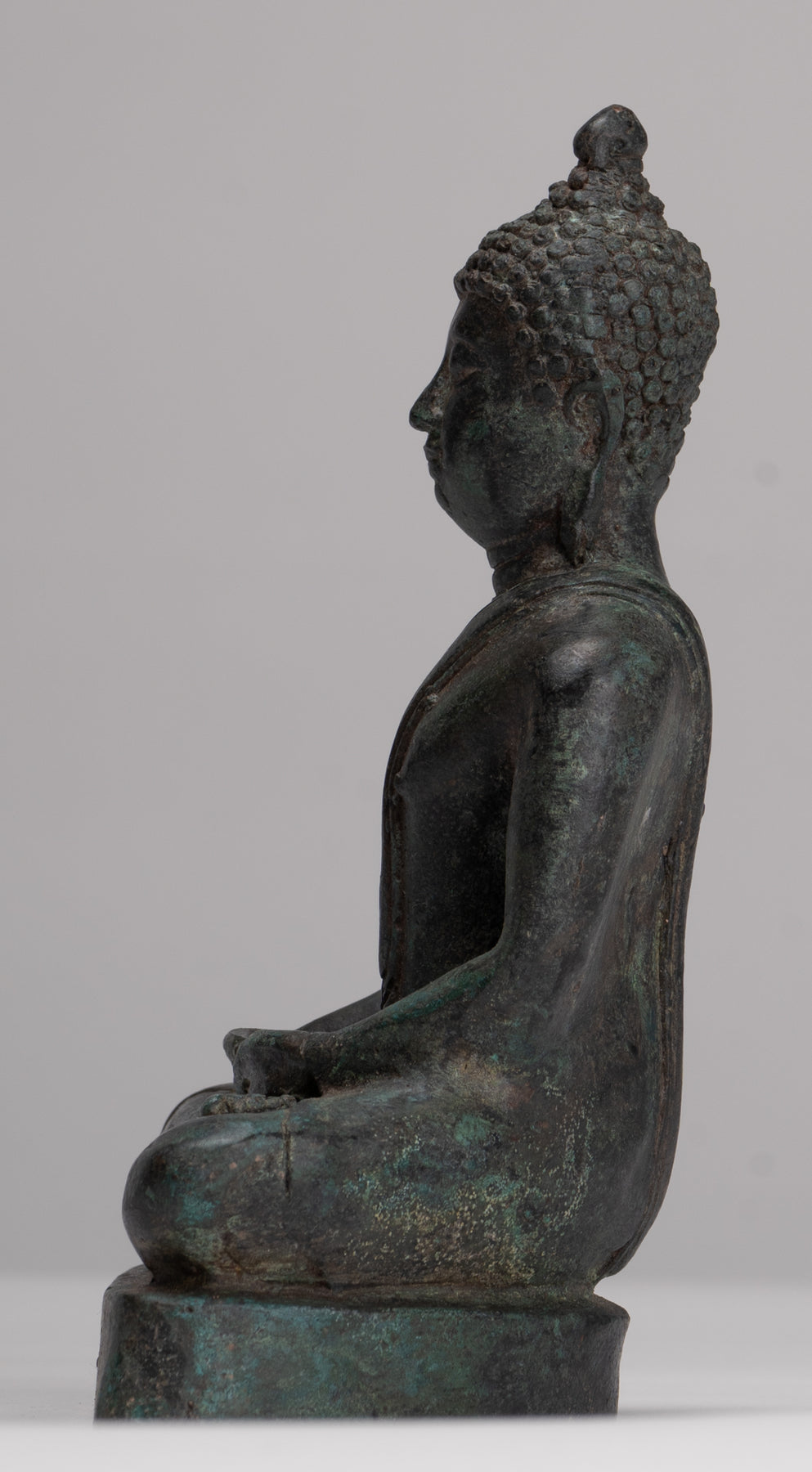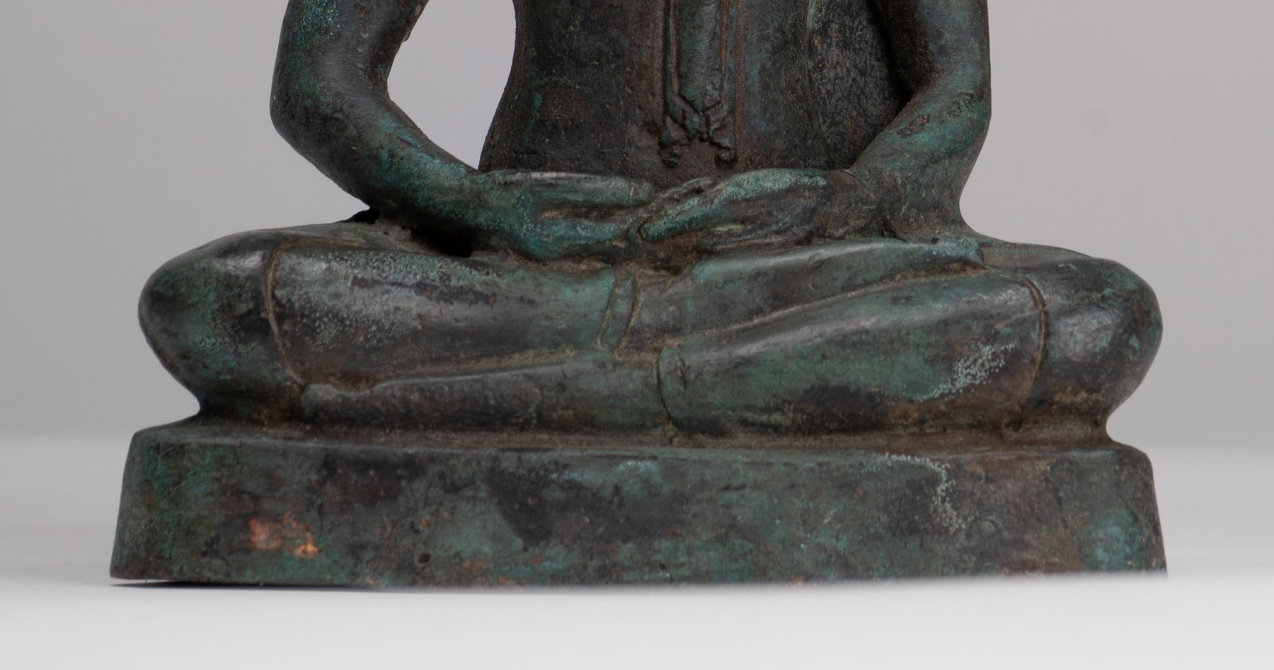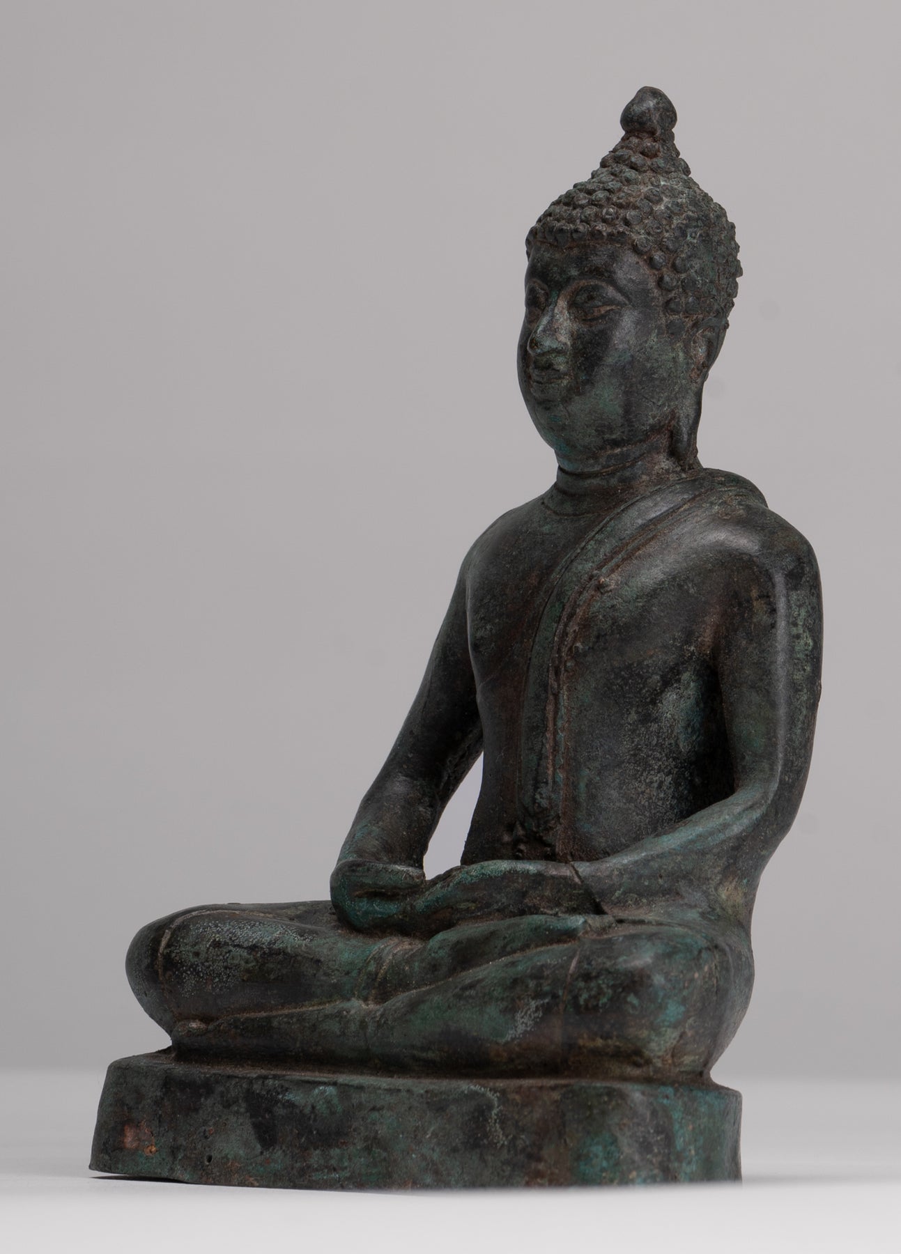 Der Buddha sitzt auf einem einfachen Sockel in der Dhyana Mudra oder der „Meditationsposition“. Diese Handgeste fördert die Energie der Meditation, die tiefe Kontemplation und die Einheit mit höherer Energie.