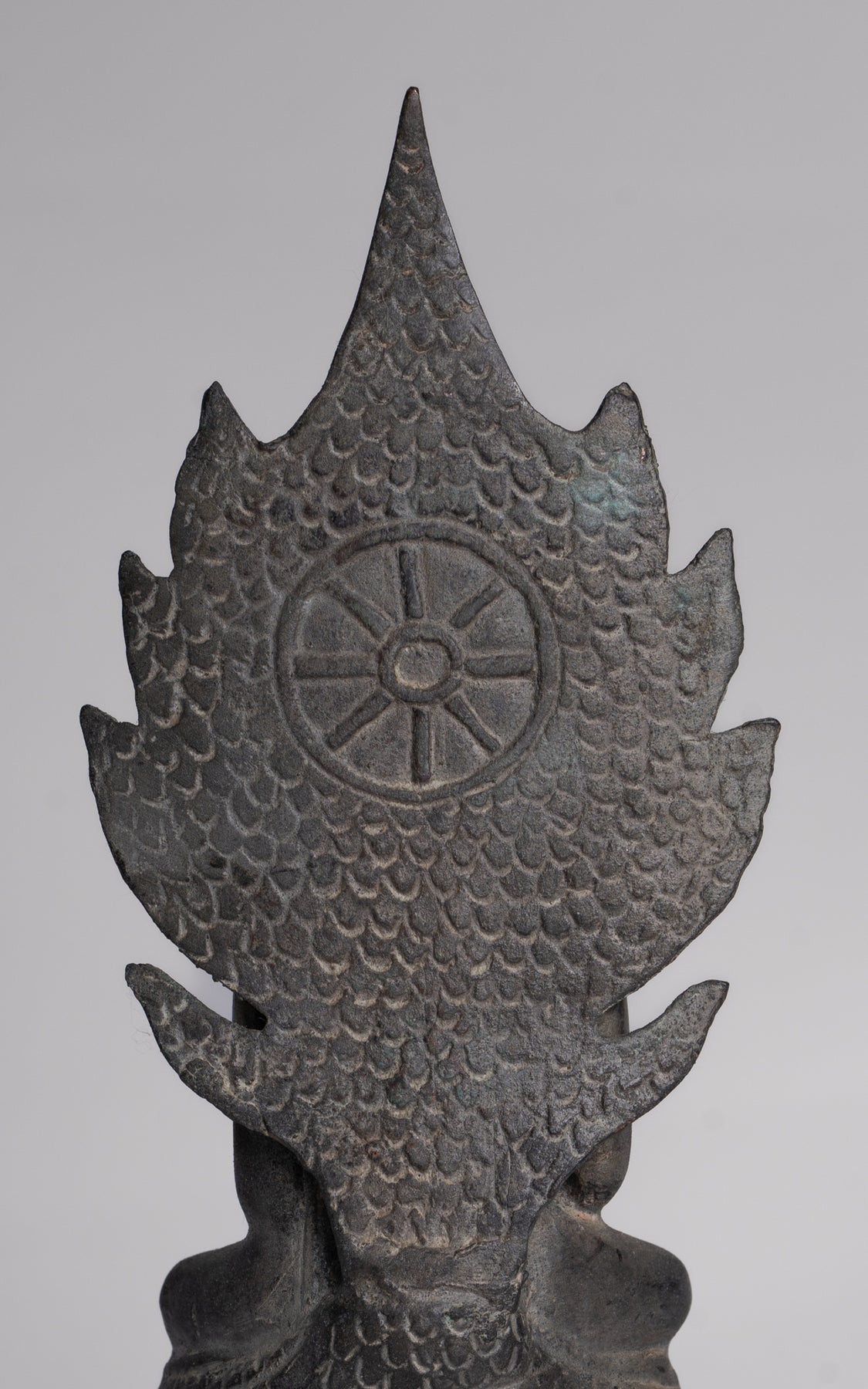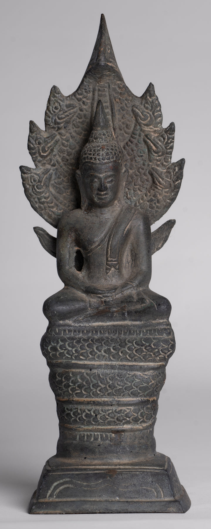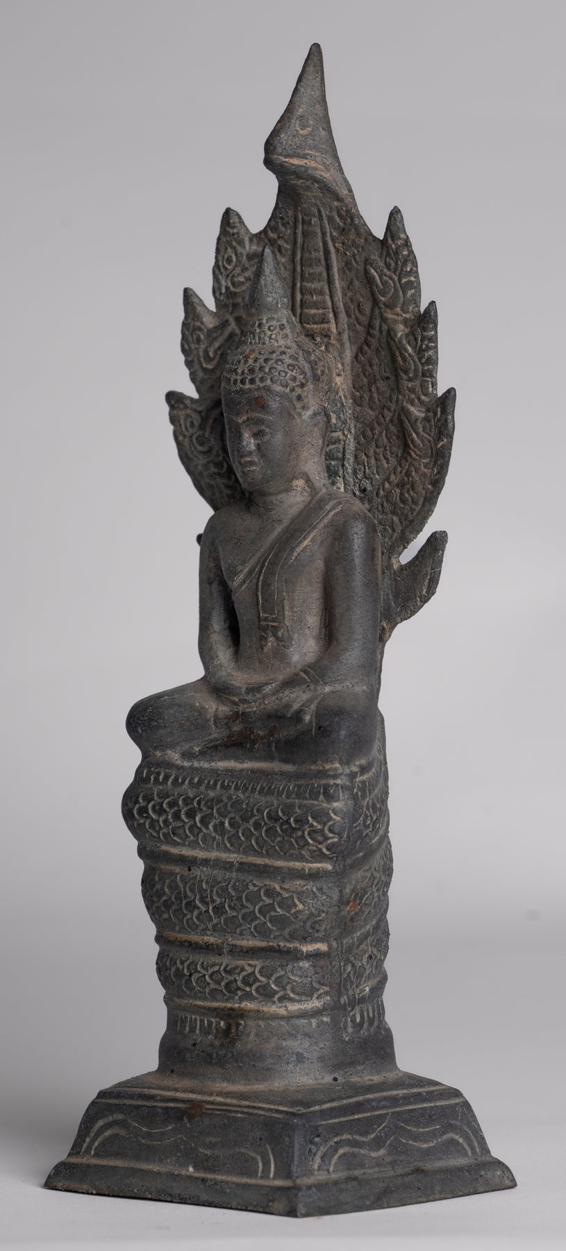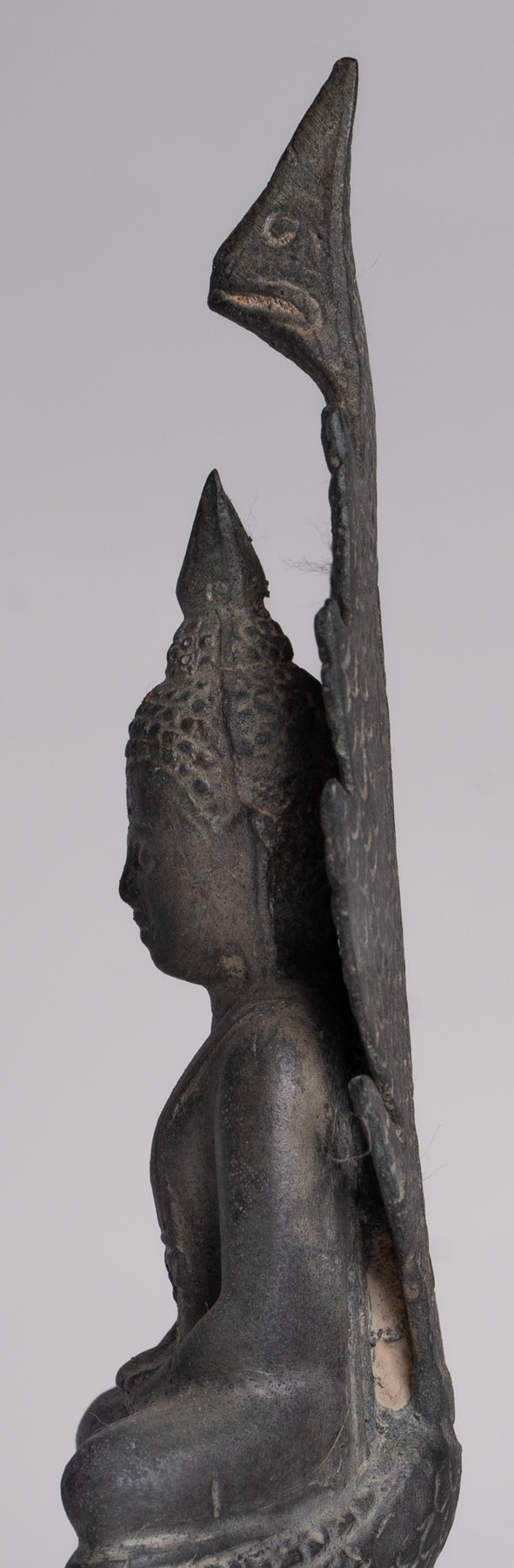• Antike meditierende Naga-Buddha-Statue aus Bronze im Sukhothai-Stil – 21 cm.