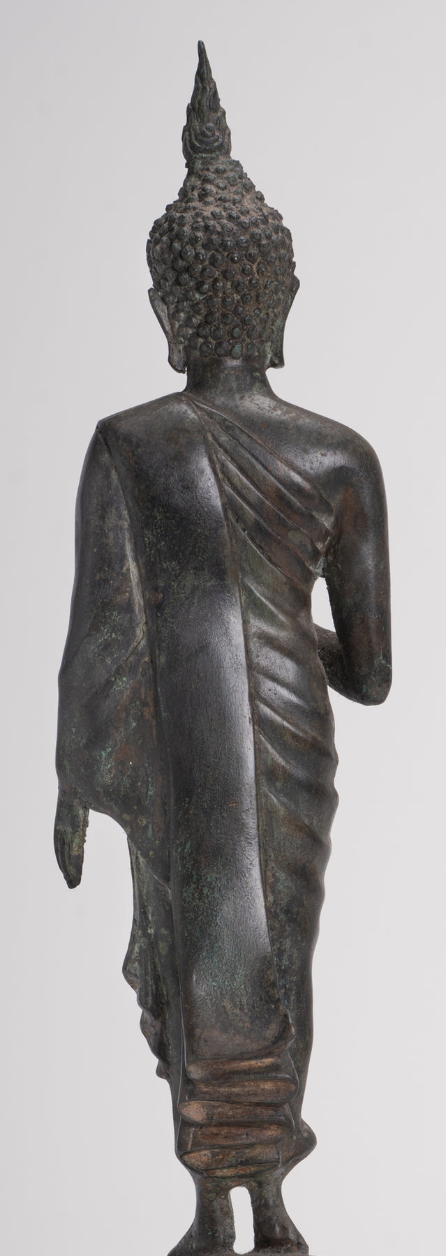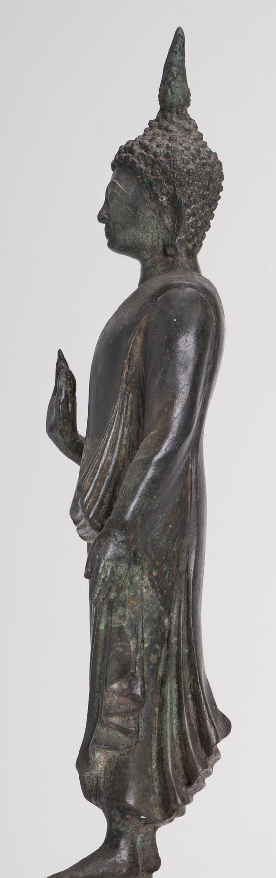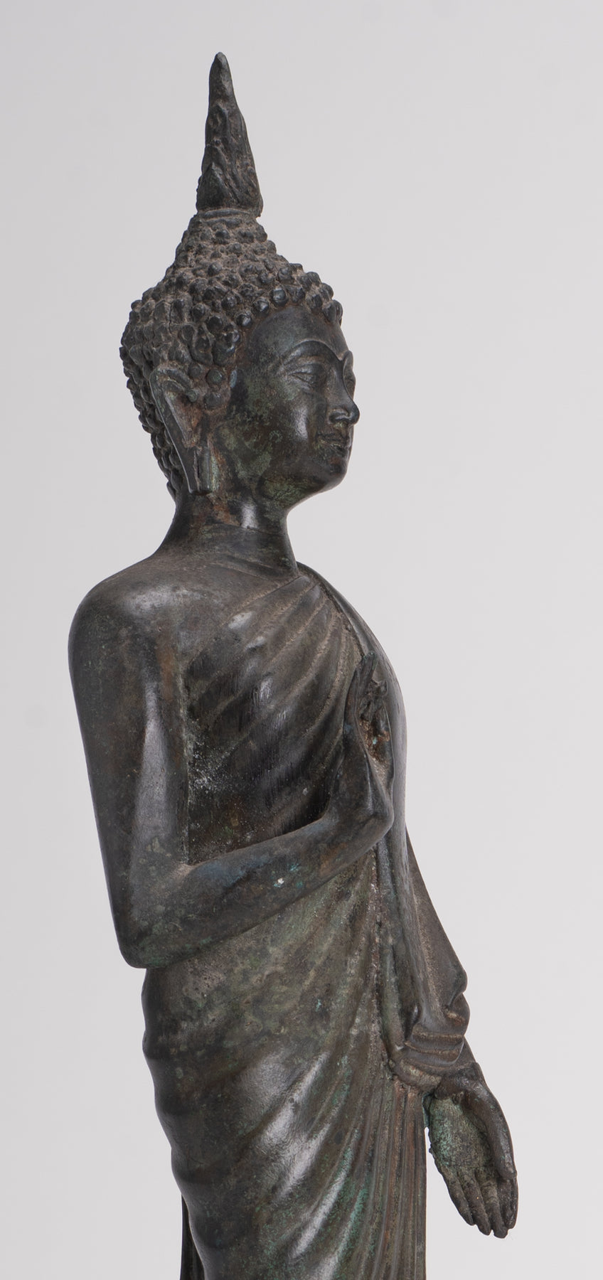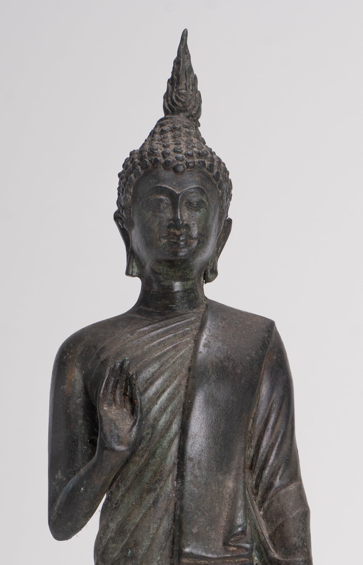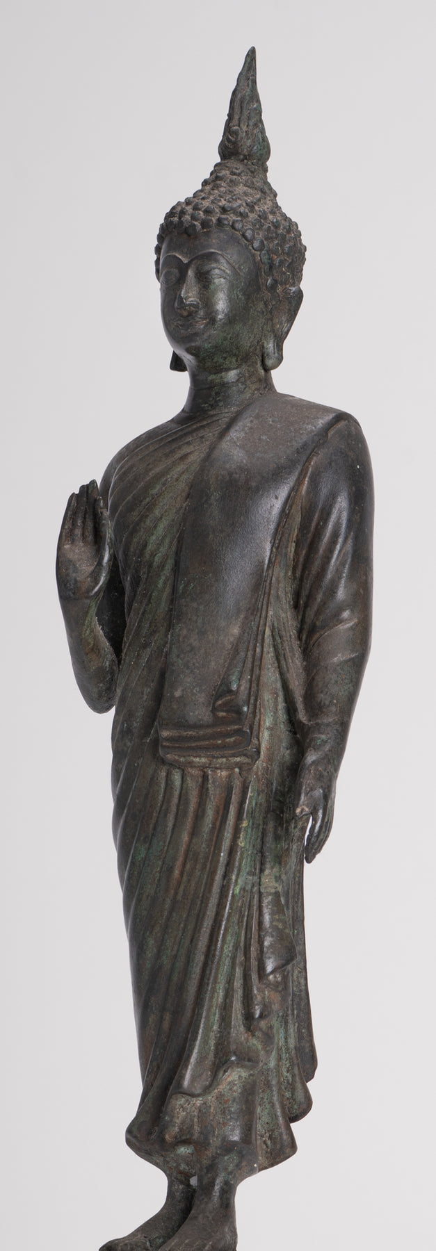 Der Lord Buddha steht im Abhaya oder Schutzmudra auf einem Lotusblattsockel. Der große flammenförmige Ushnisha-Vorsprung auf seinem Kopf im Sukhothai-Stil symbolisiert seinen hohen spirituellen Entwicklungsstand.